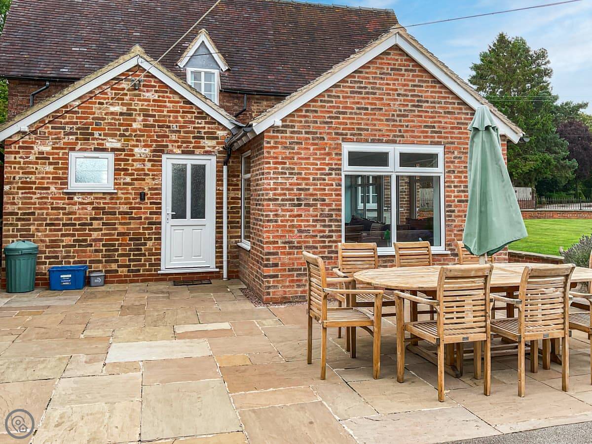 The garden has a lawn and a patio with seating. It looks out over fields.