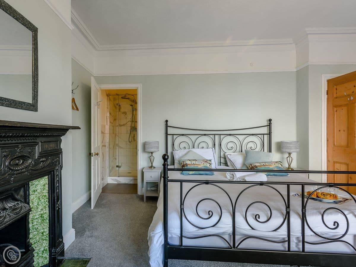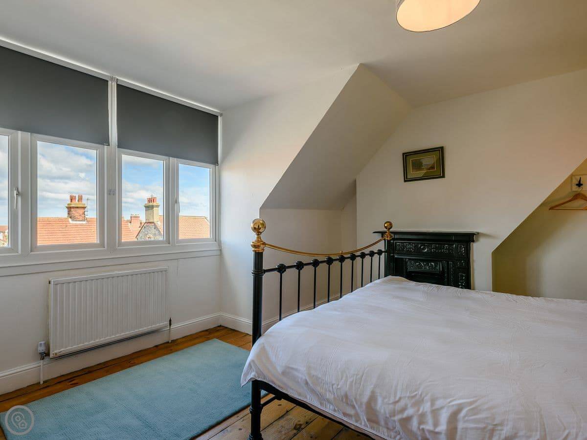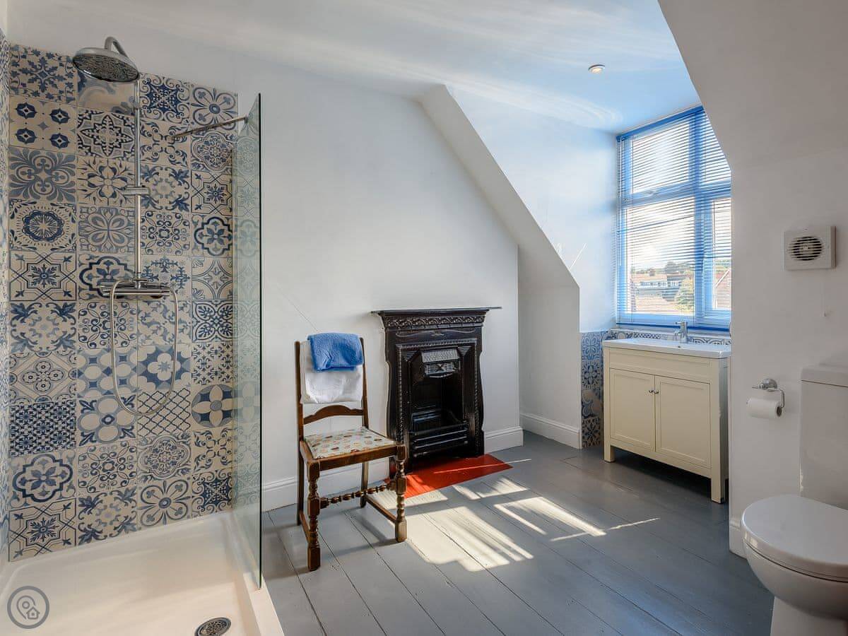 It's got six bedrooms and four bathrooms. Three of the bedrooms are en-suite. Two rooms on the top floor have a view of the sea. The rating is 5 Star, which means it's well-equipped and comfortable. The owner has kept furniture light to make the most of the space, so there are hanging rails instead of wardrobes in some rooms.