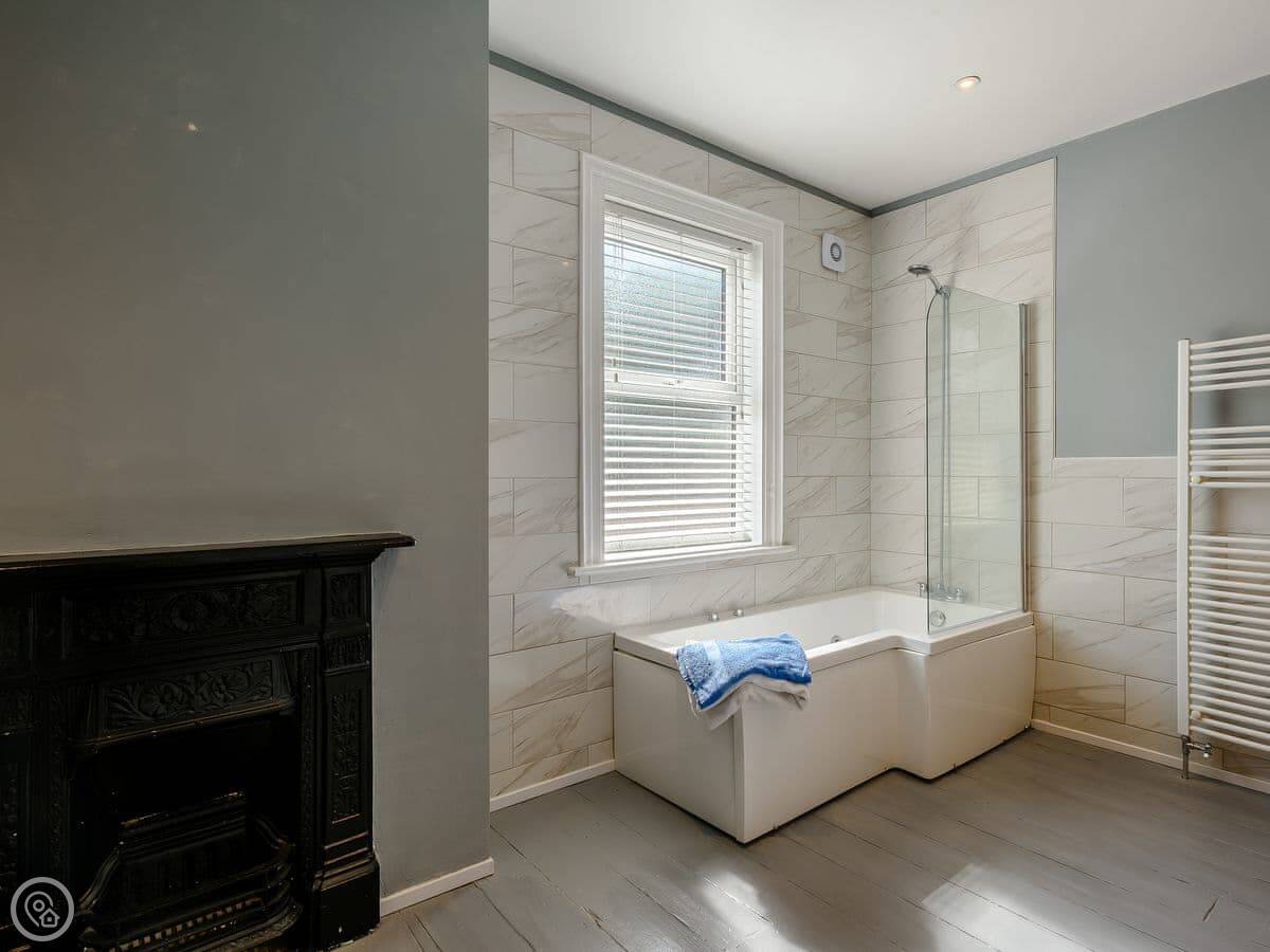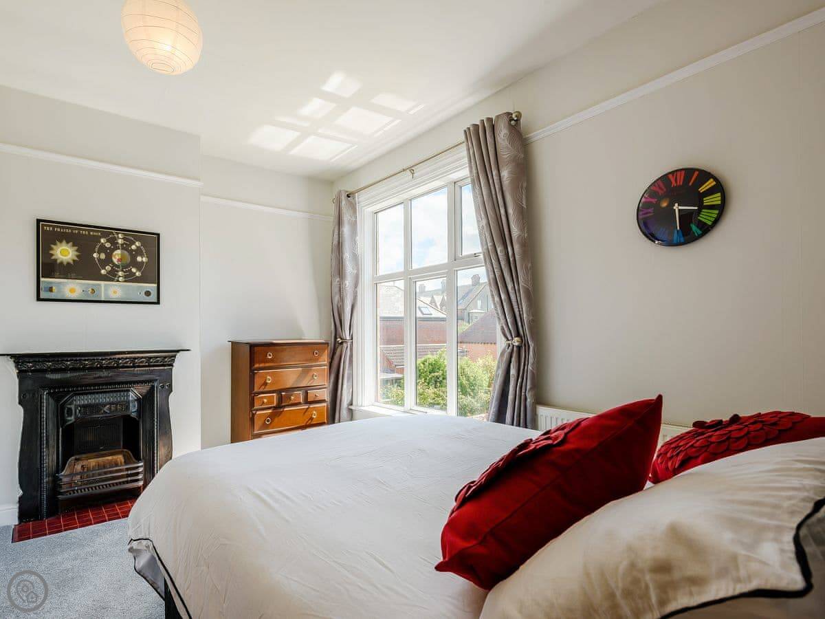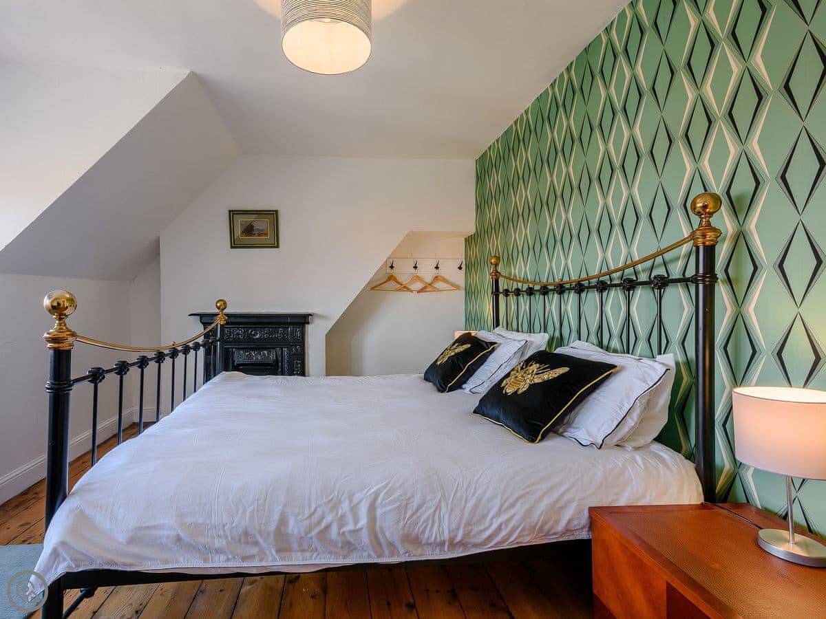 It's got six bedrooms and four bathrooms. Three of the bedrooms are en-suite. Two rooms on the top floor have a view of the sea. The rating is 5 Star, which means it's well-equipped and comfortable. The owner has kept furniture light to make the most of the space, so there are hanging rails instead of wardrobes in some rooms.
