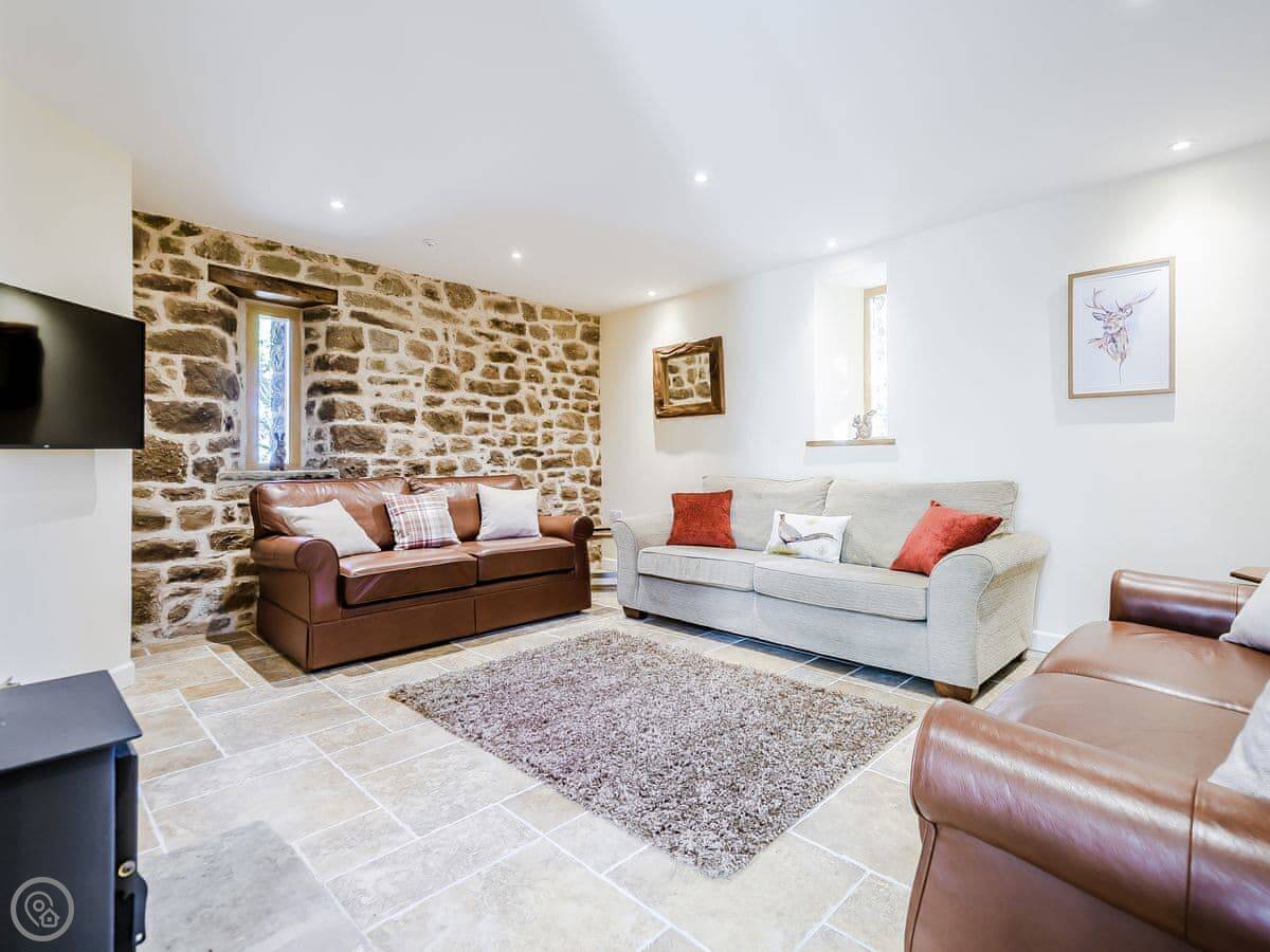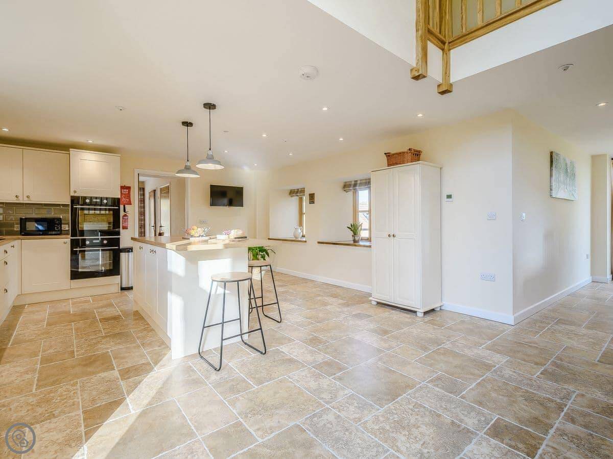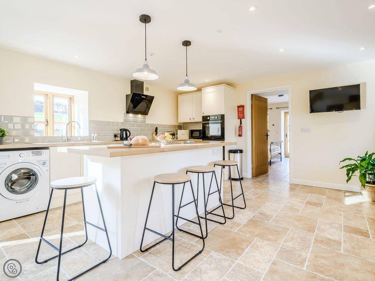 The main living space is open plan. There’s a kitchen with a central island, a dining area with patio doors, and a living room with a wood burner. The stone walls and beams are original. There’s a Smart TV in the living room and one in an upstairs twin bedroom.