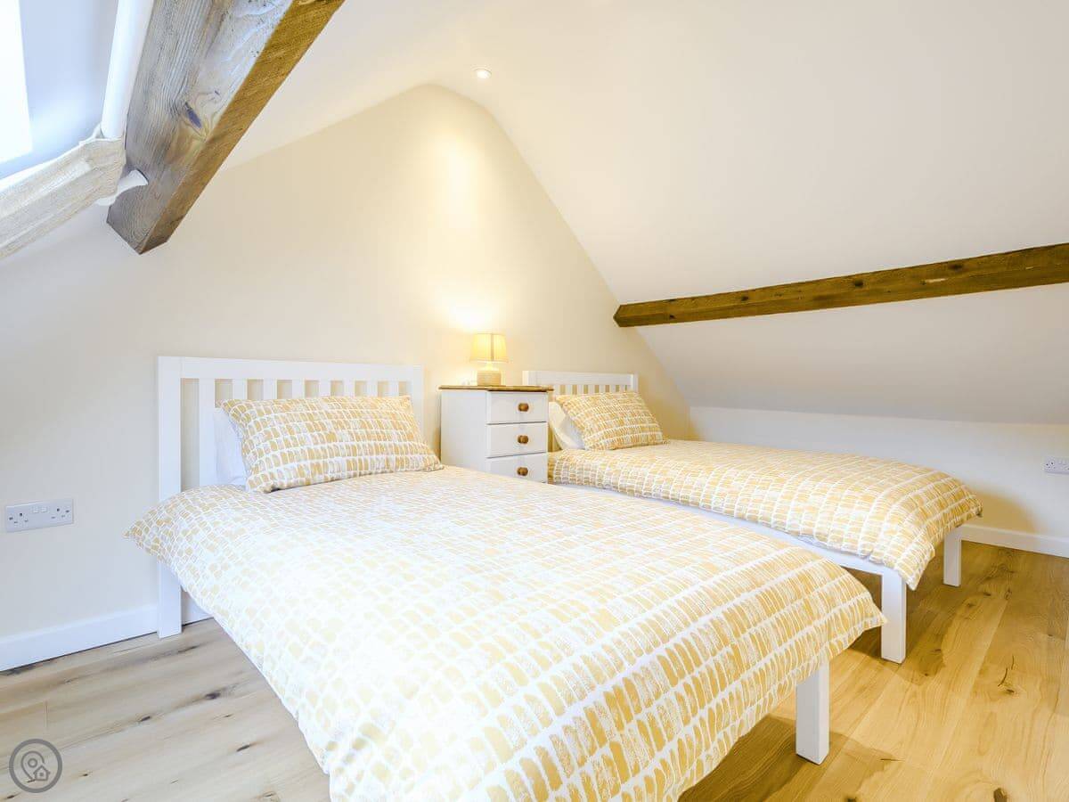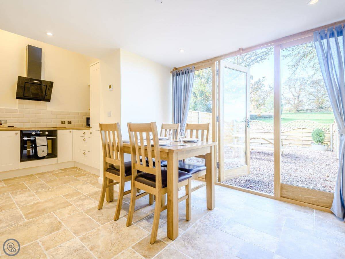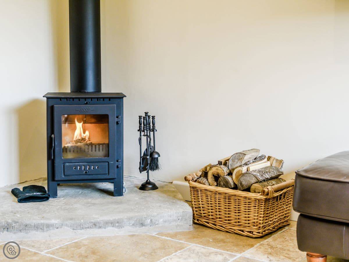 Downstairs is open plan kitchen and dining area, with doors out to the patio. Separate living room with a wood burner and a TV. The stairs are a typical barn conversion style, so they turn a corner and are a bit steep.