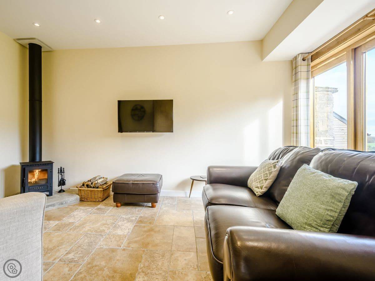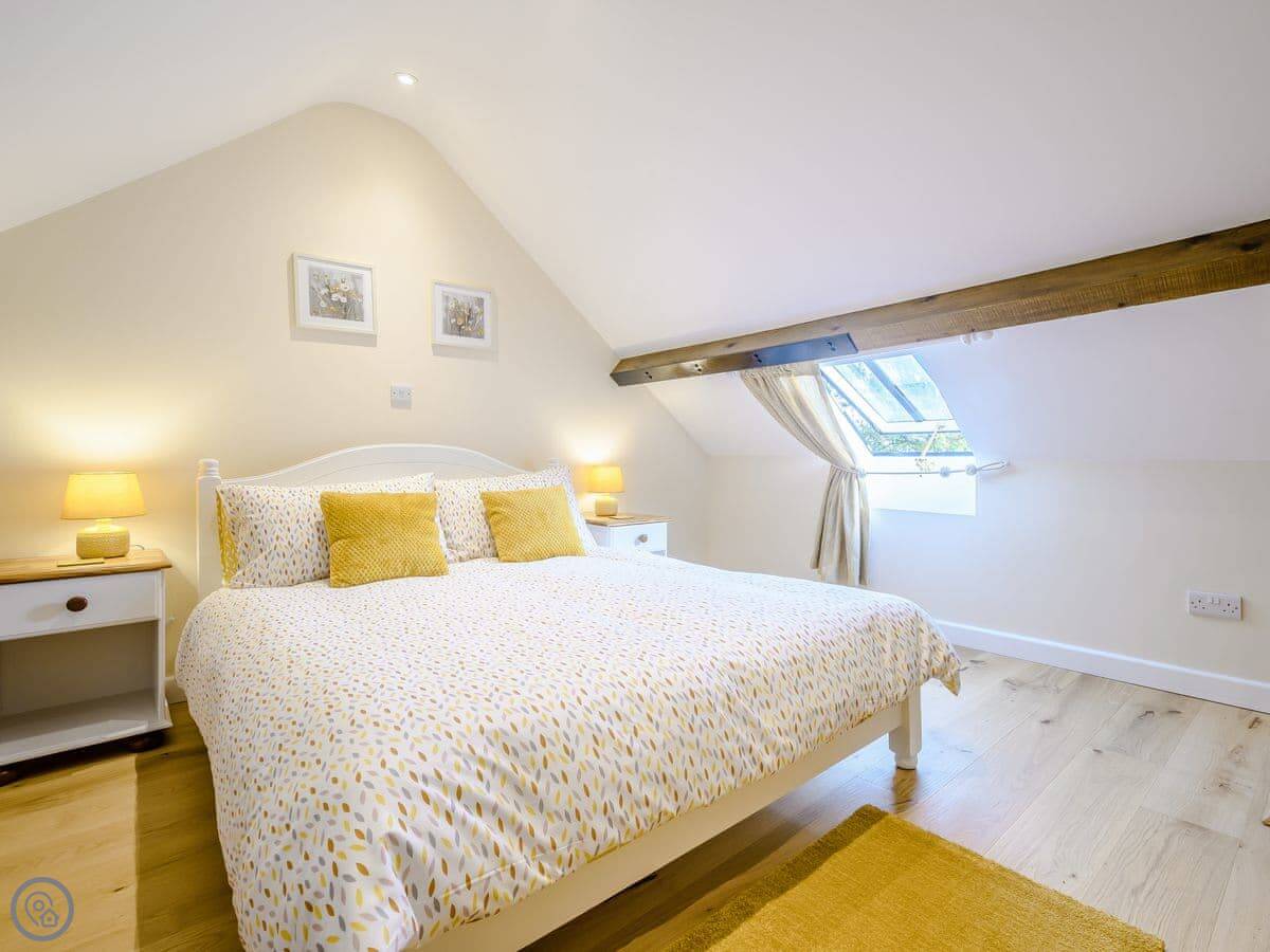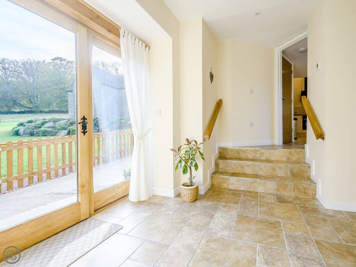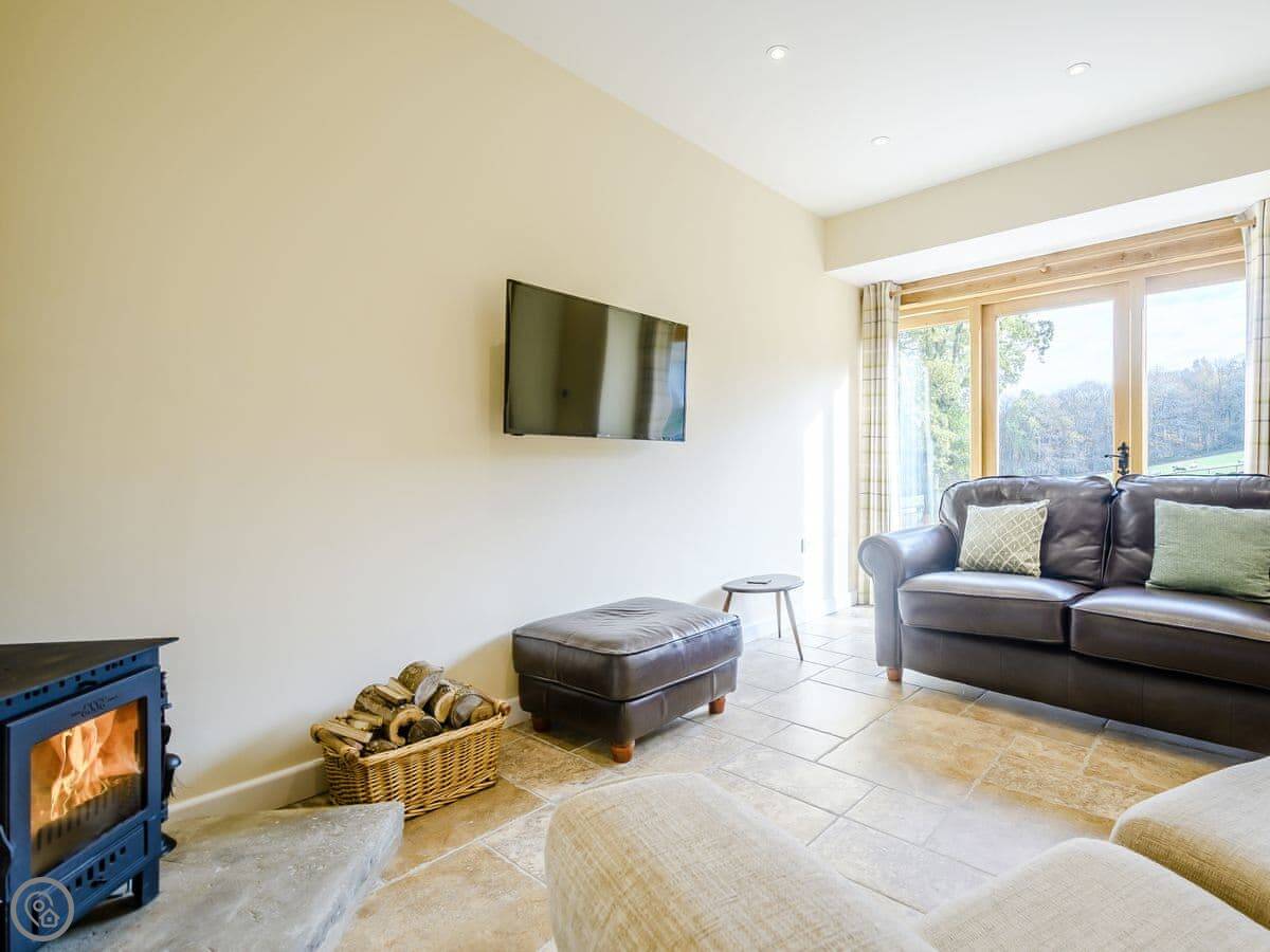 Downstairs is open plan kitchen and dining area, with doors out to the patio. Separate living room with a wood burner and a TV. The stairs are a typical barn conversion style, so they turn a corner and are a bit steep.