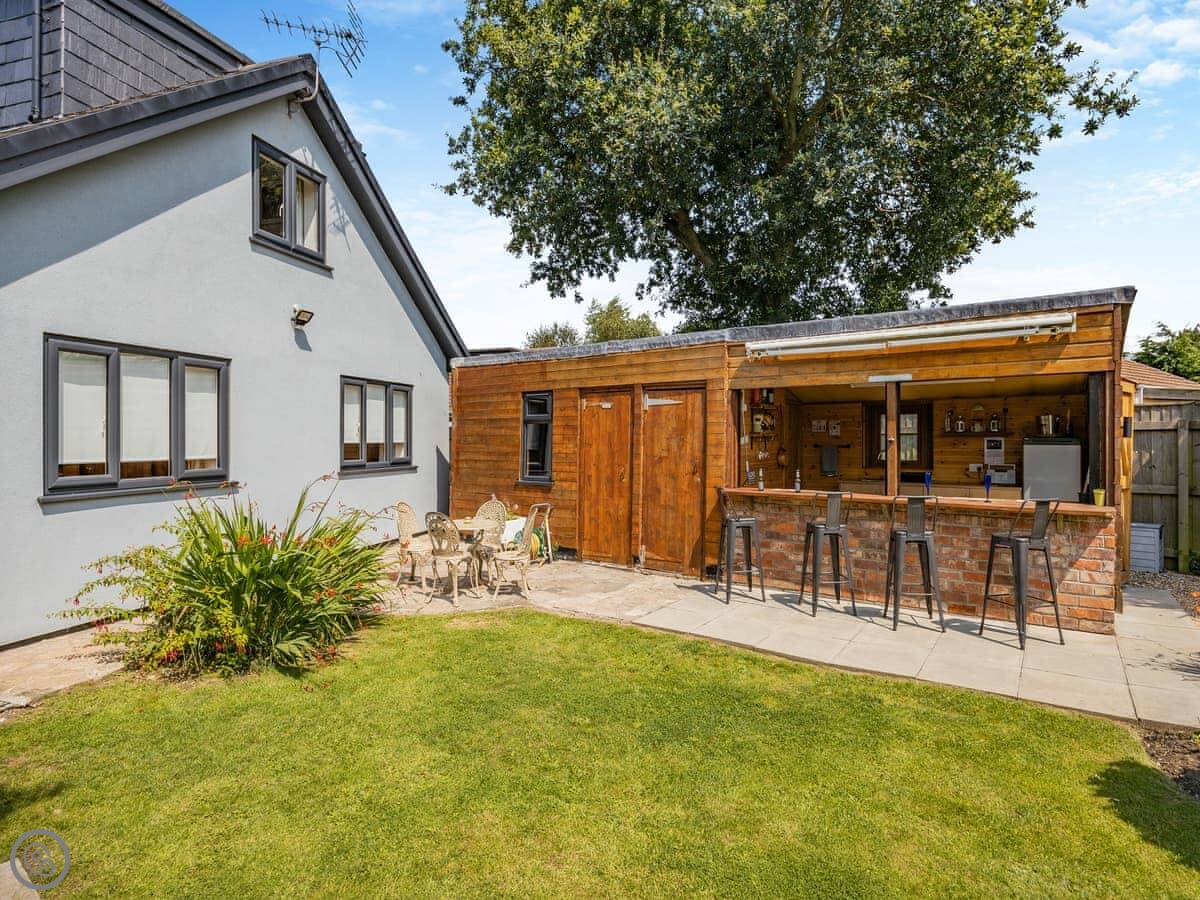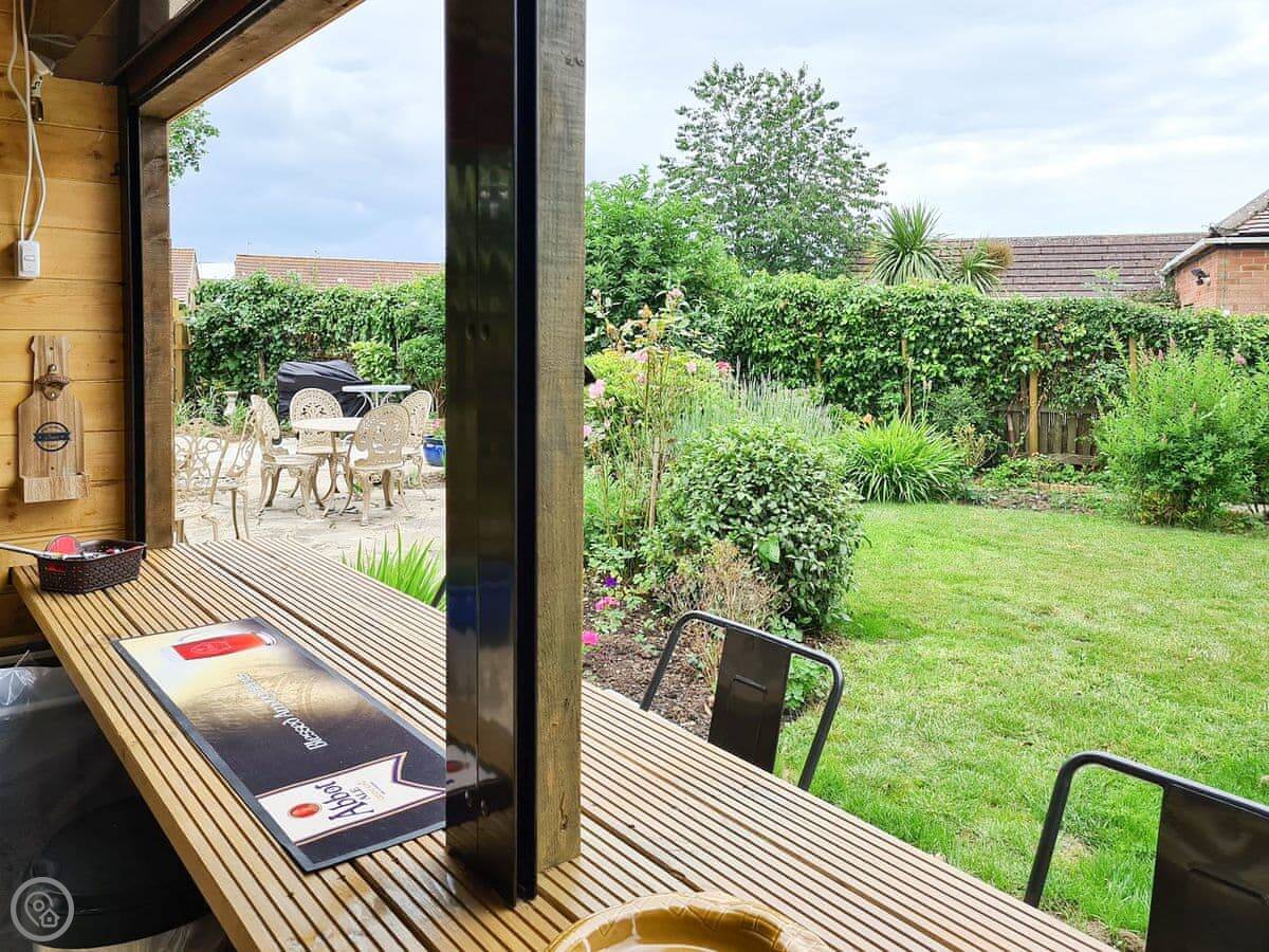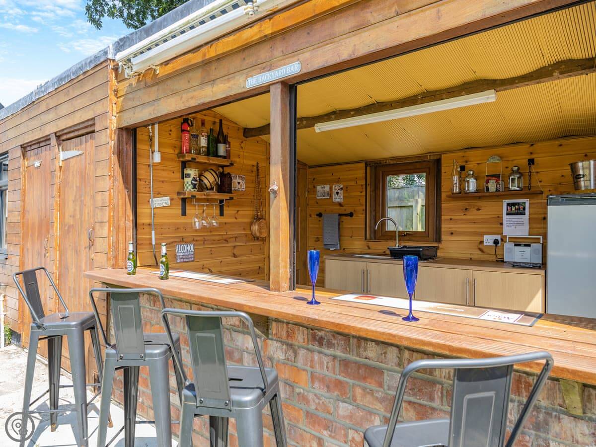 Outside, there's a patio with a big table and benches. There's also a built-in bar area with a counter that folds down, a sink and a little outdoor fridge. It sounds a bit extra, but it's handy if you're grilling. There's a BBQ provided.