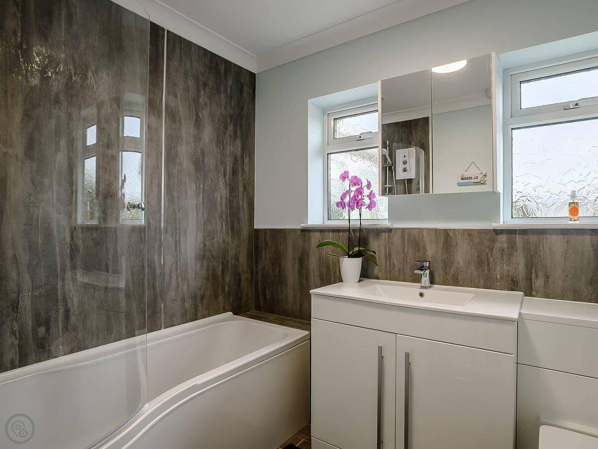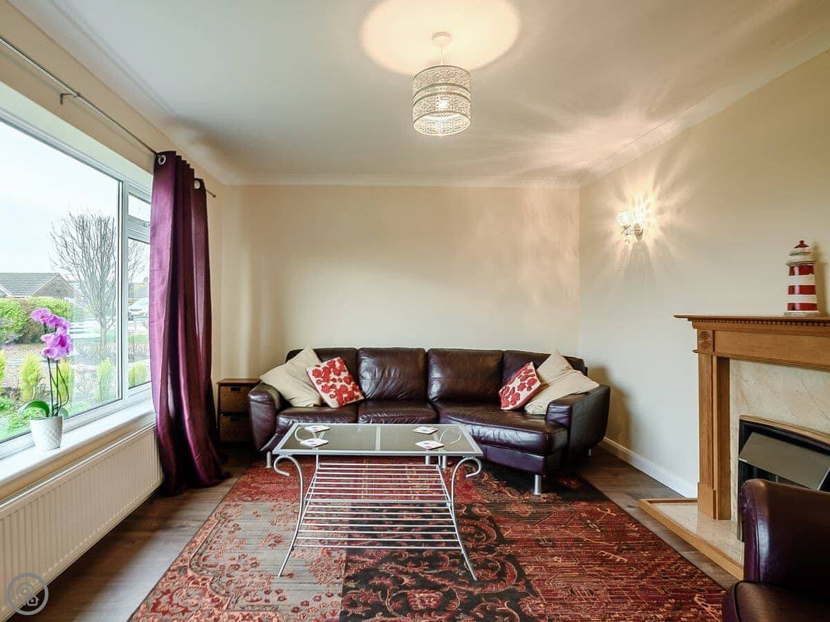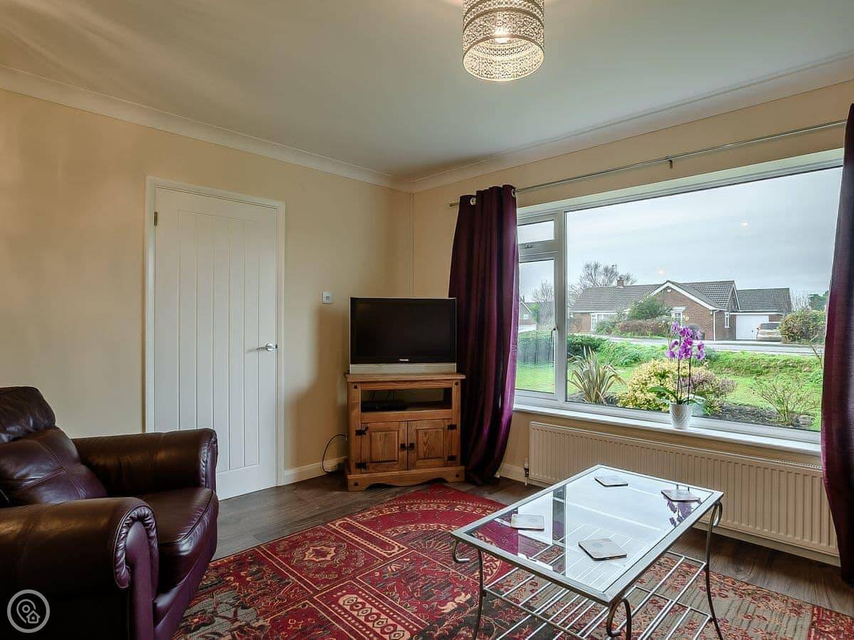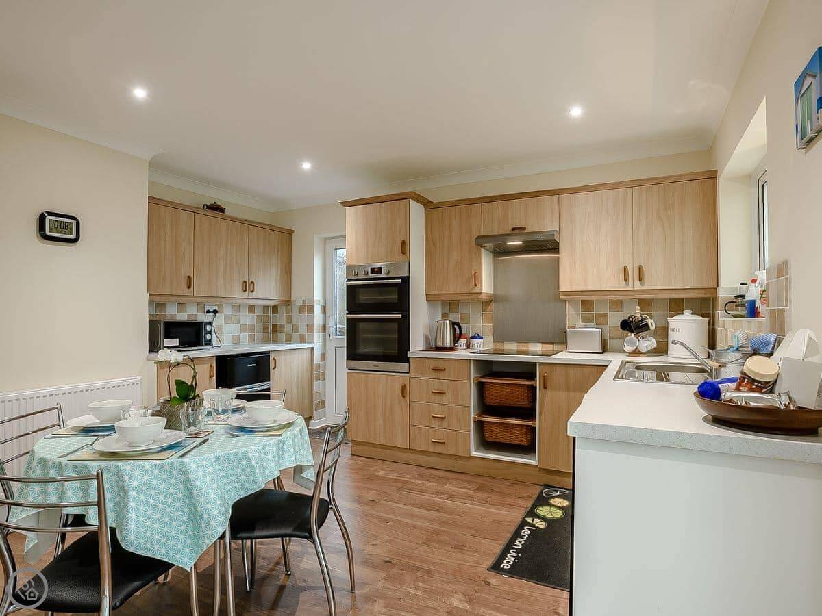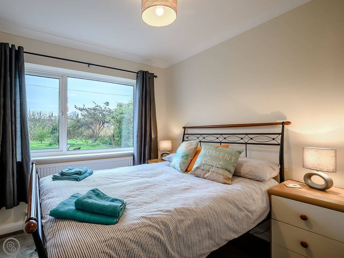 It sleeps four. Two bedrooms, both a good size, and one bathroom. The rating is 4 Star. It's clean, modern, and warm. It's all on one level, so the entrance and the rooms are wheelchair friendly. The doorways are standard width though.