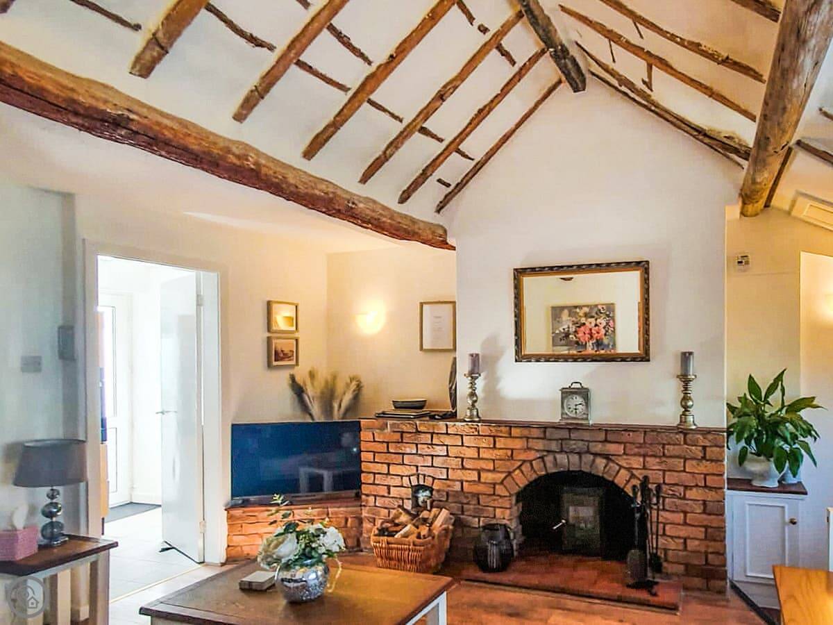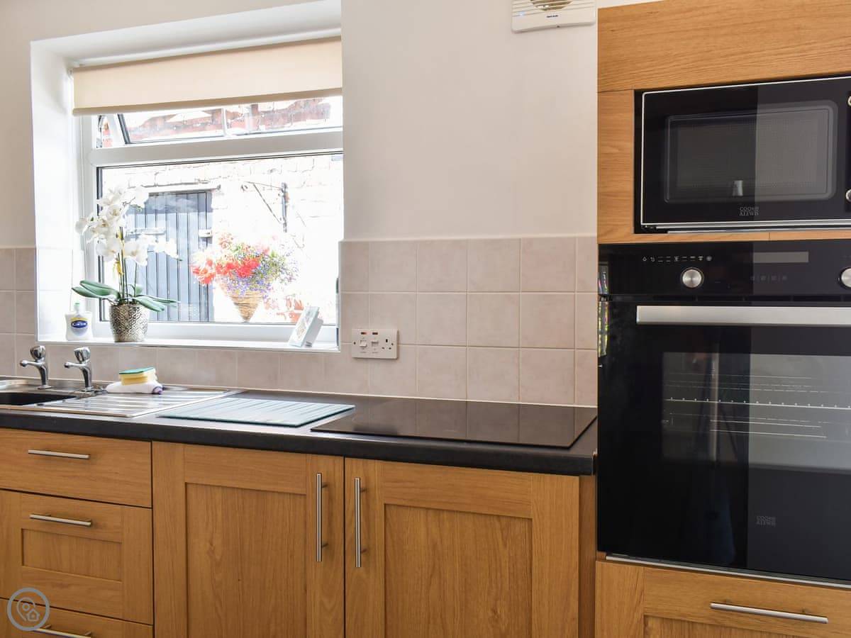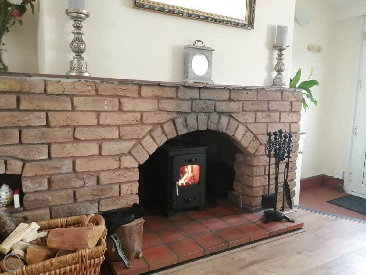 There's a wood burner in the living room. The kitchen has what you need. Outside is an enclosed courtyard garden with a table and chairs.