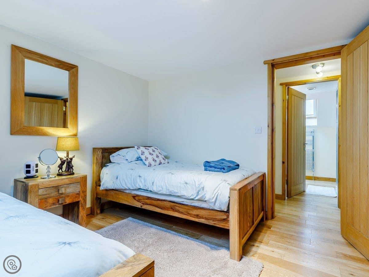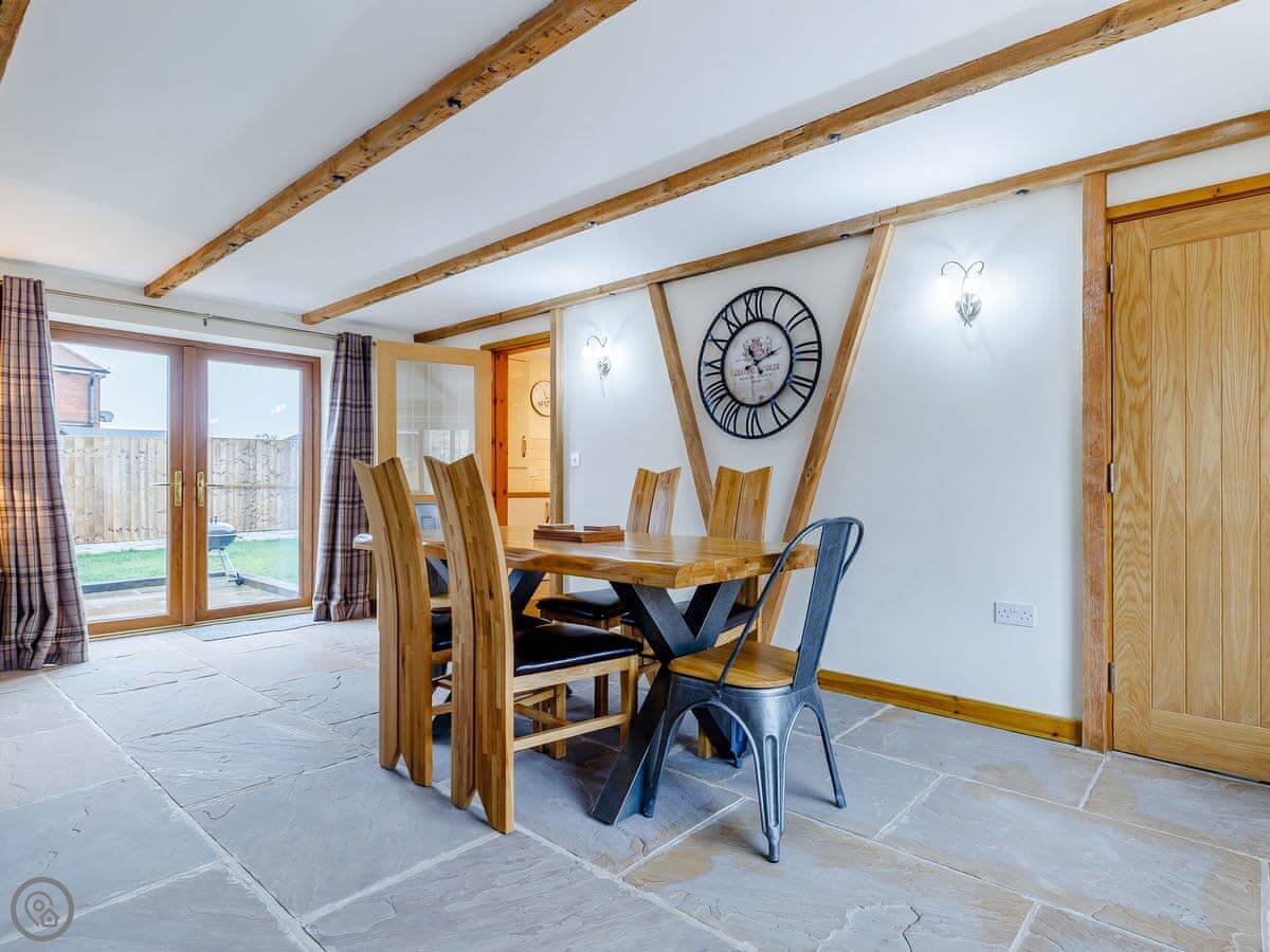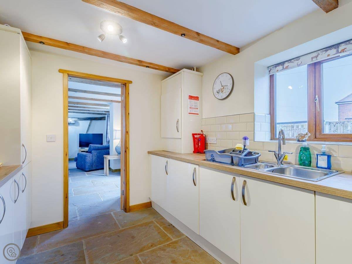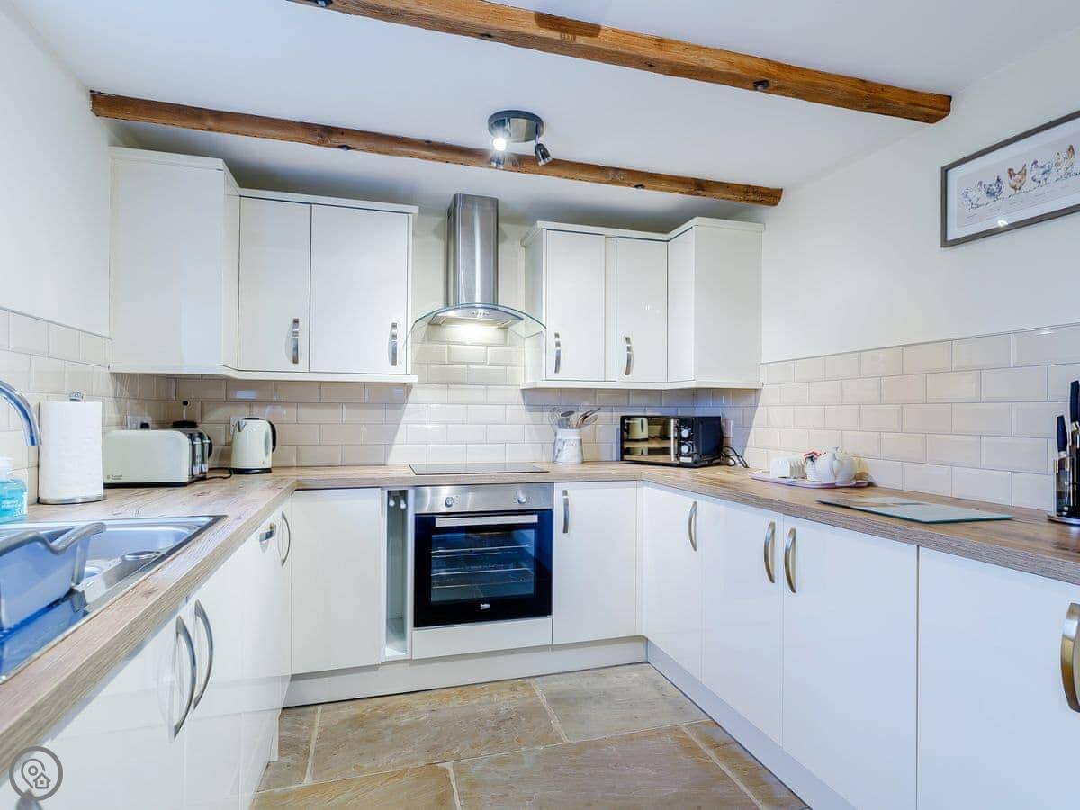 It sleeps six. Two bedrooms, both are doubles, and two bathrooms. One bathroom has a spa bath. It's got a 5 Star rating, which means it's well finished and everything works properly. The beams are original and quite low in the kitchen, so watch your head if you're tall.