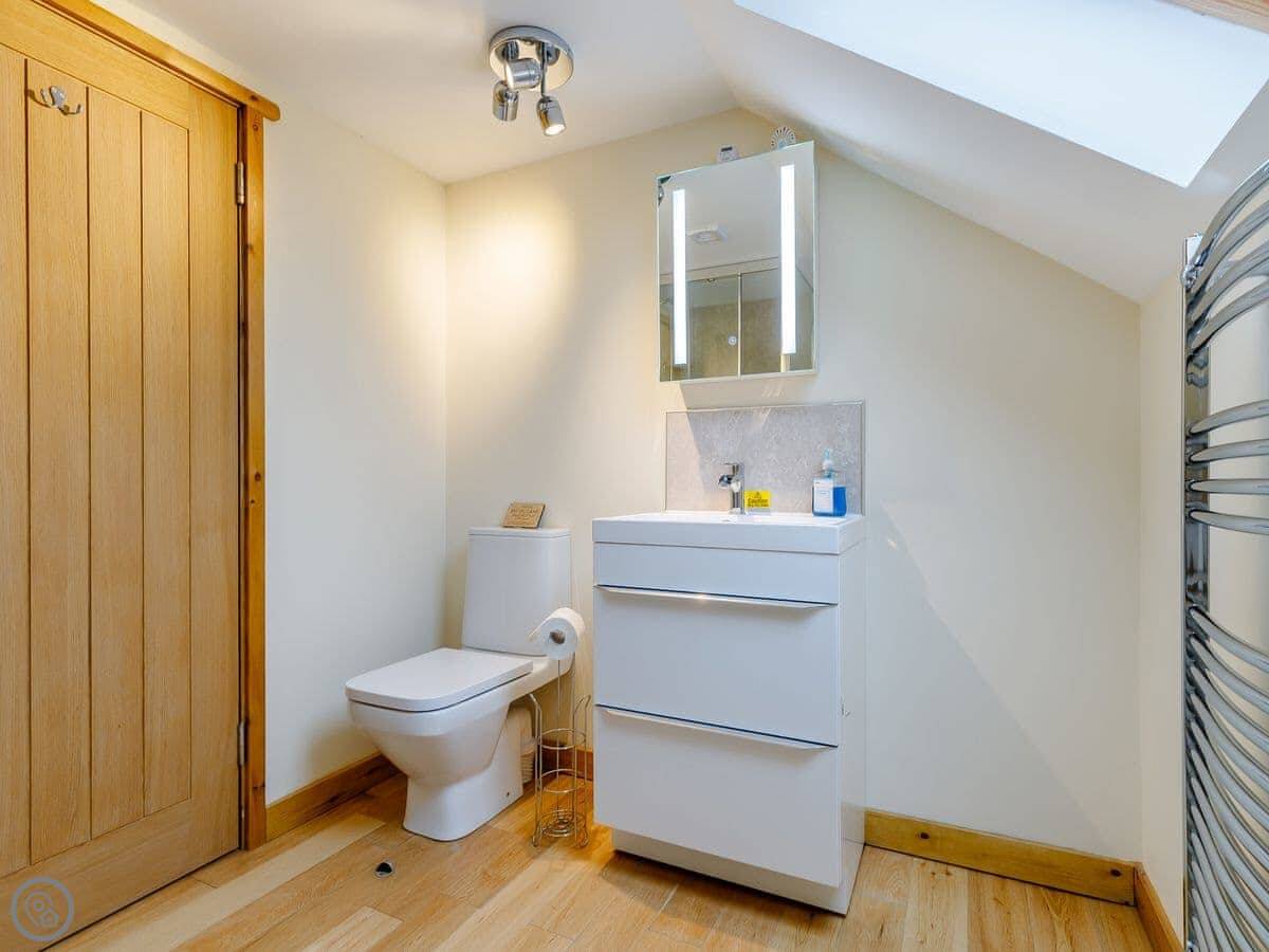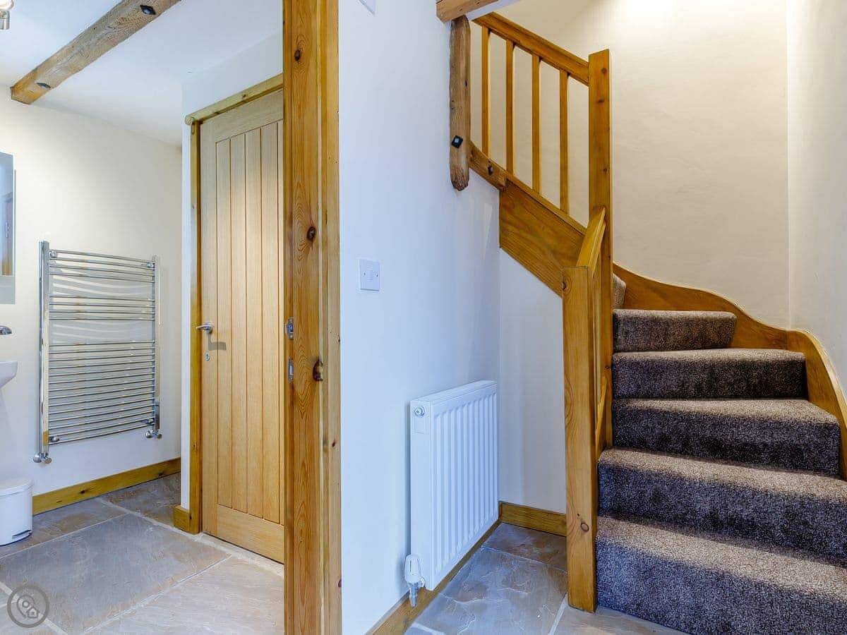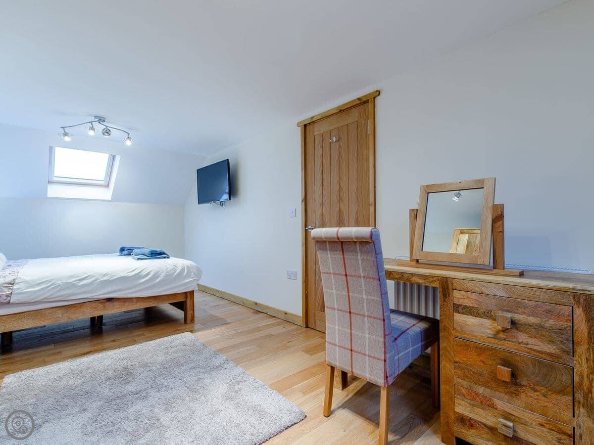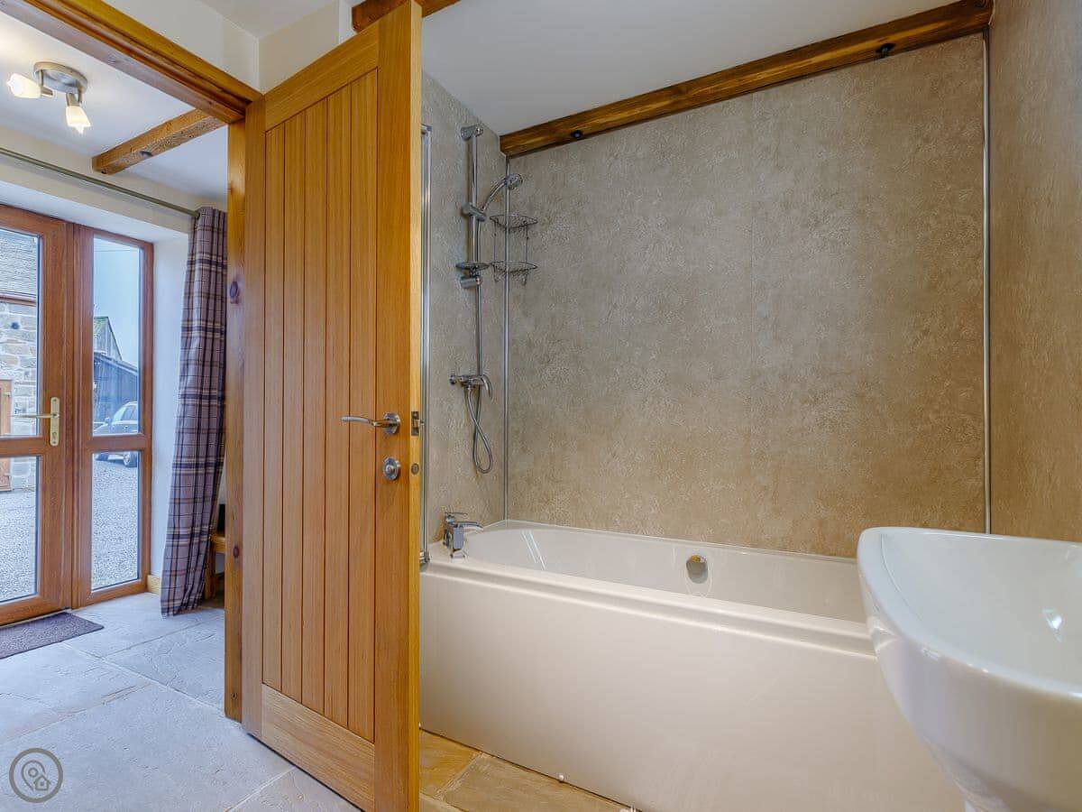 It sleeps six. Two bedrooms, both are doubles, and two bathrooms. One bathroom has a spa bath. It's got a 5 Star rating, which means it's well finished and everything works properly. The beams are original and quite low in the kitchen, so watch your head if you're tall.