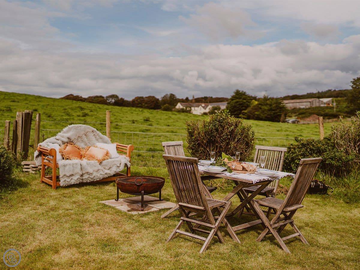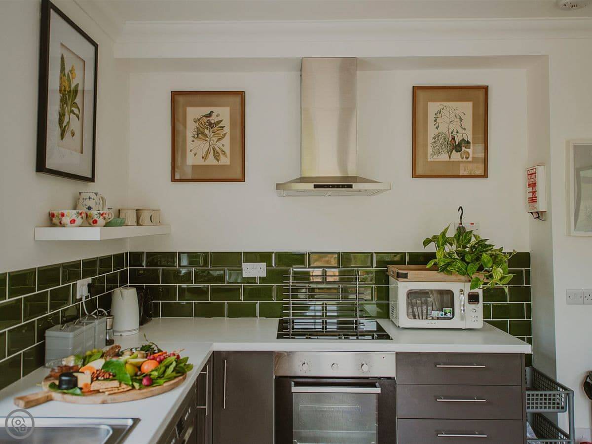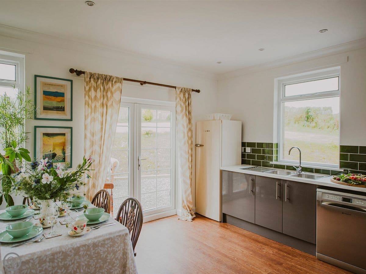 It sleeps six in three bedrooms. There's one bathroom. There's a wood burner in the living room. The kitchen has an induction hob. Bedding and towels are included, and there's a washing machine and dishwasher. There's parking on site. We can provide a cot. No pets, sorry.