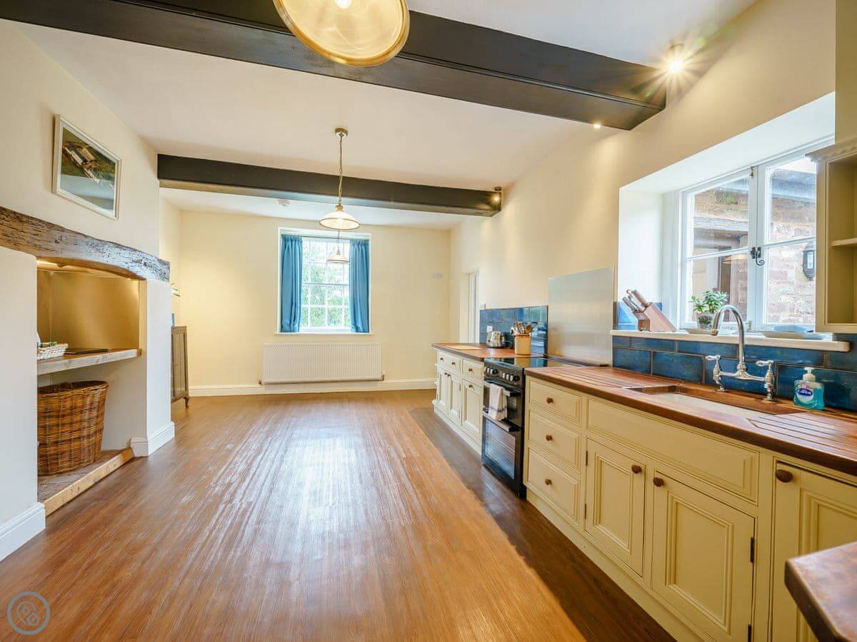 Downstairs there's a living room and a separate dining room, both with open fires. We leave some wood for you. The kitchen is fine, it's got what you need. There's a washing machine and a dishwasher.