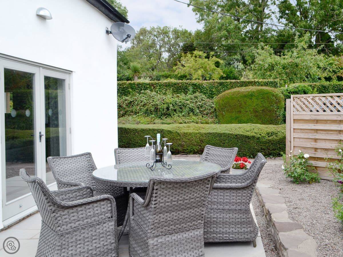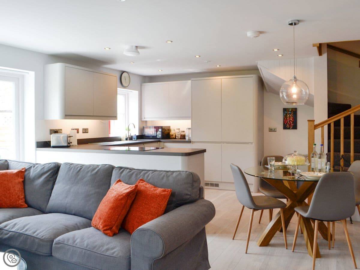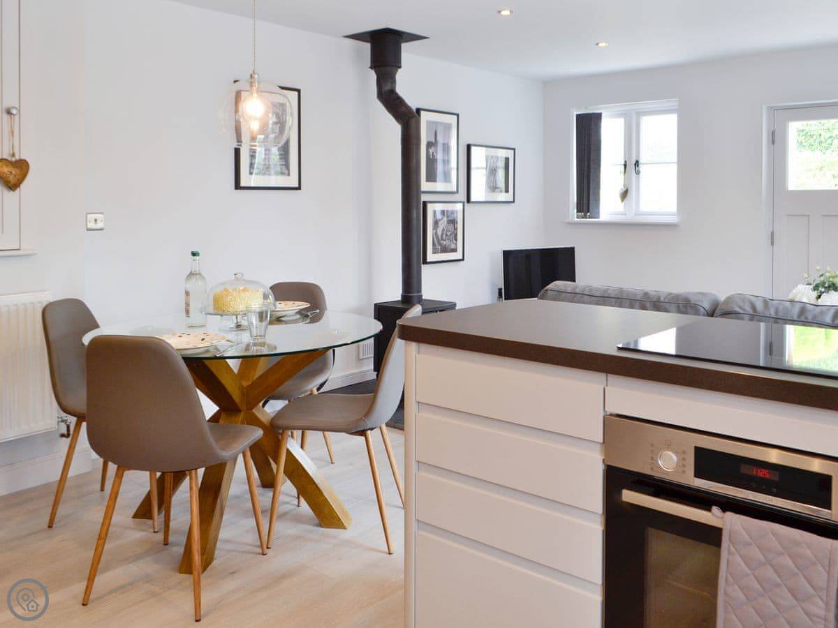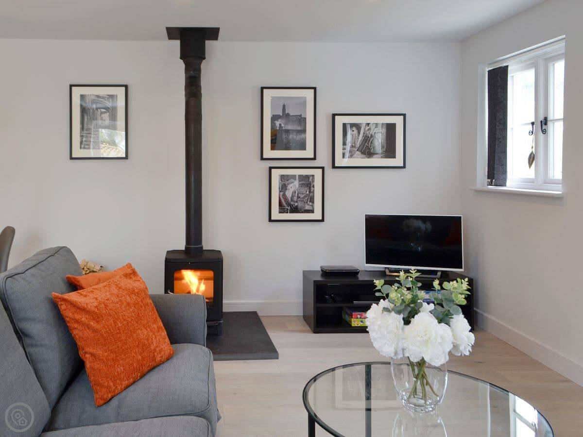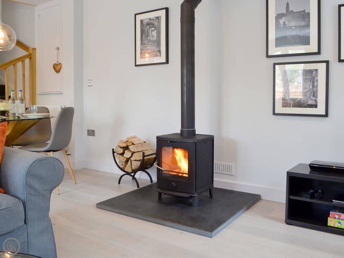 There's a wood burner in the main room. Patio doors lead out to a private courtyard. You get a dishwasher, washing machine, WiFi, and a TV. Bedding and towels are included.
