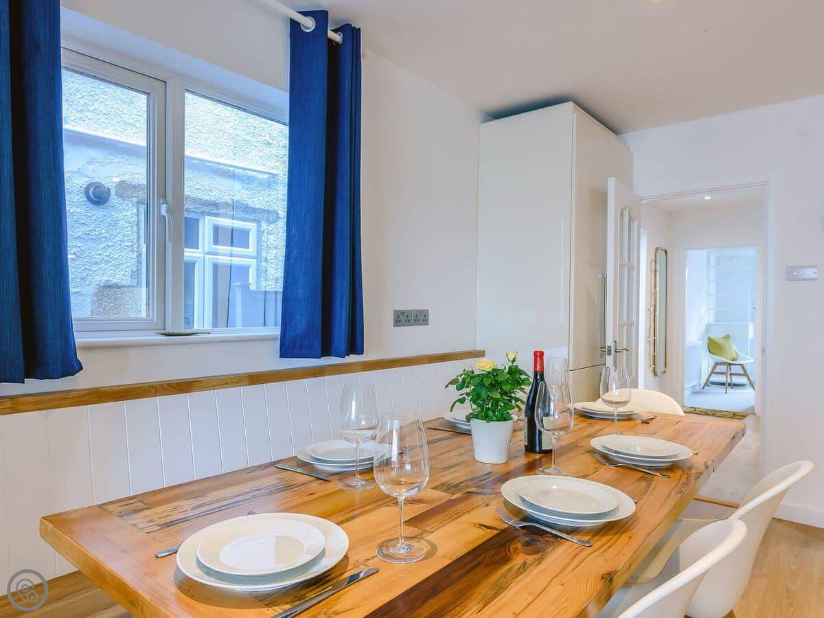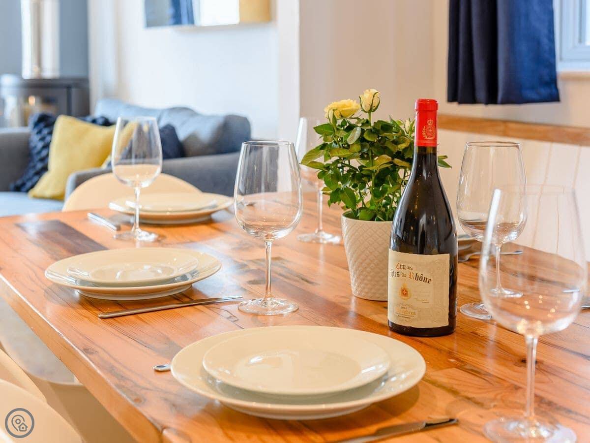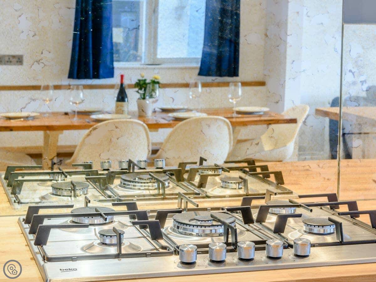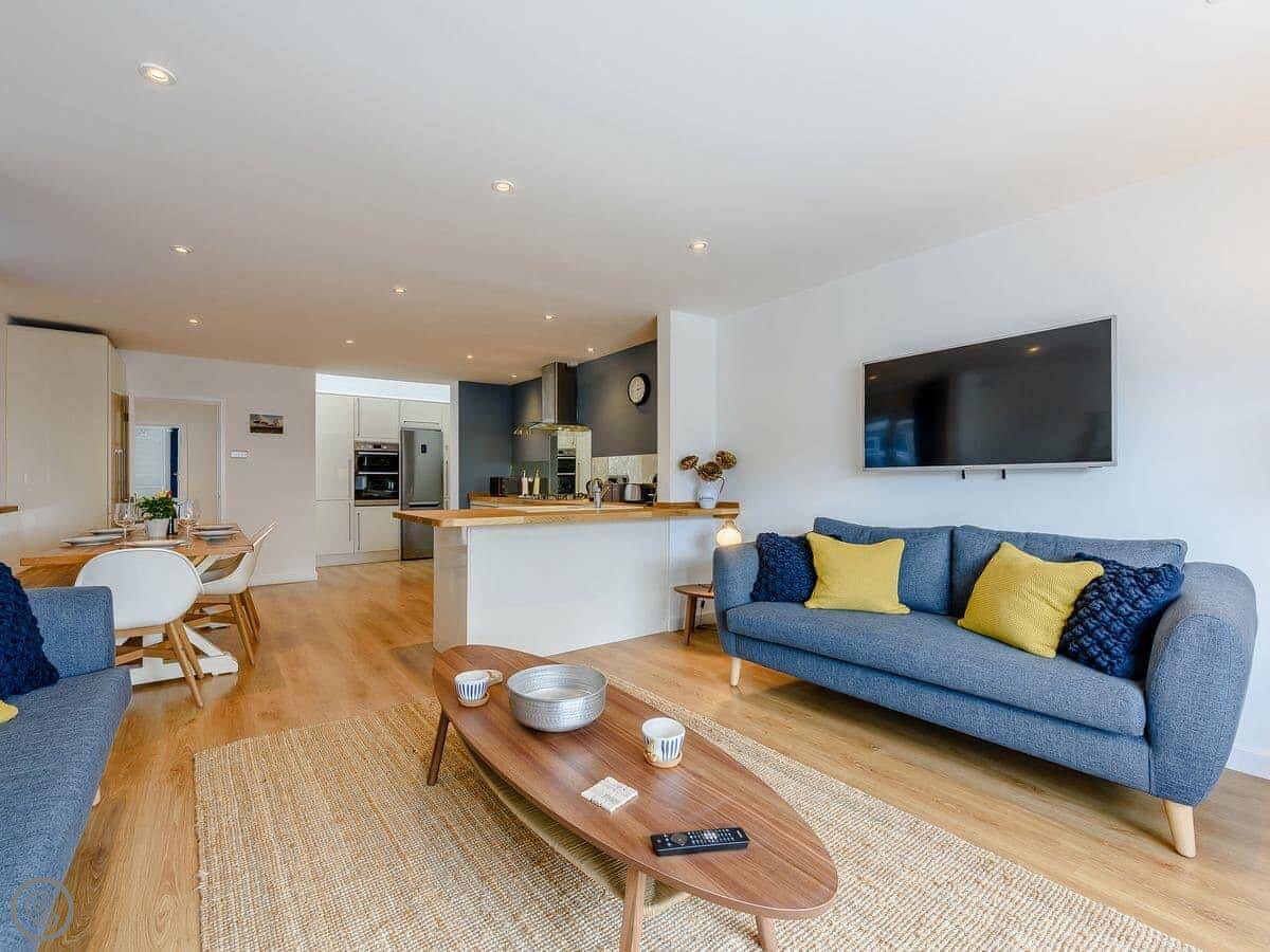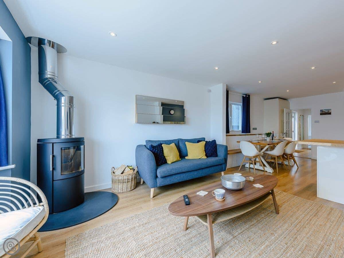 Downstairs is one big open space. Lounge with a wood burner, kitchen, and dining area. It's all new. There's also a smaller snug room, which is handy if some people want to watch something different on TV.