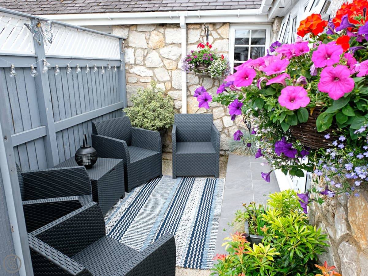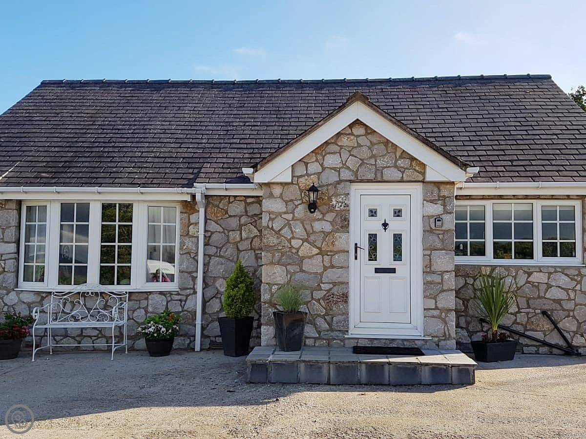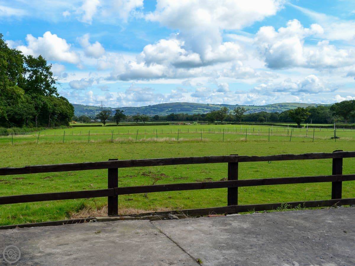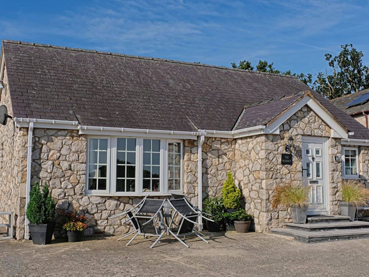 This is The Paddock. It's a bungalow on our farm near Denbigh. You'll have your own bit of garden and patio. The views are over fields.