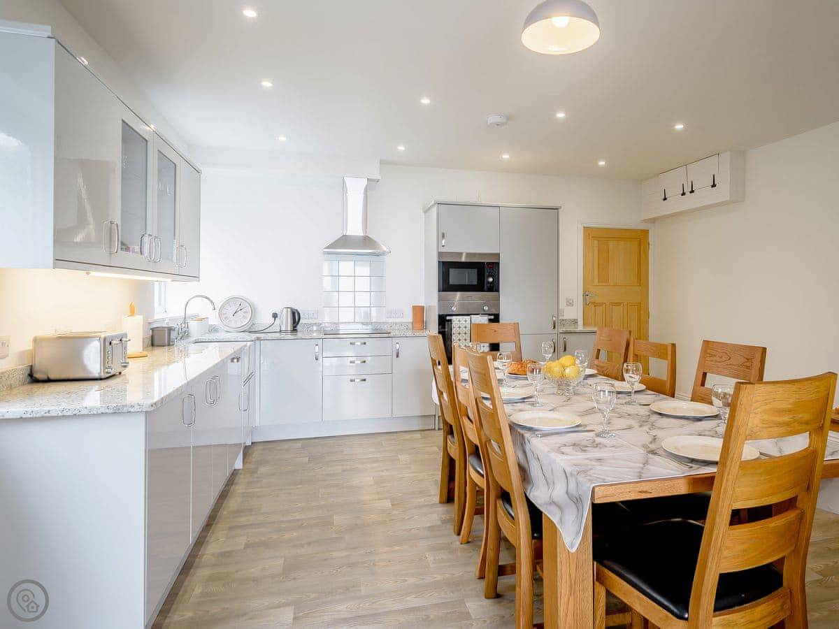 As for facilities: it's got everything on the list. Washing machine, dishwasher, WiFi, TV. Bedding and towels are included. There’s on-site parking and an electric vehicle charger if you need it. It's set up for families – cot, highchair, stairgate are here. You can bring up to three dogs.