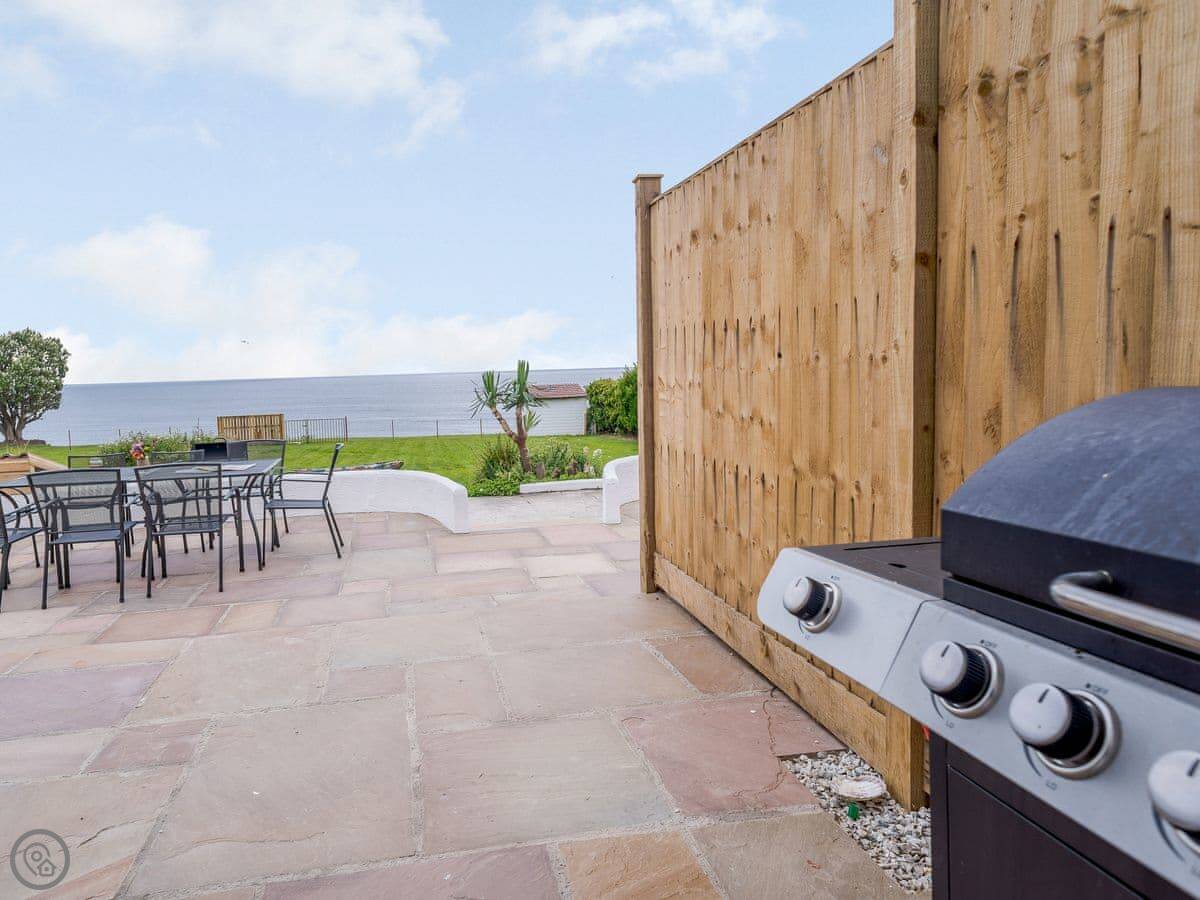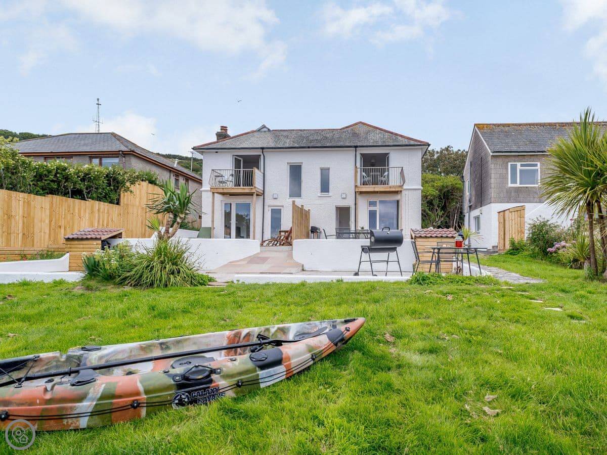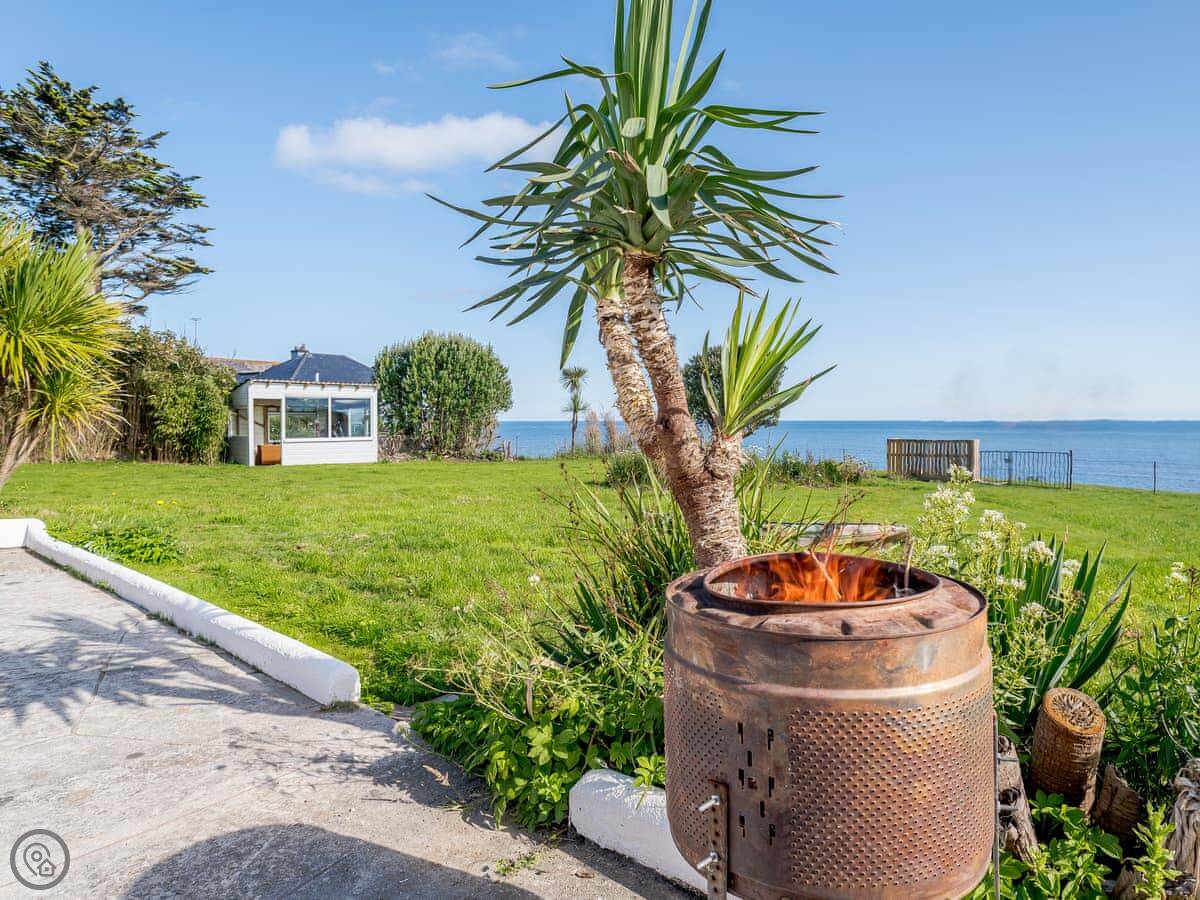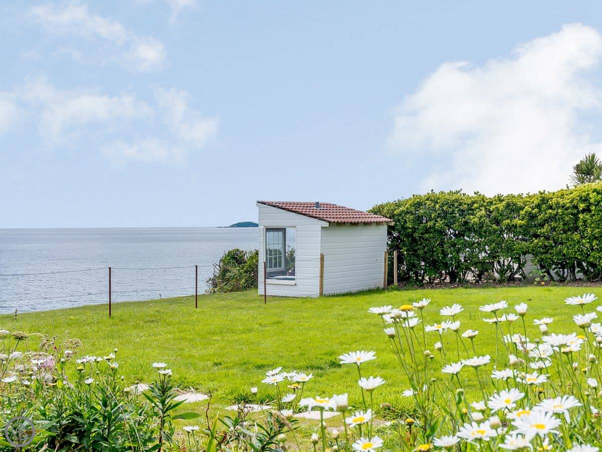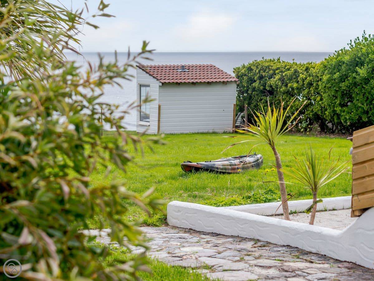 The living area is open plan. Doors lead out to a private terrace looking straight at the sea. The gardens are shared with the other house on the estate, West Yardley, but they're big. There's plenty of space. You get your own garden furniture, a barbecue, and a fire pit. There's a useful storage shed for bikes or beach gear.