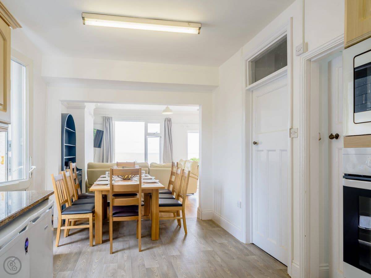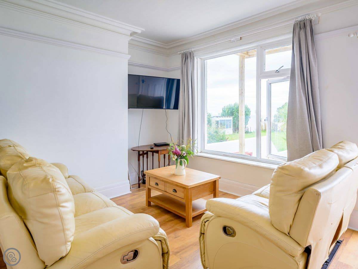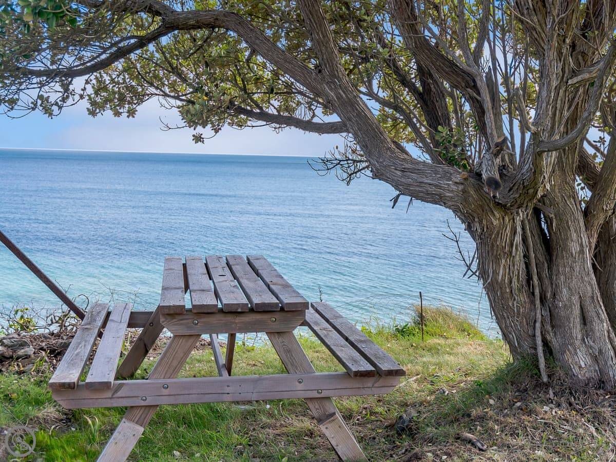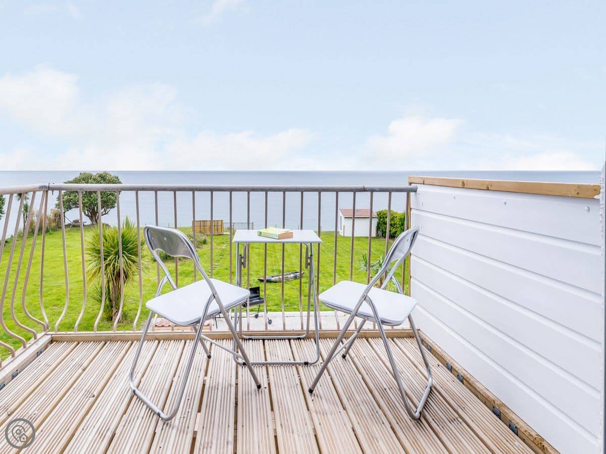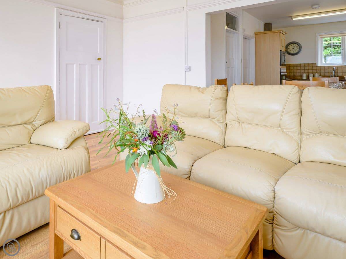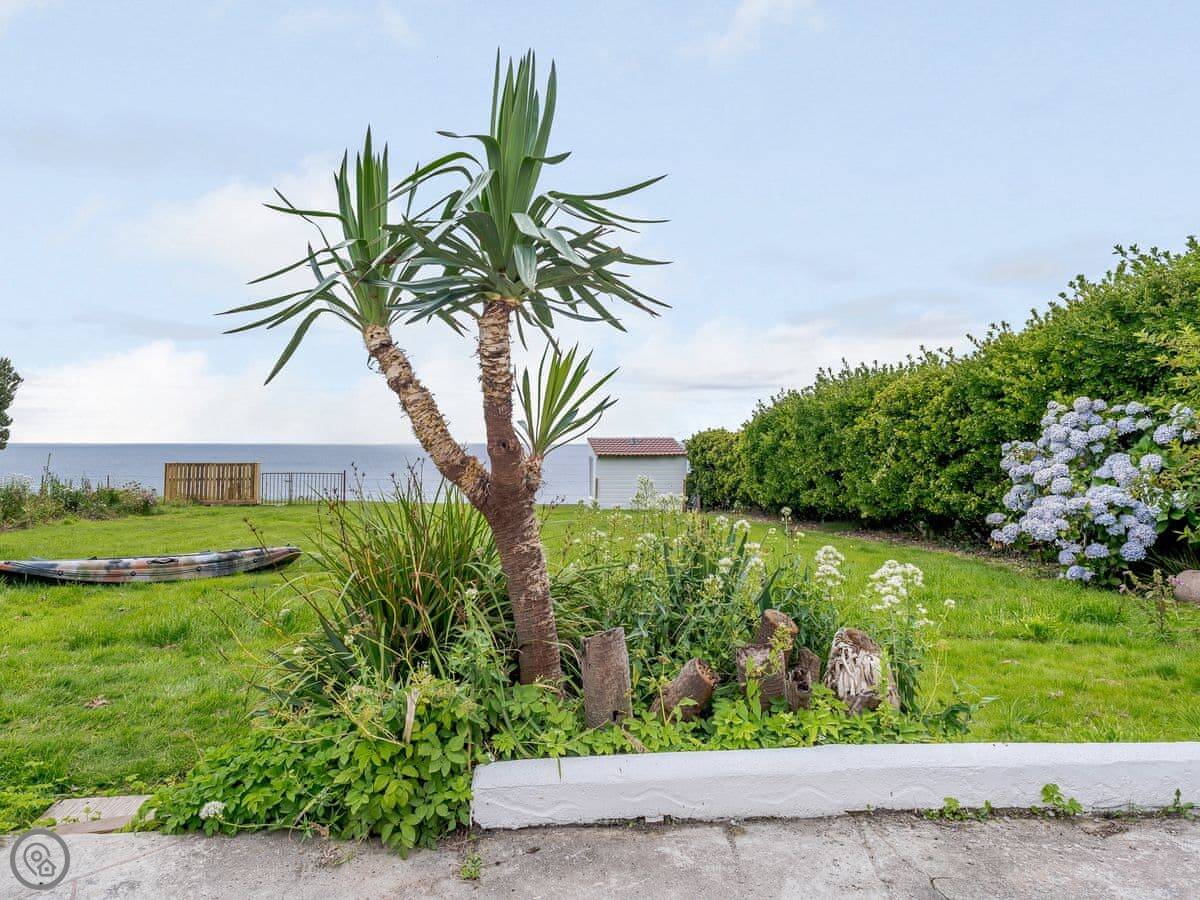The living area is open plan. Doors lead out to a private terrace looking straight at the sea. The gardens are shared with the other house on the estate, West Yardley, but they're big. There's plenty of space. You get your own garden furniture, a barbecue, and a fire pit. There's a useful storage shed for bikes or beach gear.
