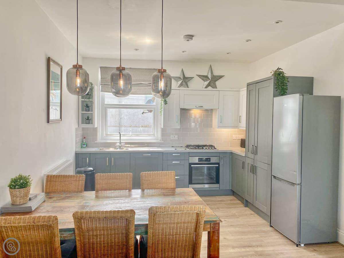 This spacious apartment is situated over the first and second floor with stunning sea views across Newquay Bay and beyond. The accommodation comprises of a private entrance into a hallway with stairs to the first floor where there is a good-size open plan living area, refurbished in 2020, boasting a cosy living area and a well-equipped kitchen area with a bay window overlooking Newquay Bay.