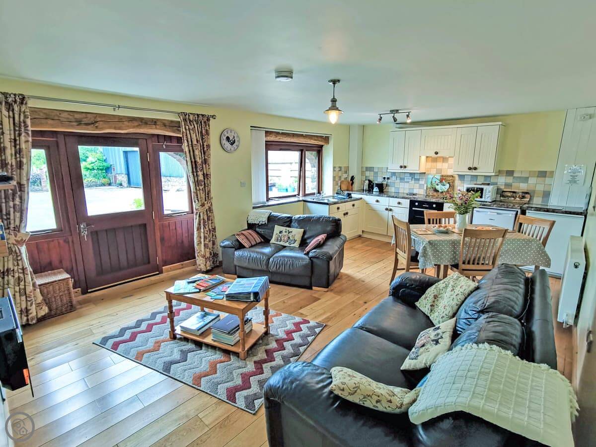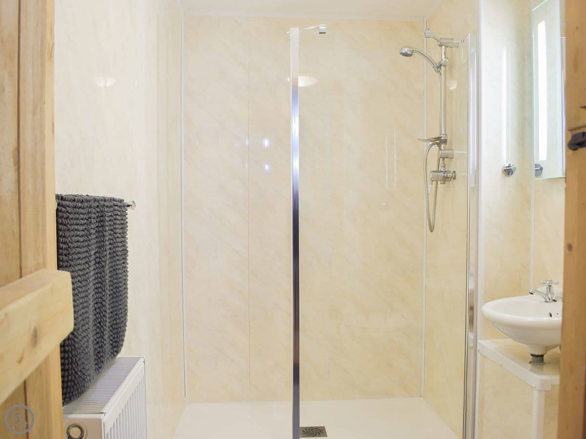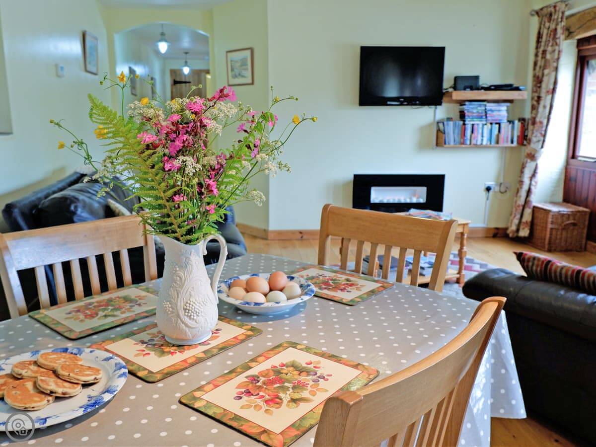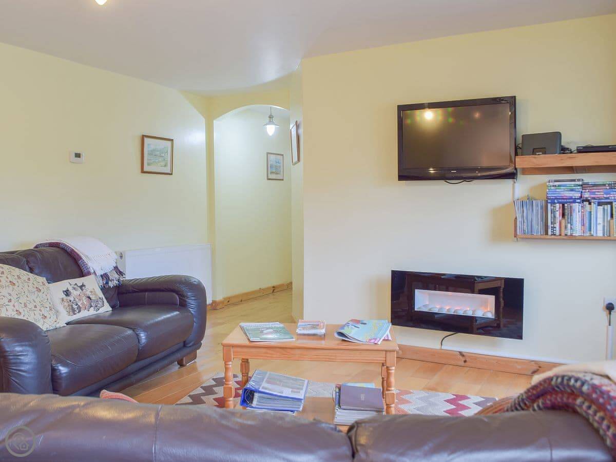 It's all on one level, which is good if steps are a problem. It sleeps five in two bedrooms. One's a king size, the other has a bunk bed and a single. There's one wet-room shower room. The main room is open plan, so the kitchen, dining, and sitting area are all together. There's an electric fire for background heat. We've put in an electric vehicle charger.