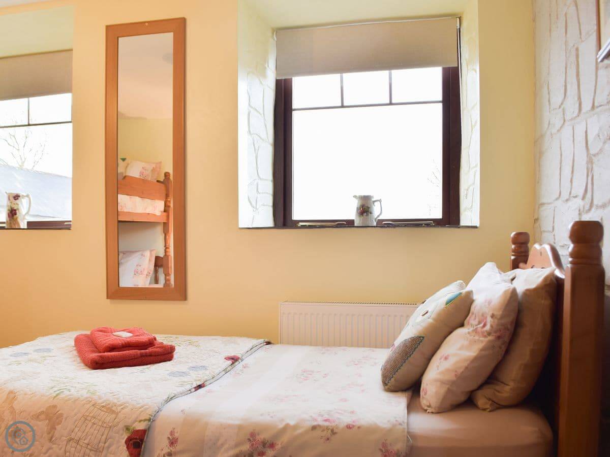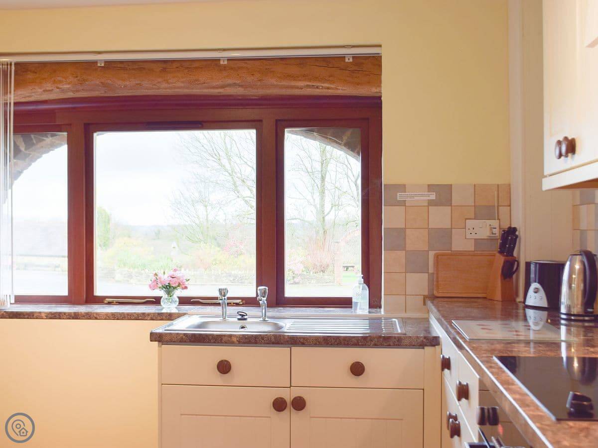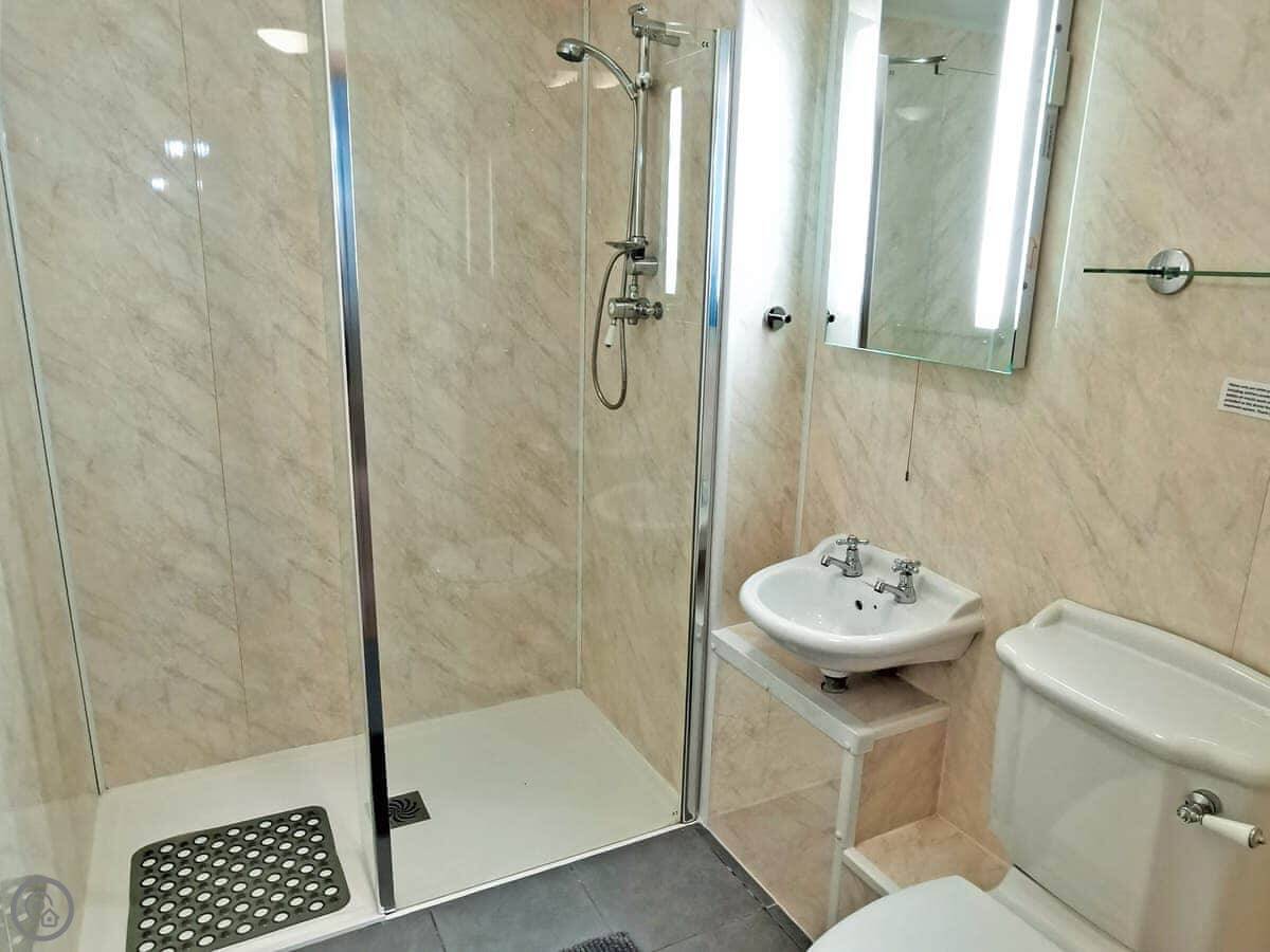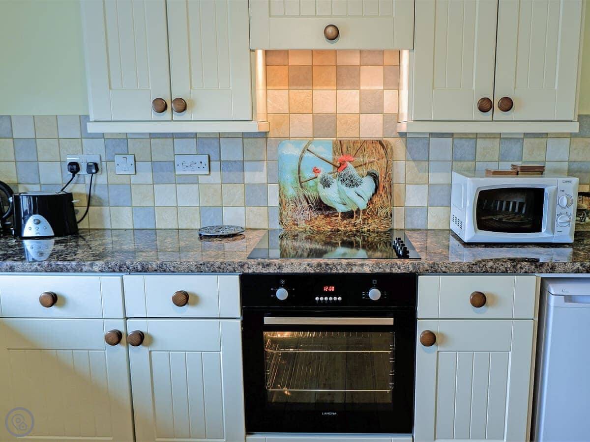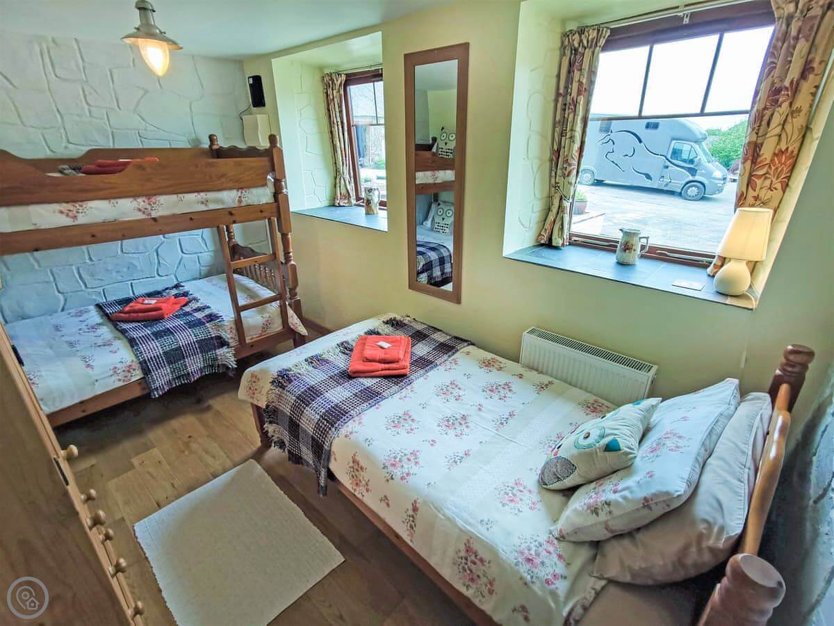 It's all on one level, which is good if steps are a problem. It sleeps five in two bedrooms. One's a king size, the other has a bunk bed and a single. There's one wet-room shower room. The main room is open plan, so the kitchen, dining, and sitting area are all together. There's an electric fire for background heat. We've put in an electric vehicle charger.