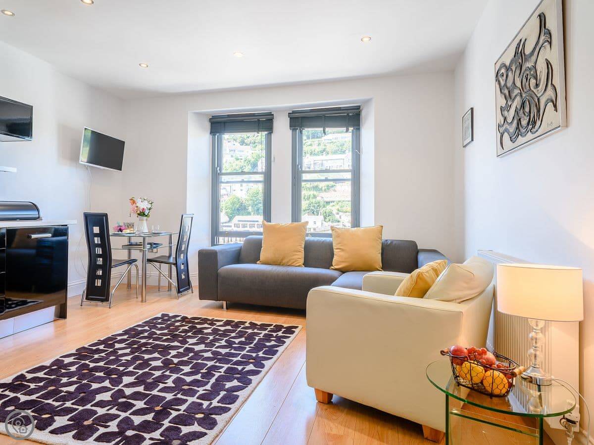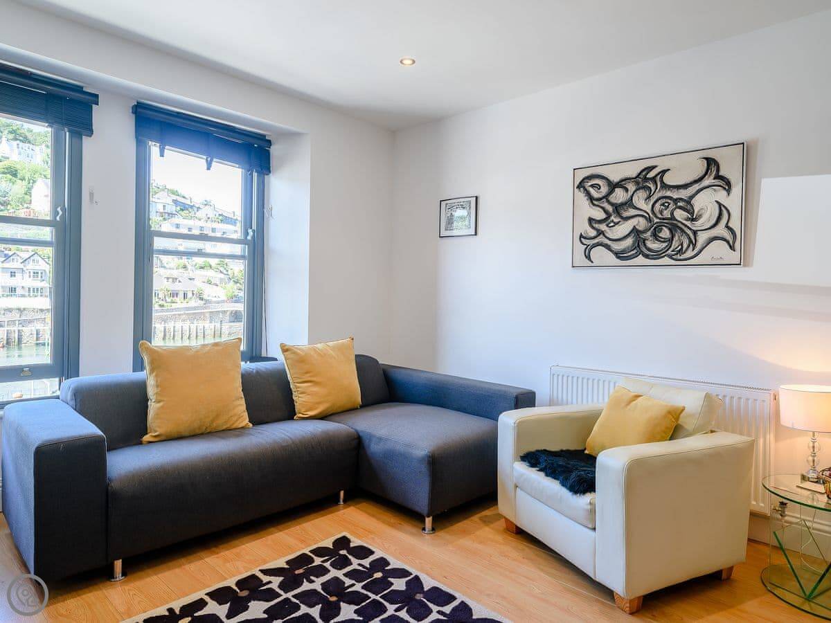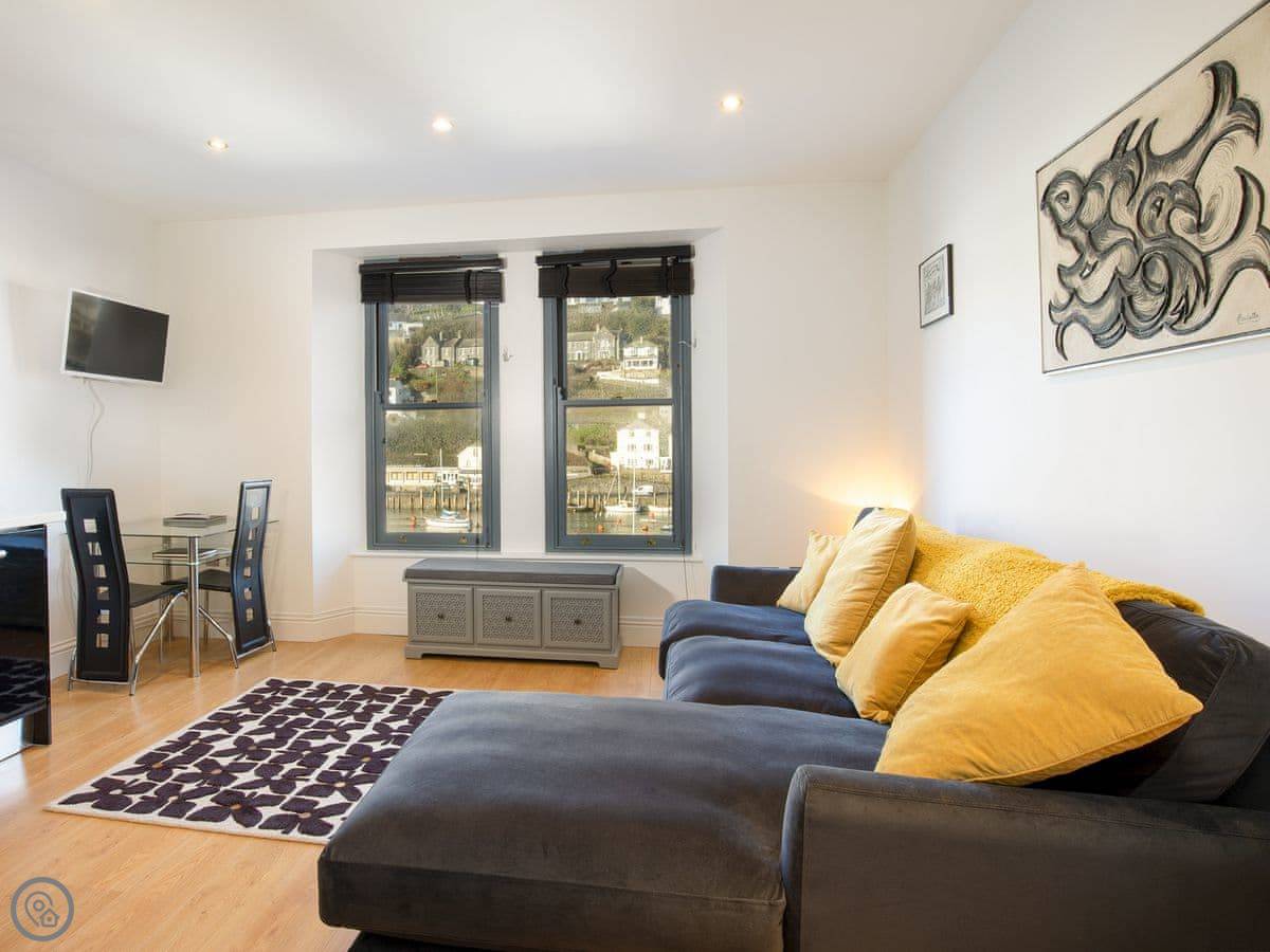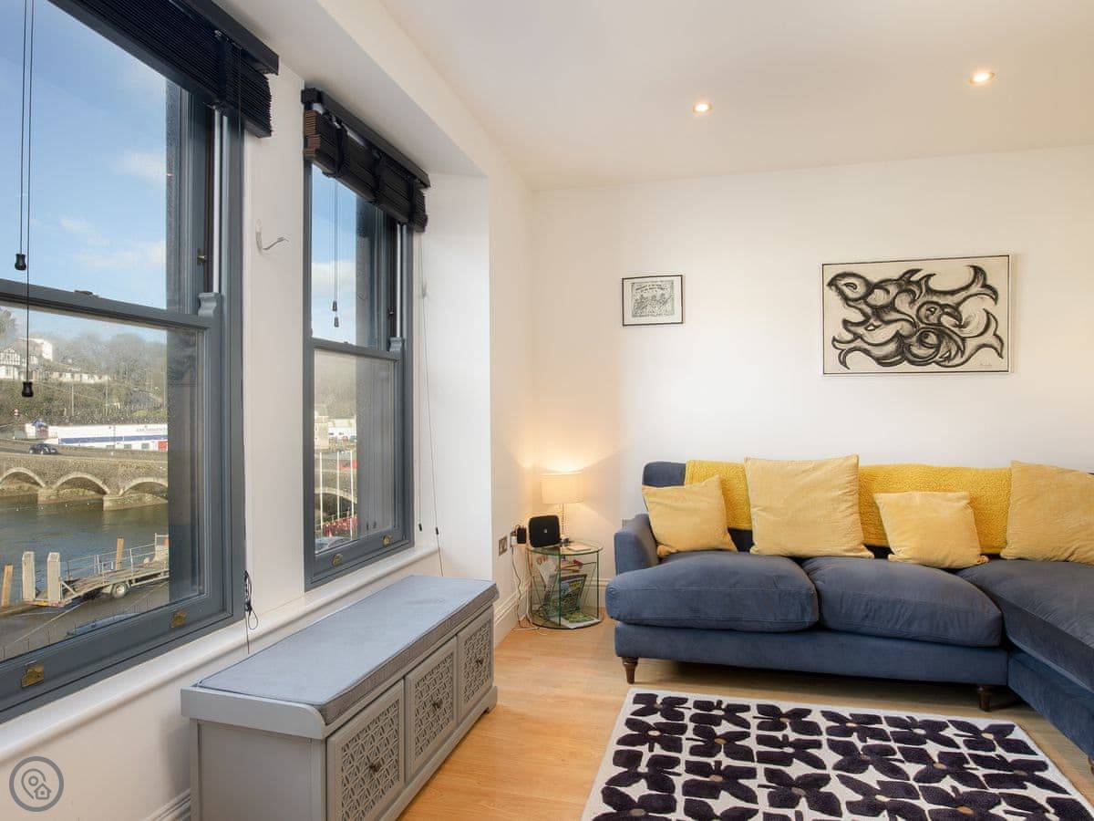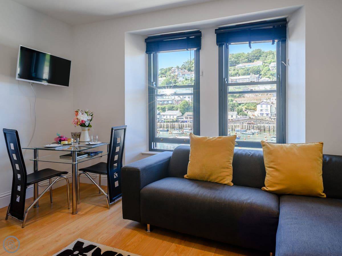 Water View is a flat on the second floor in Looe, just off the harbour. It's for two people, one bedroom and one bathroom. It's got a 4 Star rating which means it's been done up nicely. The main thing is the view. You look right out over the water from the living room. You can sit and watch the boats.