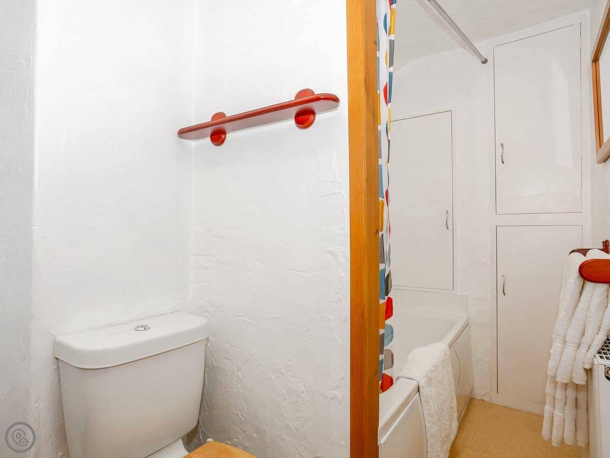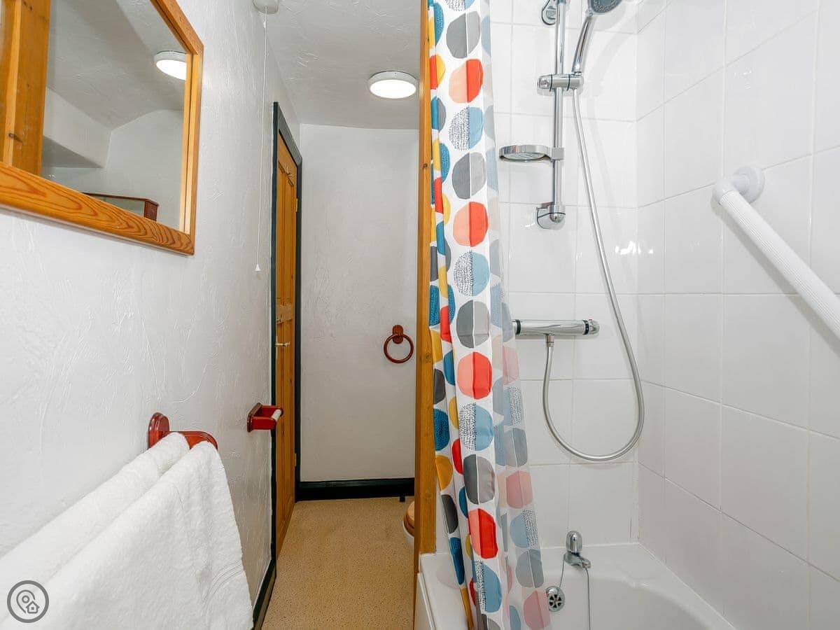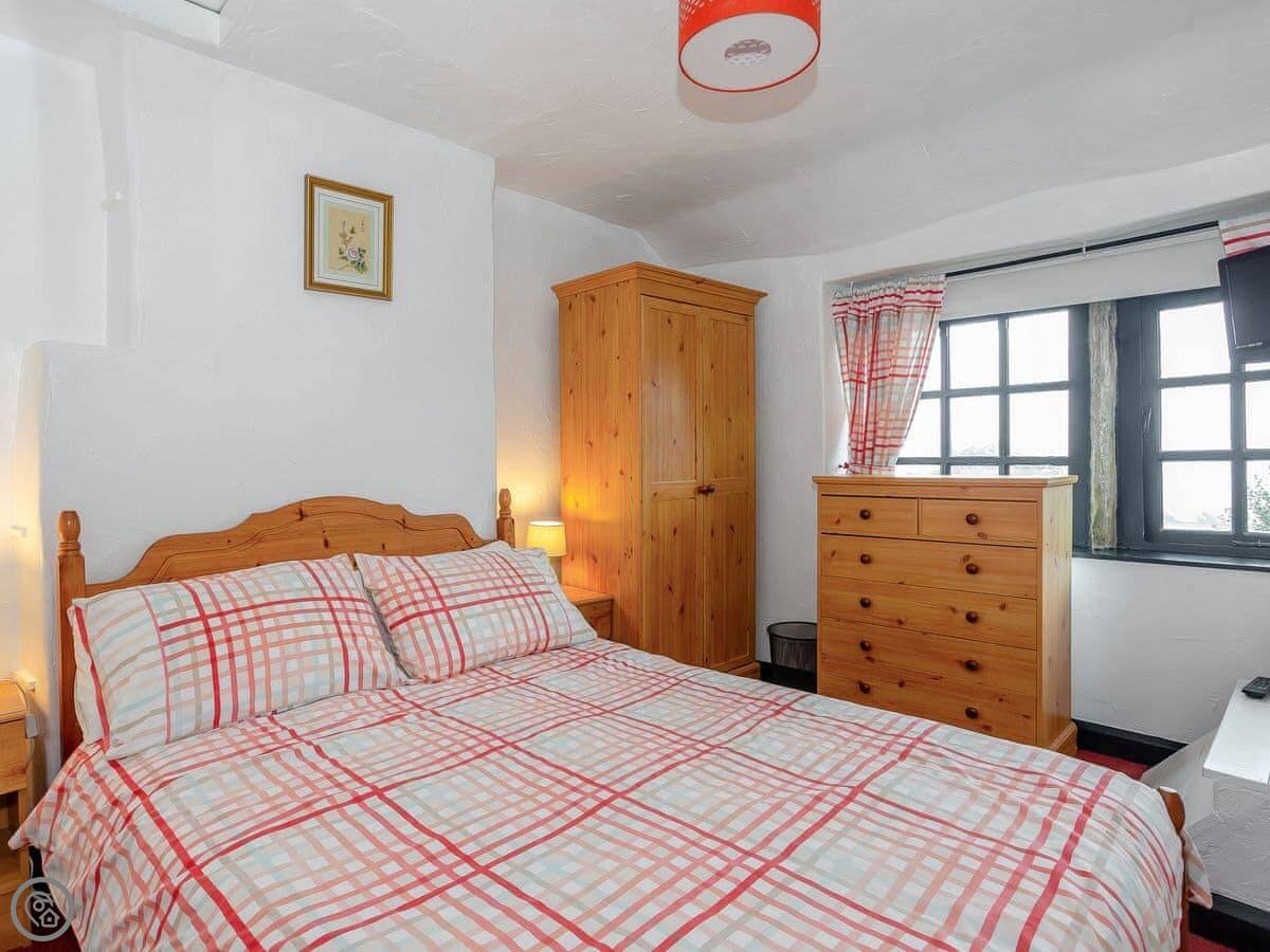 Downstairs is the kitchen and living area. There's a reclining sofa, a TV, and a gas fire. Upstairs is the bedroom and the bathroom. It's a 4 Star place, so it's comfortable and everything works. The stairs are the old, steep kind. You get used to them.