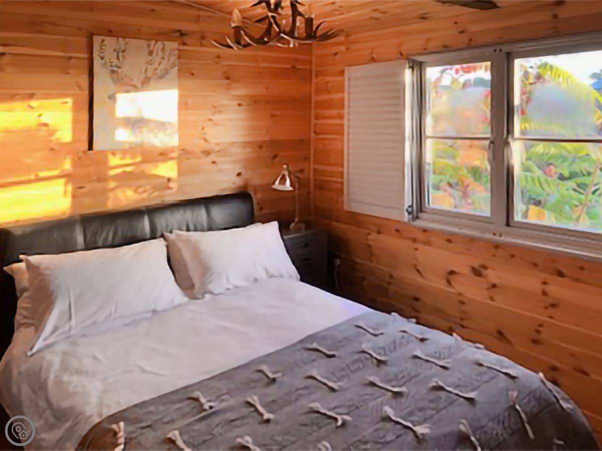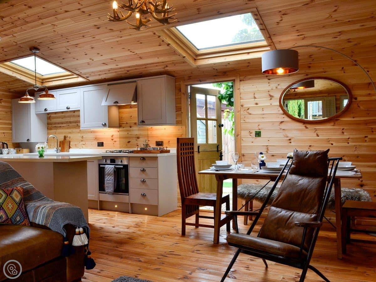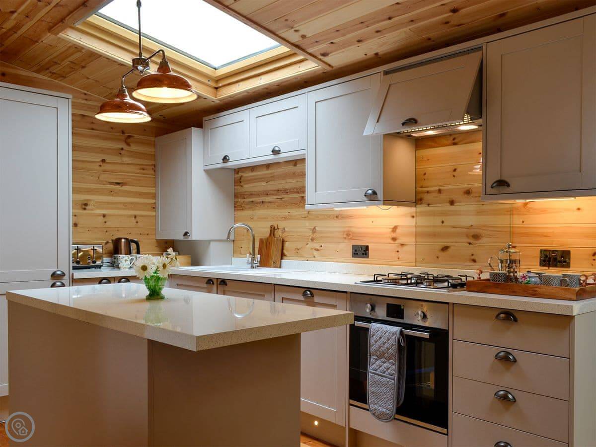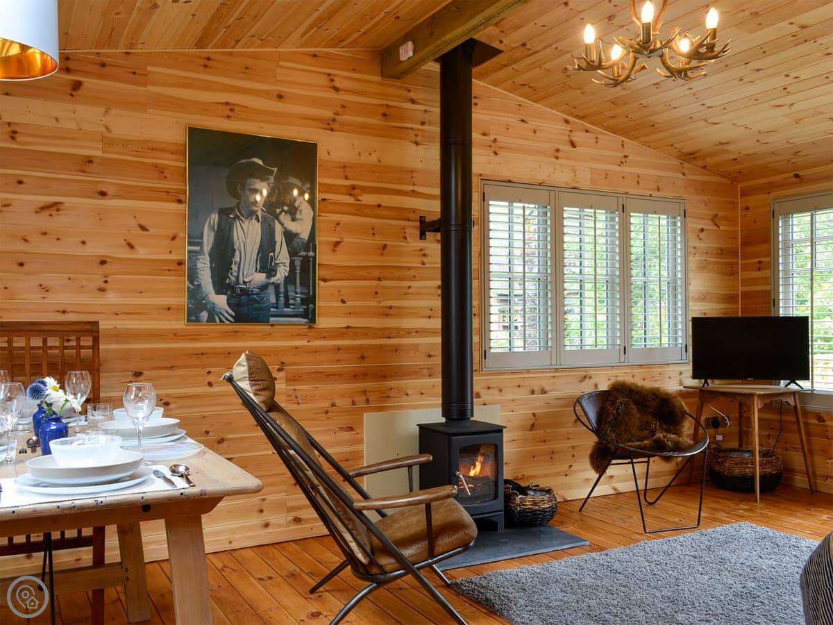 Inside, it’s open plan. There’s a wood burner in the living area, which does throw out a good heat. The kitchen has stuff like a dishwasher and a washing machine. It’s well-equipped.