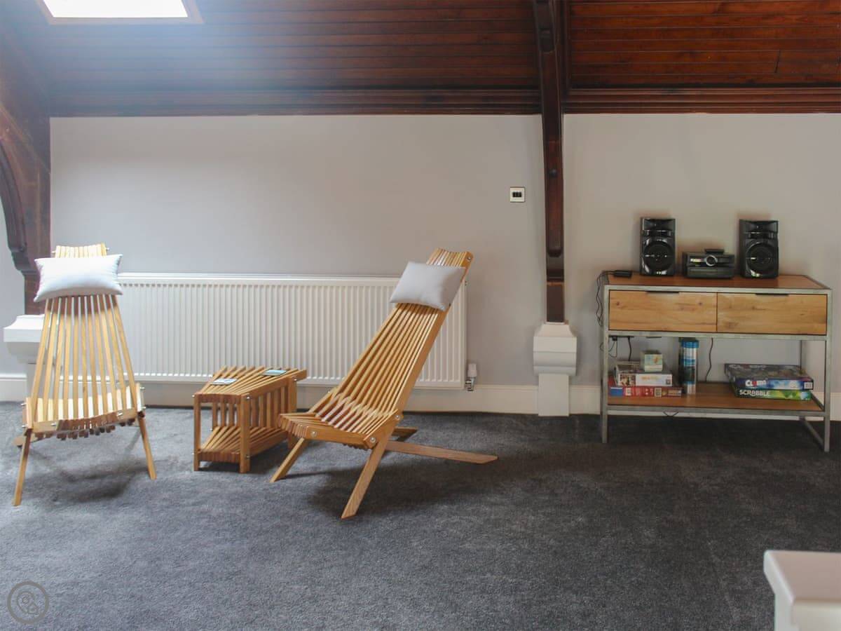 It sleeps five. Two bedrooms are on the ground floor: one with a kingsize bed and one with three singles. One bathroom with a shower. The living room's got a high vaulted ceiling and stairs up to a galleried floor. That's where the kitchen and dining table are.