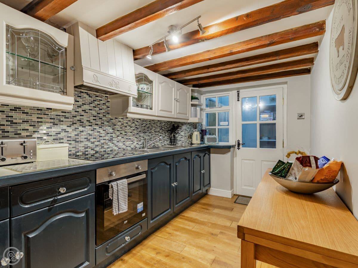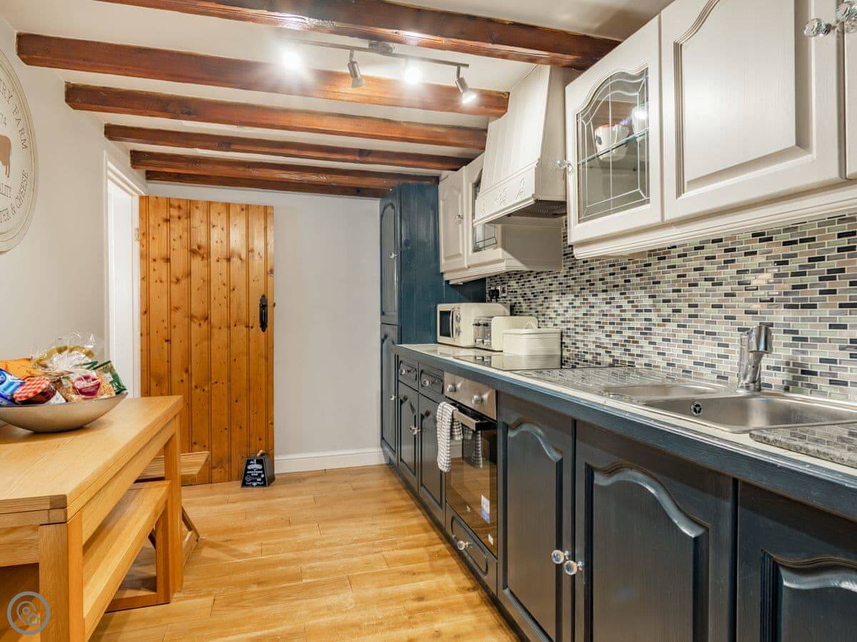 You get in through a covered passage with a locked door. It's useful for bikes or muddy boots. There's a washing machine in there too. The kitchen is galley-style, so it's narrow but it has what you need.