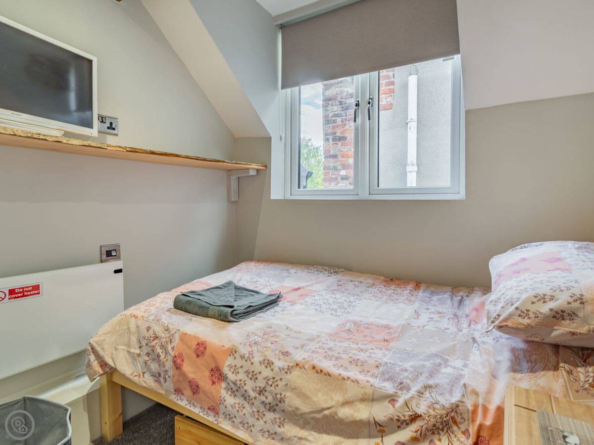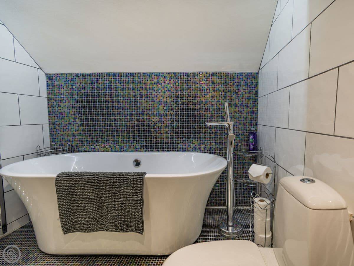 Upstairs, the second bedroom is through a wooden sliding door. The bathroom has a freestanding bath with a shower attachment. There's no separate shower cubicle.