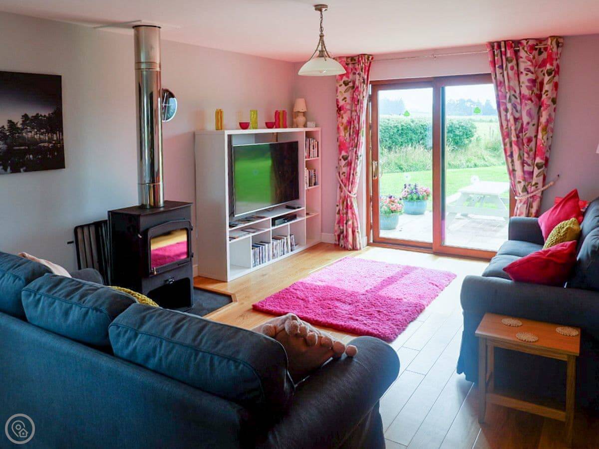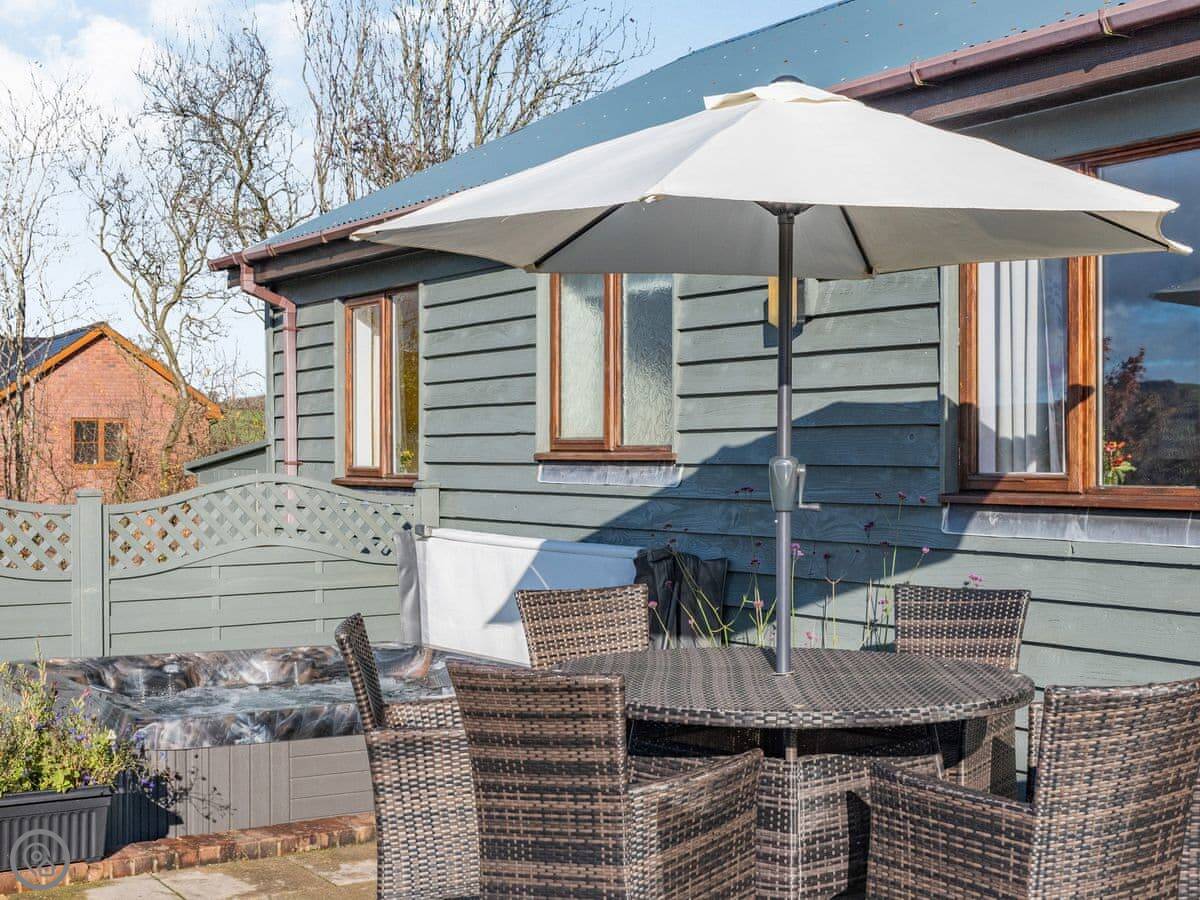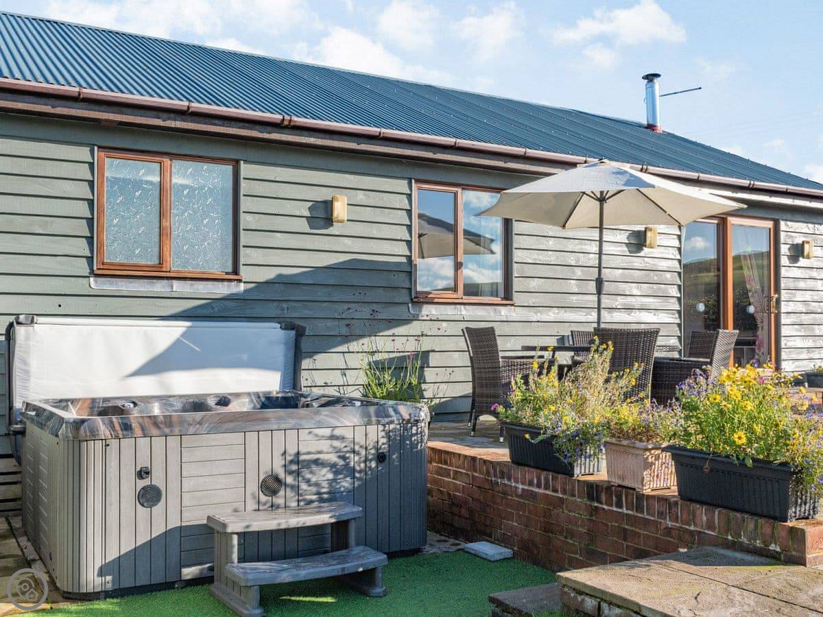 The main room is open plan, with a kitchen, living and dining area. There’s a wood burner for chilly evenings. The garden is private and enclosed. There’s a hot tub out there.