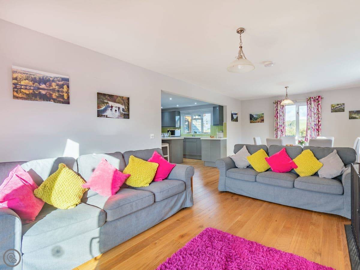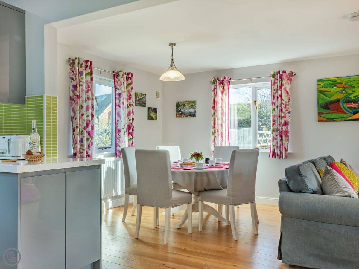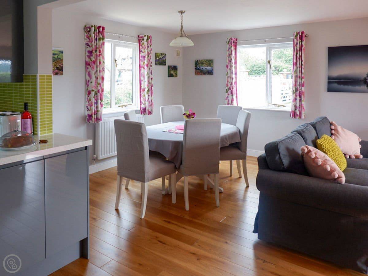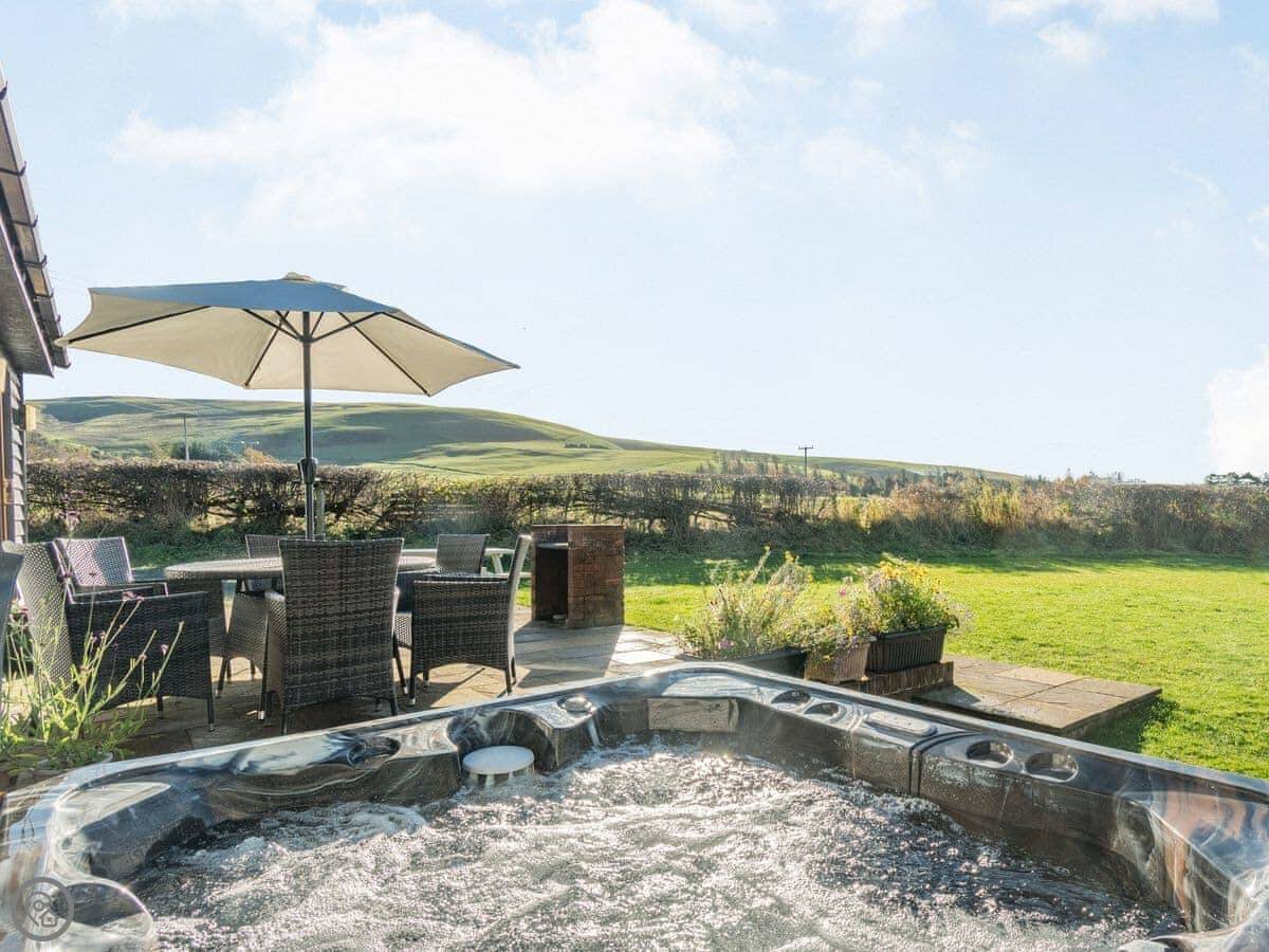 The main room is open plan, with a kitchen, living and dining area. There’s a wood burner for chilly evenings. The garden is private and enclosed. There’s a hot tub out there.