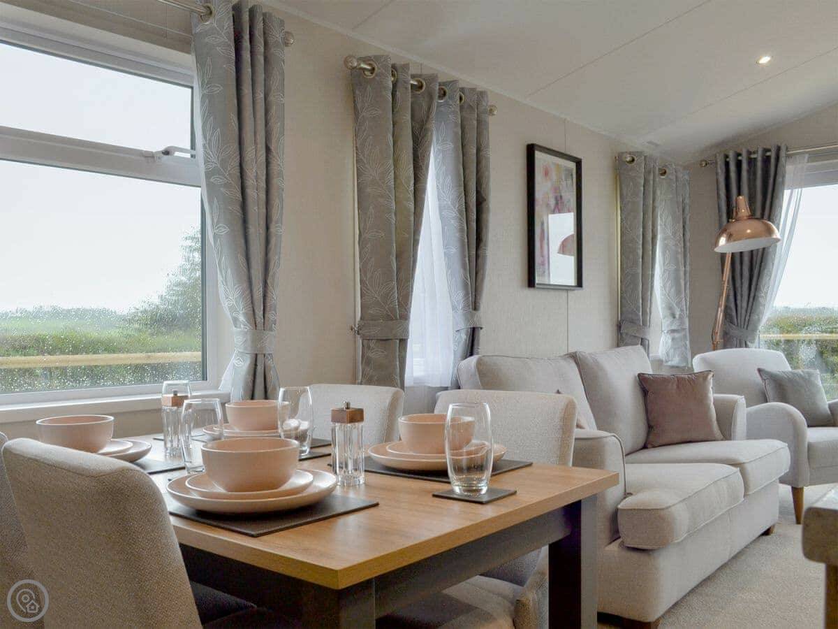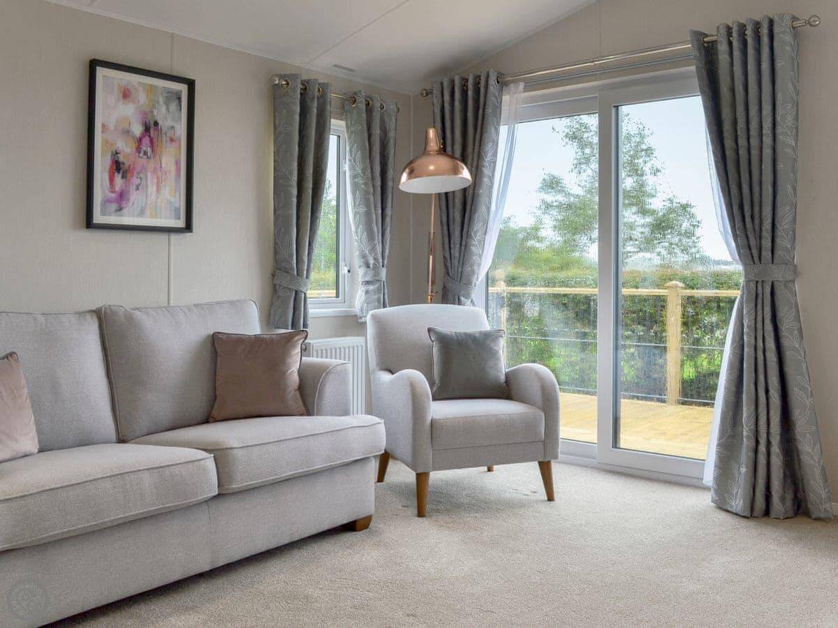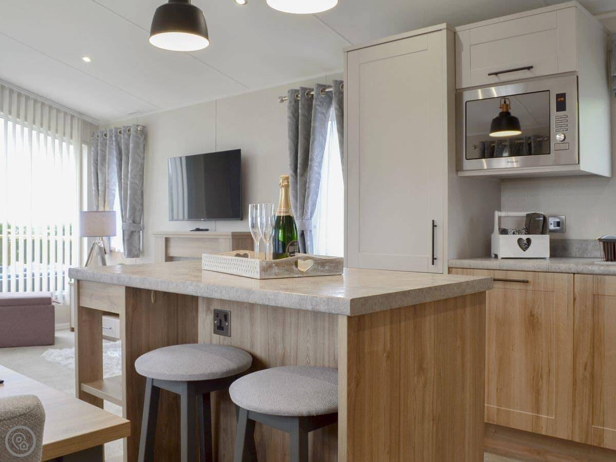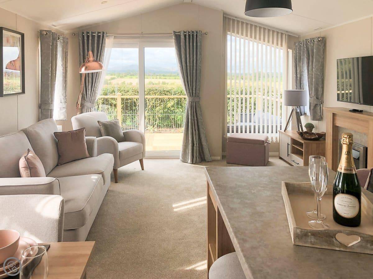 It's a detached cottage, so it's on its own. There are big open grounds around it, mainly farmland. The living area is open plan, with big windows looking out onto the deck. The kitchen has everything you need, including a dishwasher and washing machine.