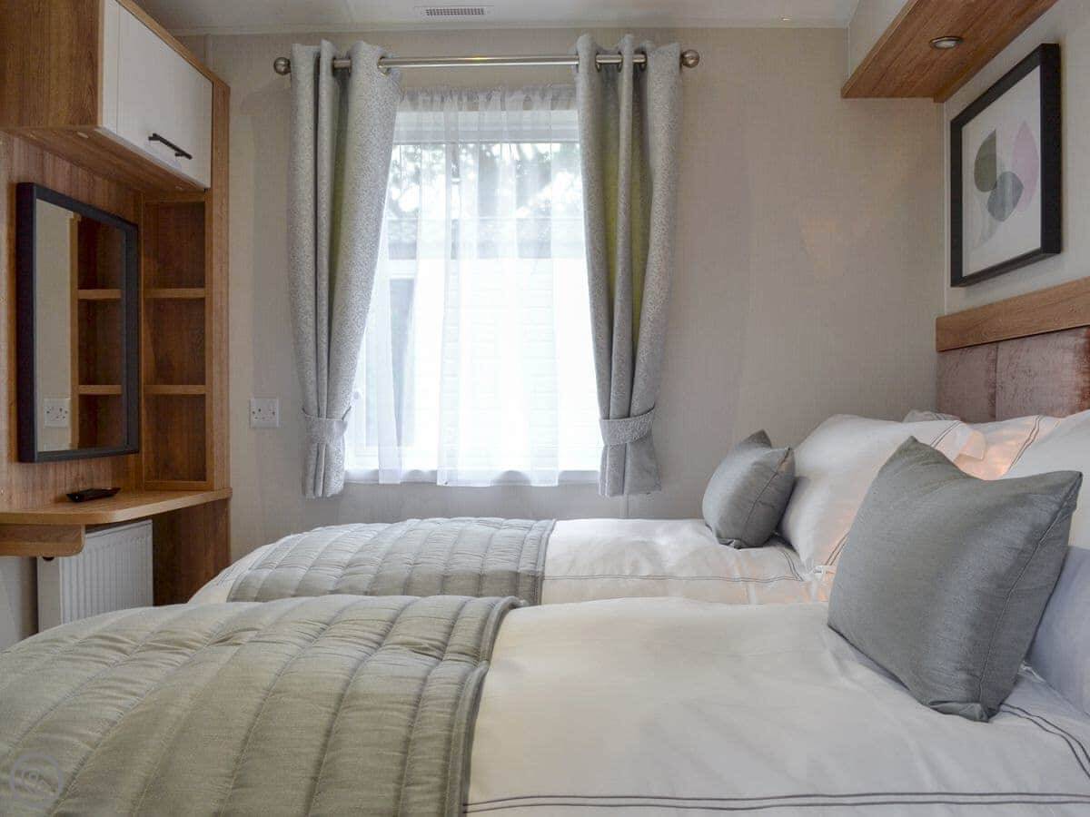 It sleeps four. Two bedrooms, two bathrooms. The main bedroom has a kingsize bed and an en-suite. The other is a twin room. It's a 4 Star place, which means it's comfortable and well-finished. The beds are good quality.