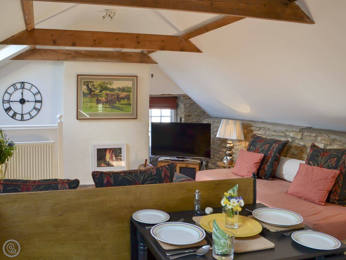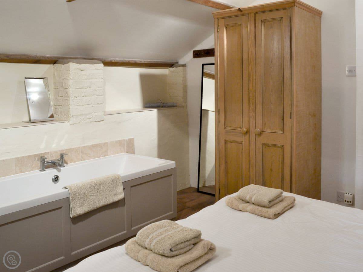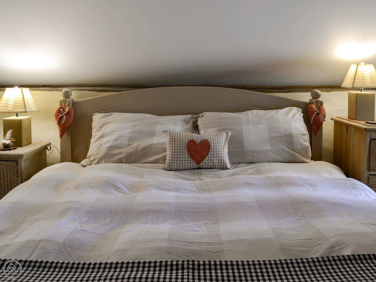 You get your own front door straight off the lane. Inside, it's open plan. The bedroom's up a few steps, and the bath is right there in the room. The walls are stone and there are beams. It's a compact space.
