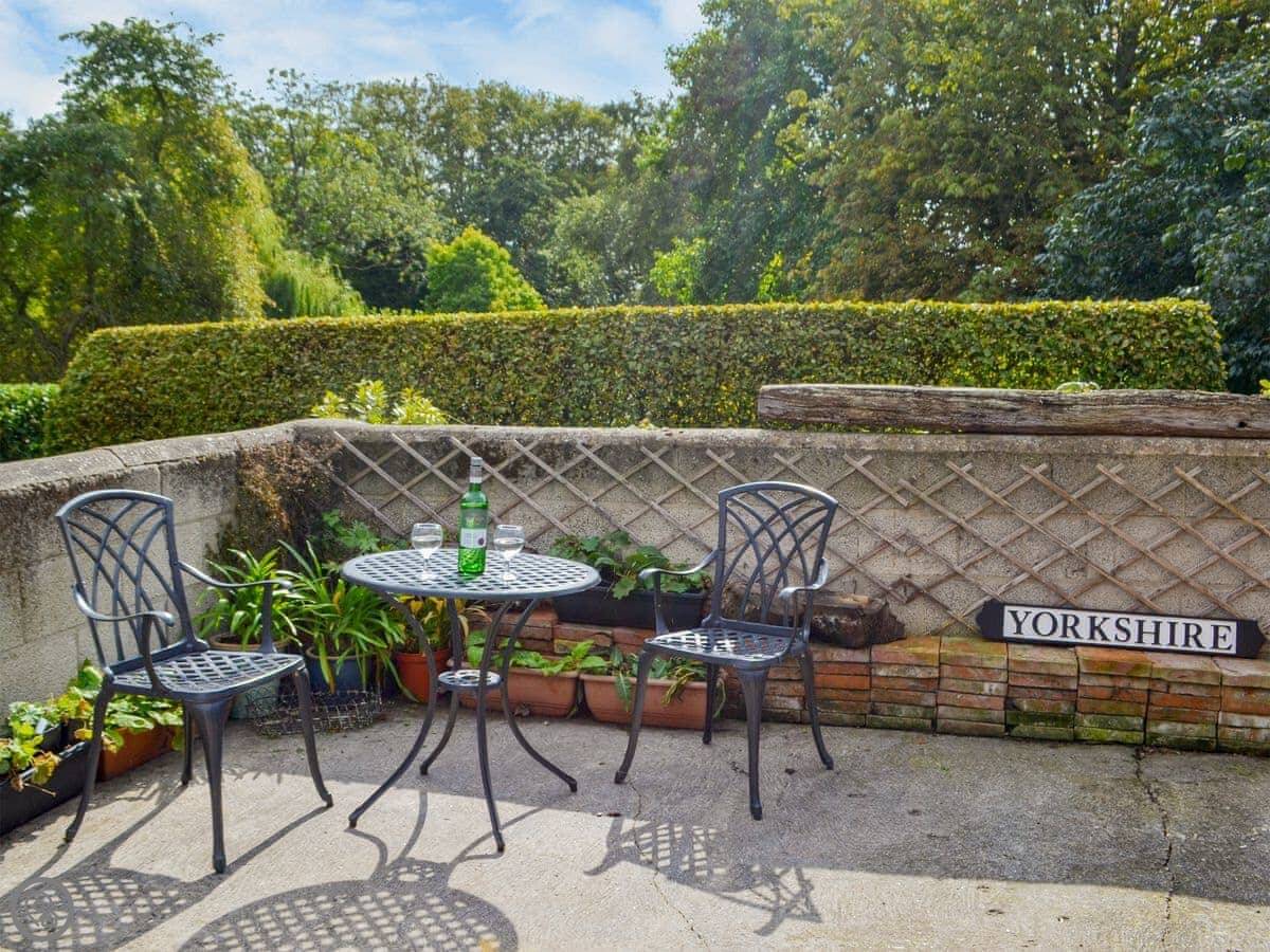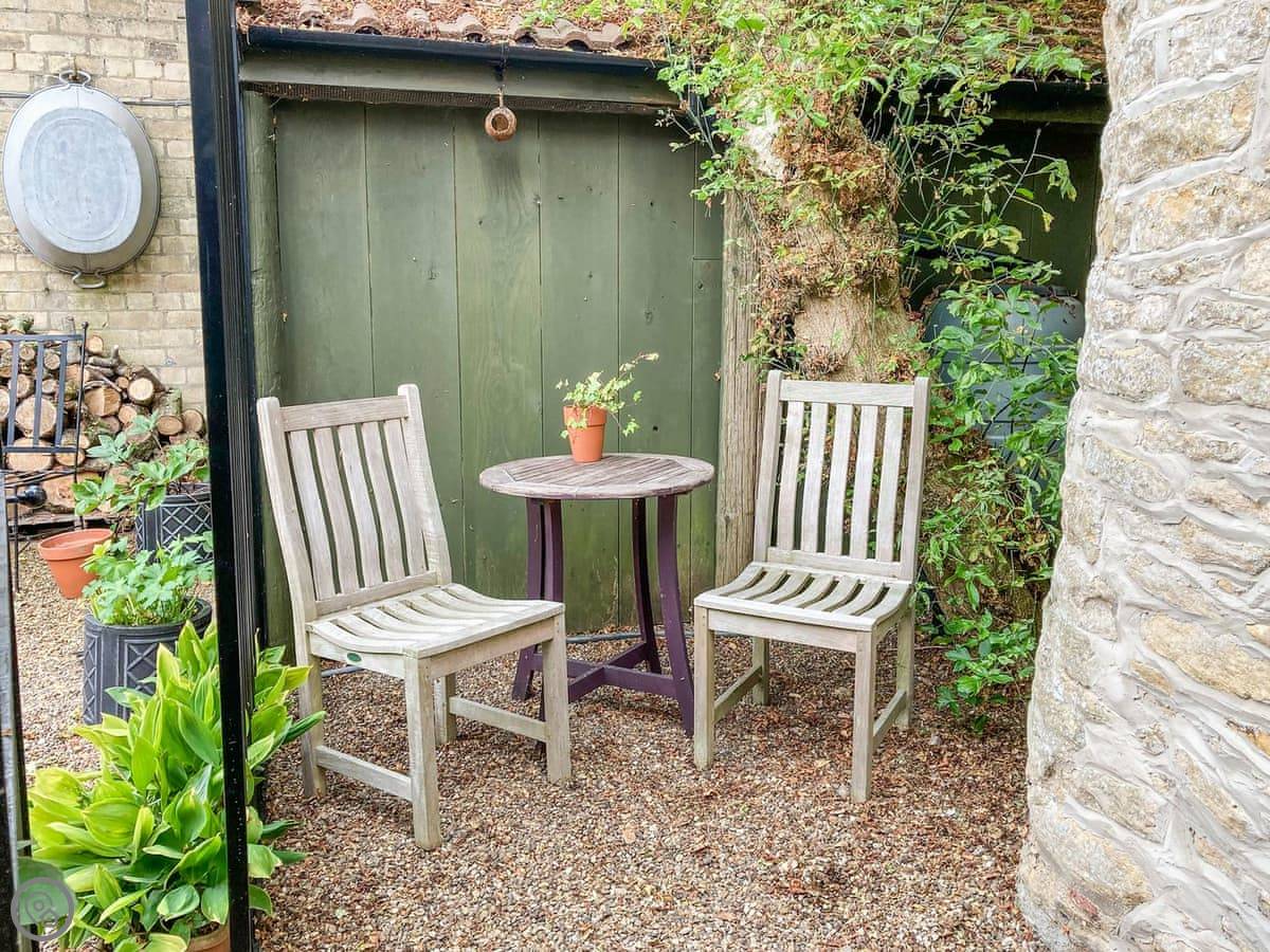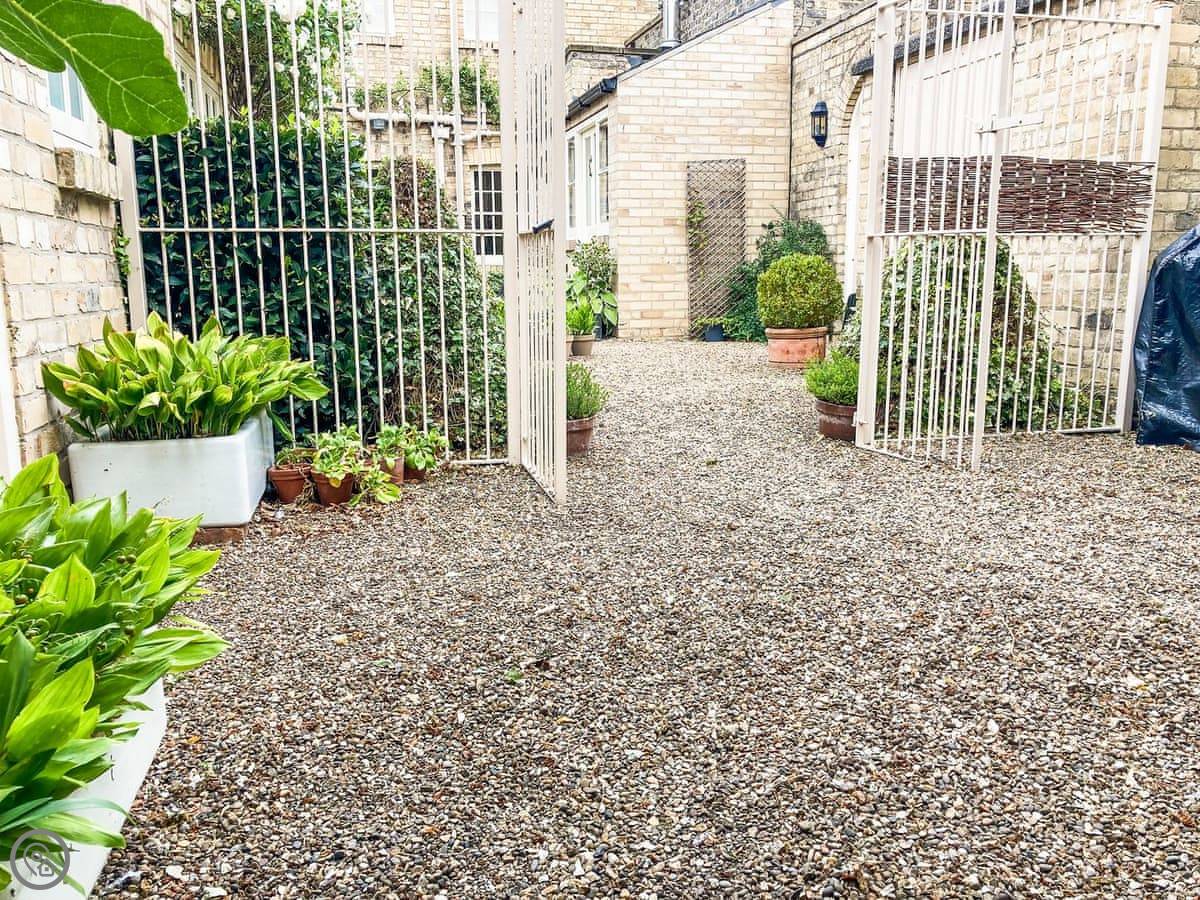 Outside, there's a private gravelled area with a table and chairs. It gets the sun. Parking is around the corner in a designated space.