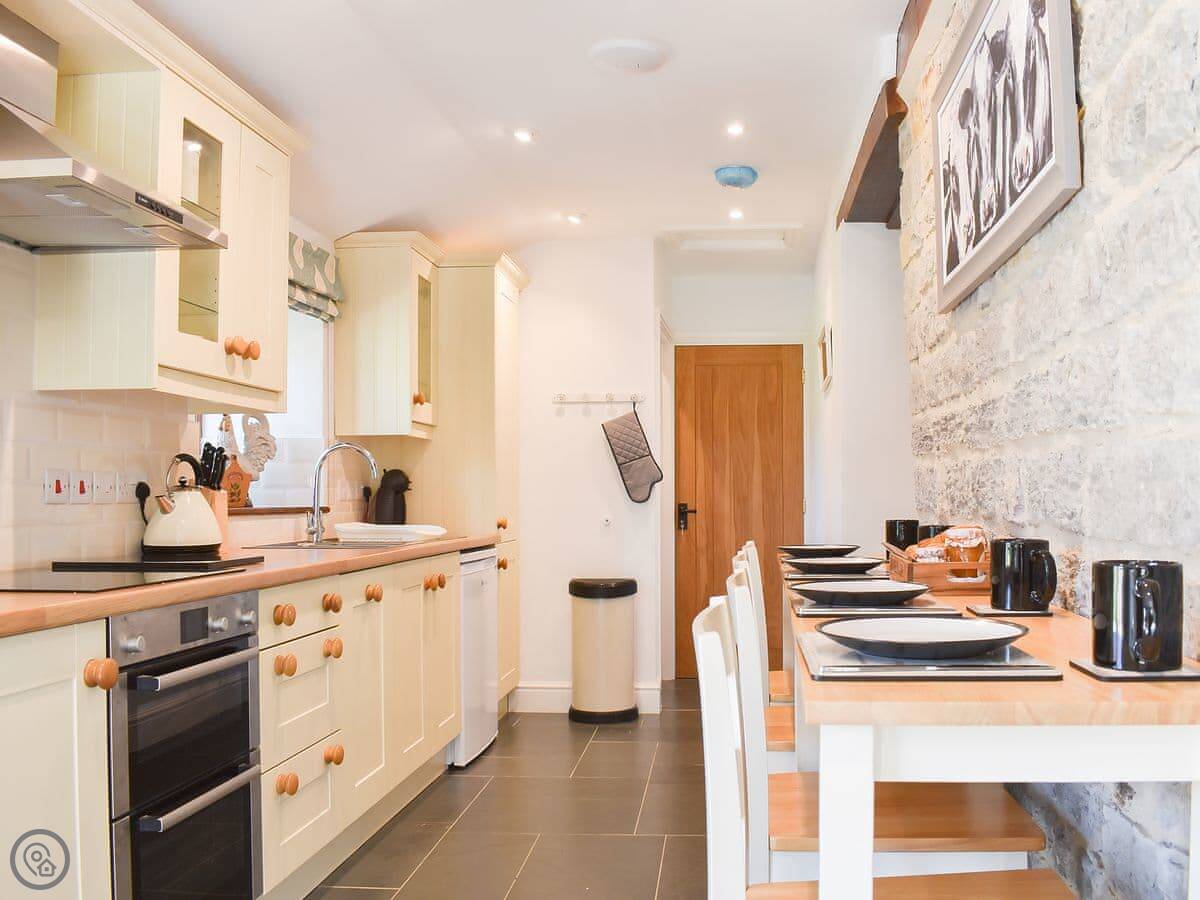 The kitchen is in the middle. It’s got a breakfast bar and a dishwasher. Underfloor heating throughout, so it’s warm even in winter. French doors open onto your own patio and a bit of lawn.