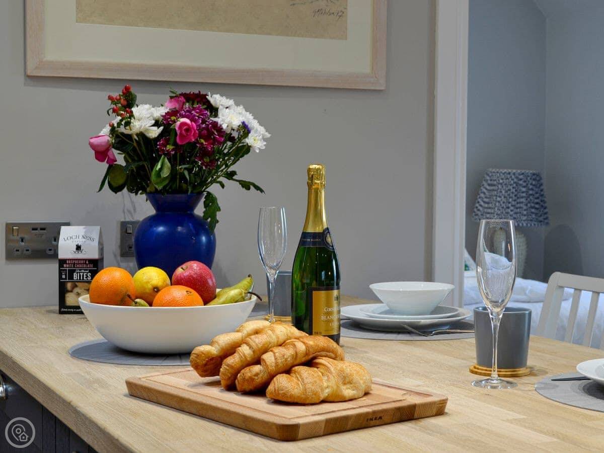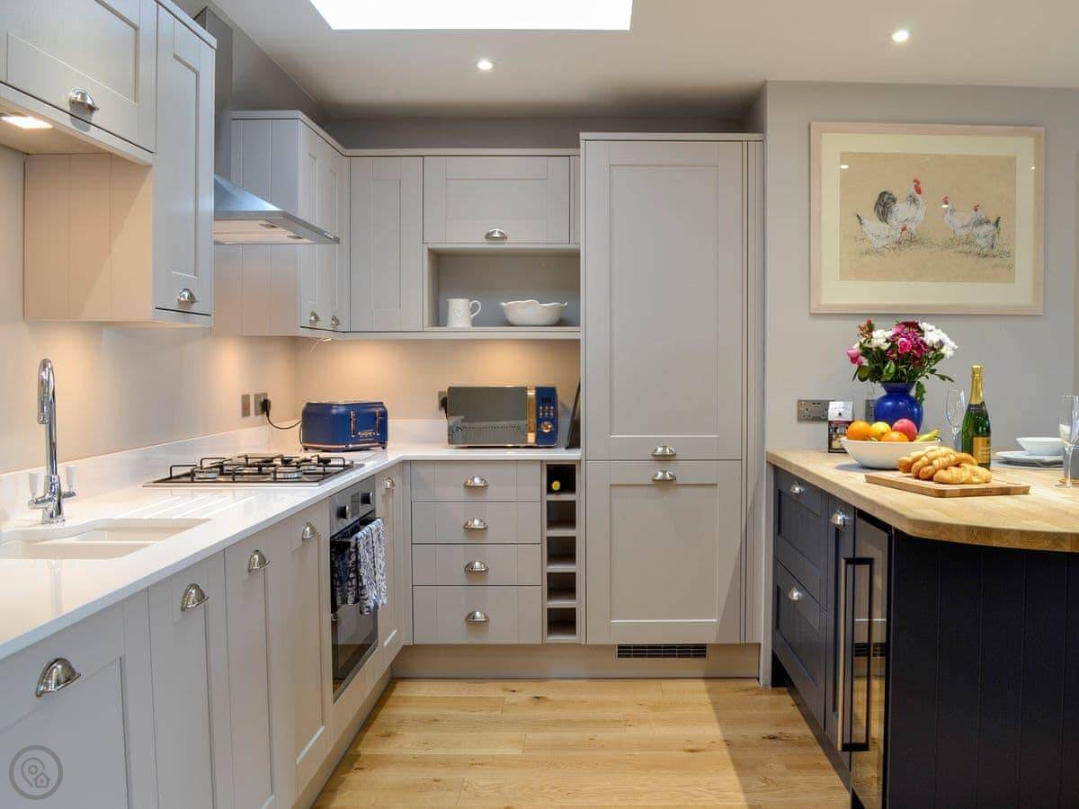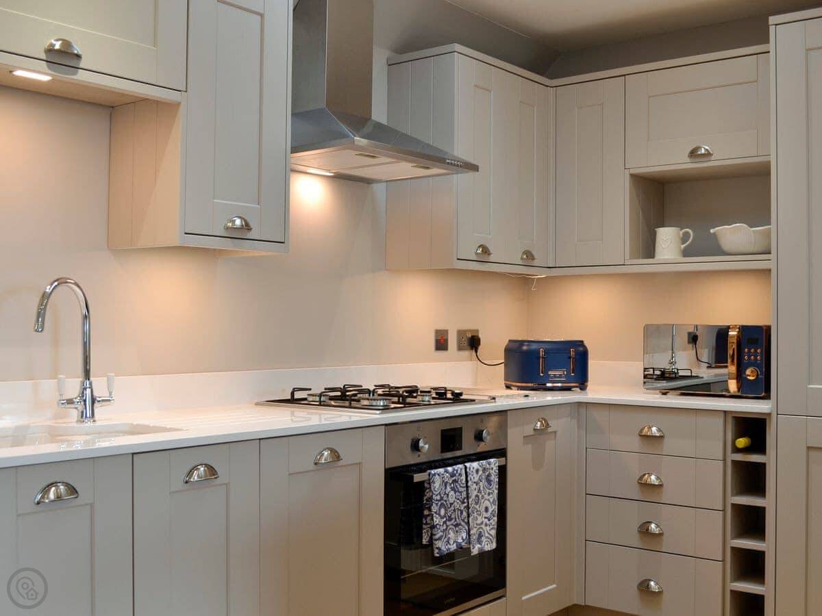 The kitchen is open plan with the living area. It's got most things you'd need: a dishwasher, washing machine, and the WiFi is included. You'll see our garden from the patio doors. Parking is right outside.