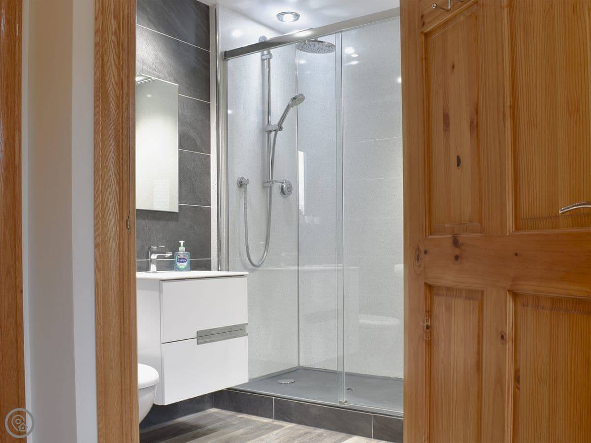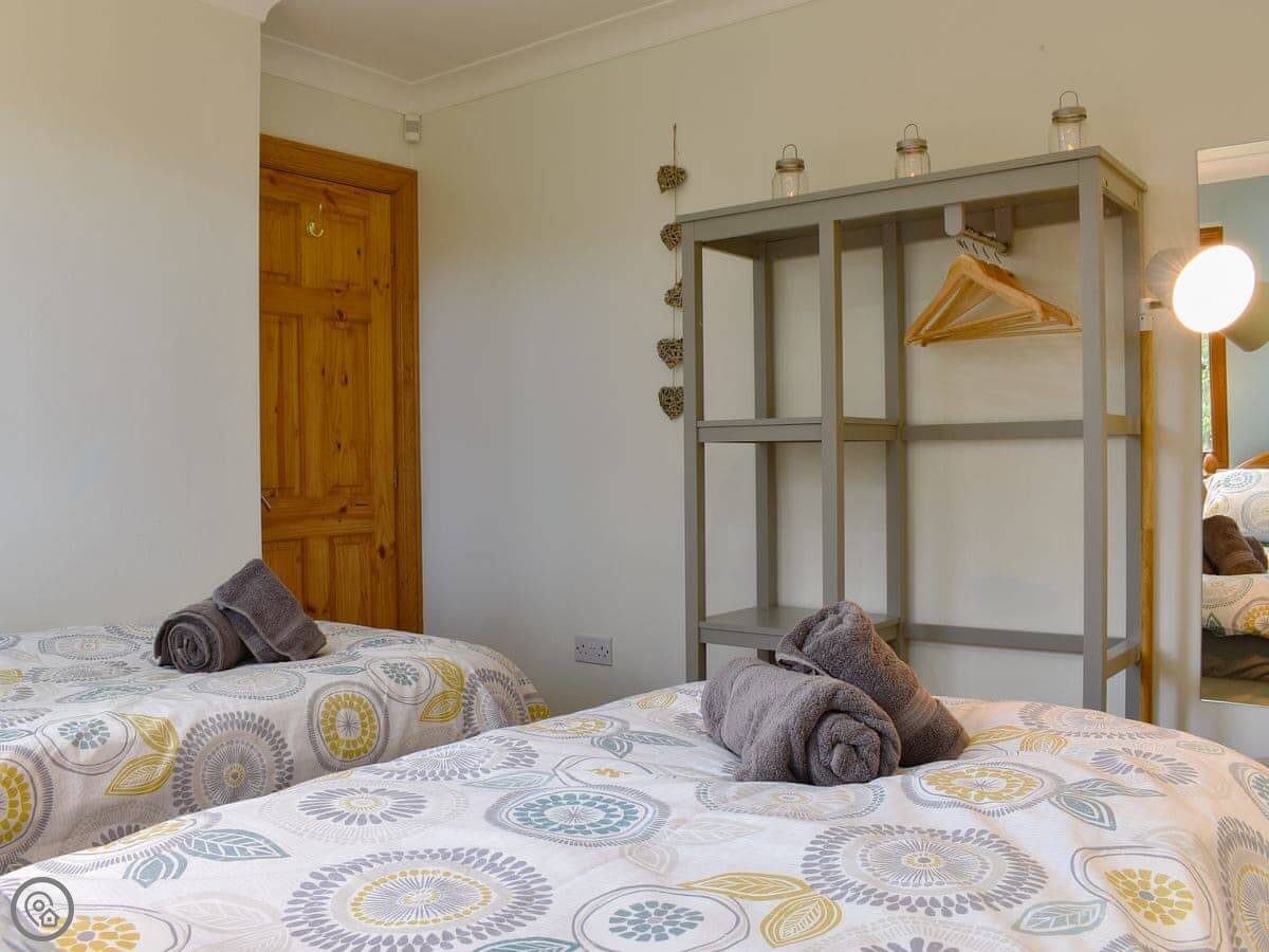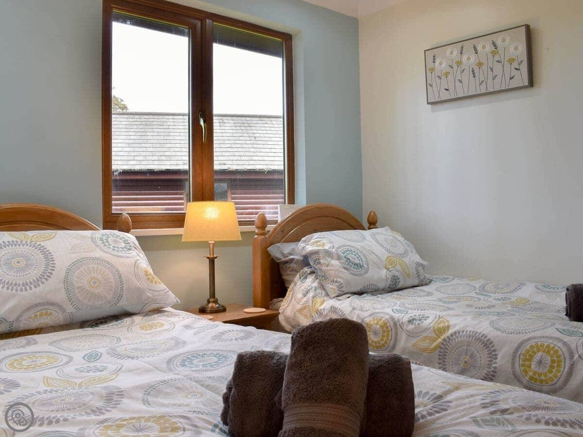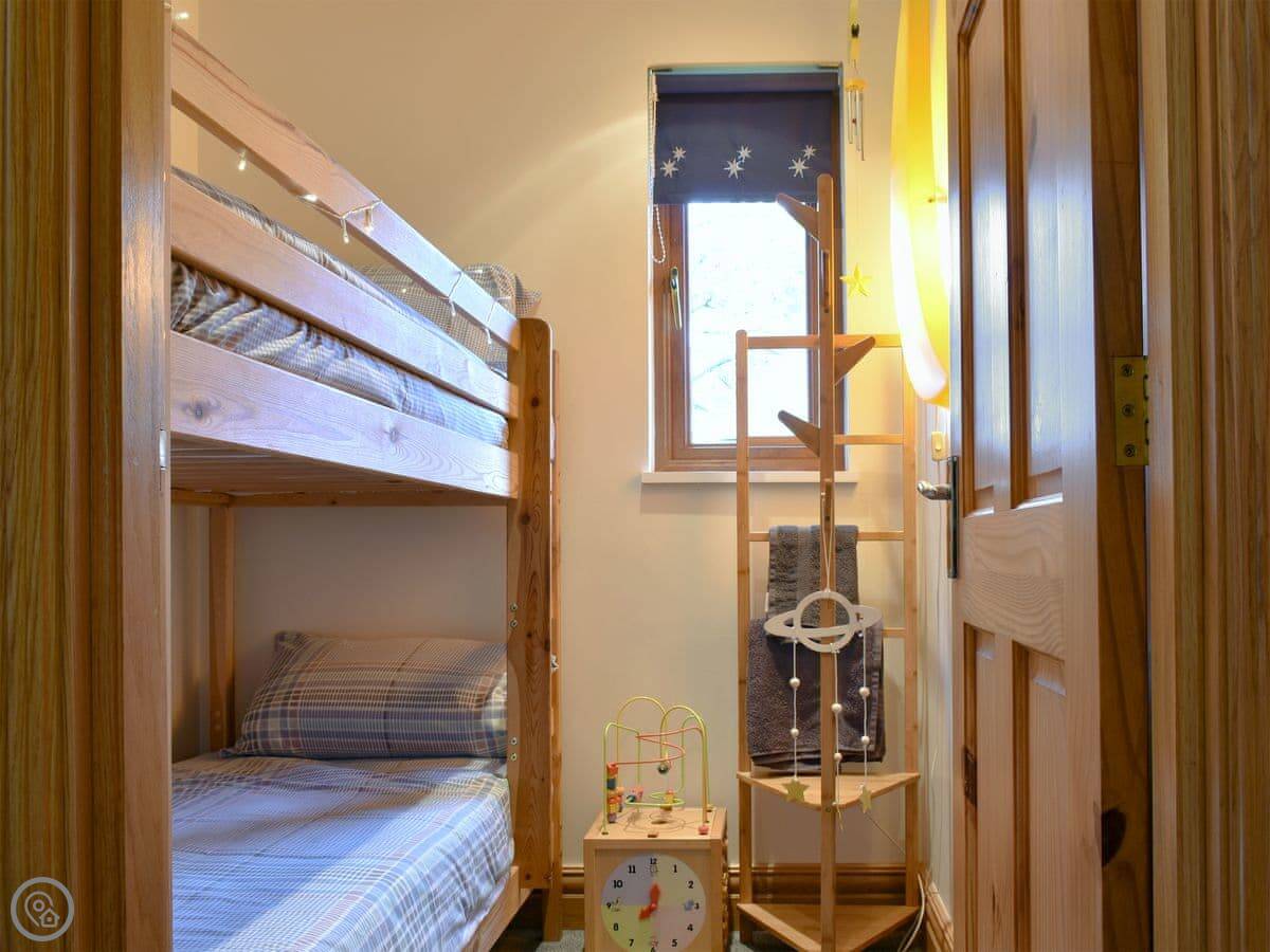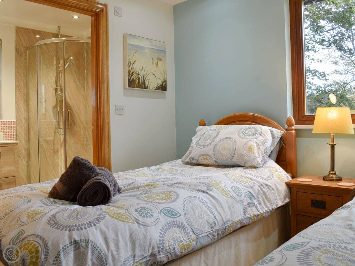 It sleeps four. There are three bedrooms: a double, a twin, and a bunk room for kids. Two bathrooms, both are shower rooms. It's all on one level and there's a ramp to the side door, so it's accessible. The stairs thing doesn't apply here, it's flat inside.