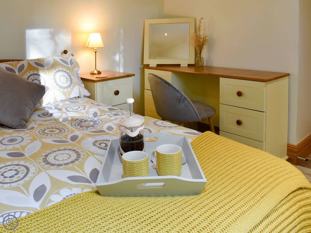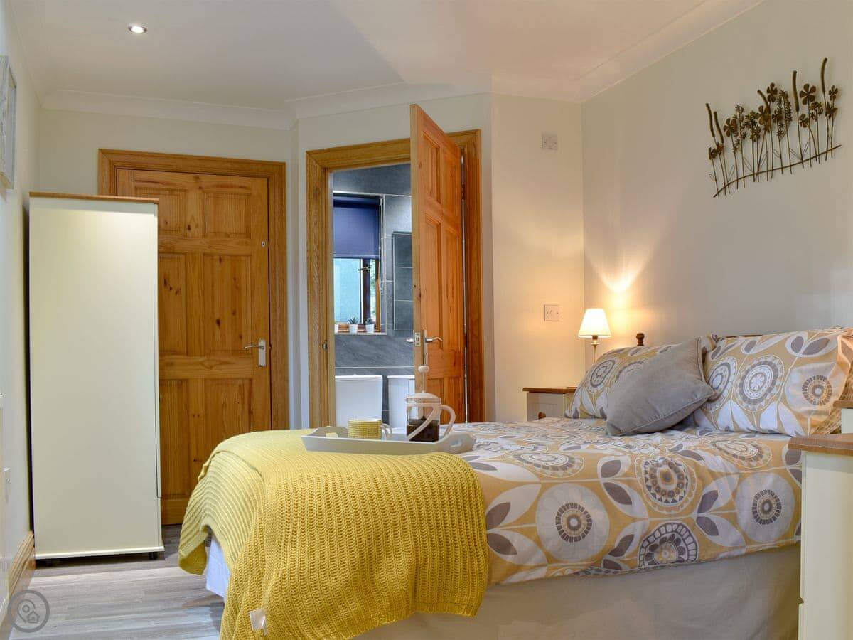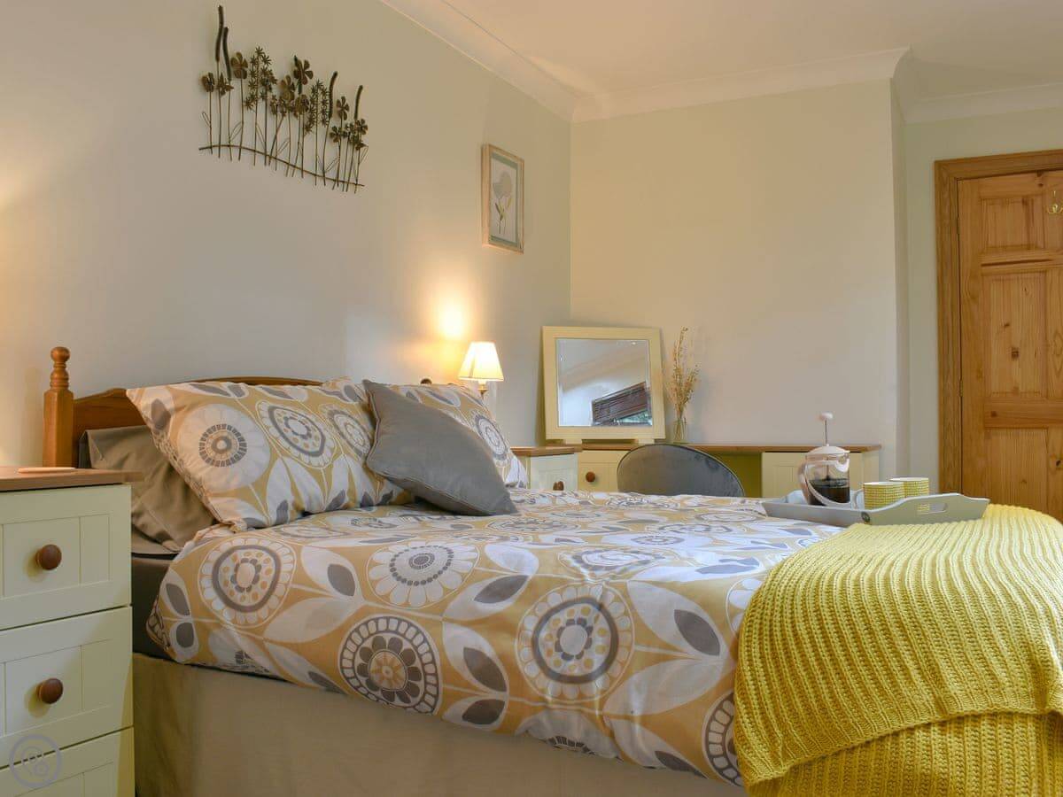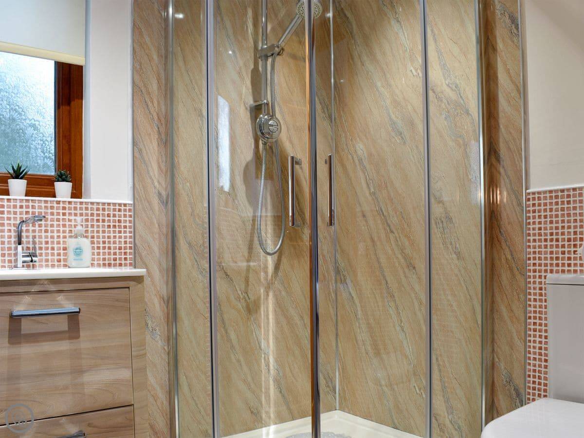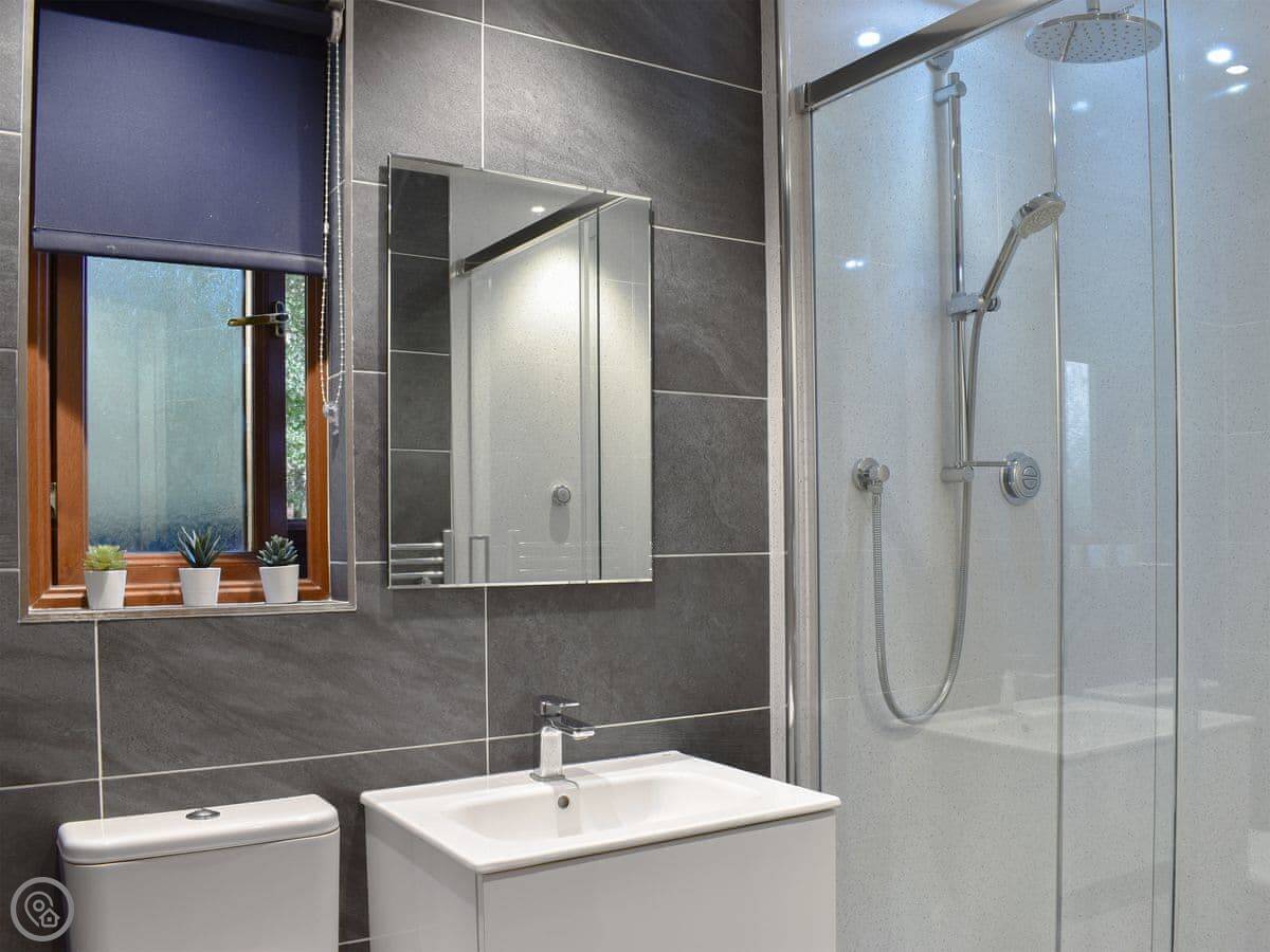 It sleeps four. There are three bedrooms: a double, a twin, and a bunk room for kids. Two bathrooms, both are shower rooms. It's all on one level and there's a ramp to the side door, so it's accessible. The stairs thing doesn't apply here, it's flat inside.