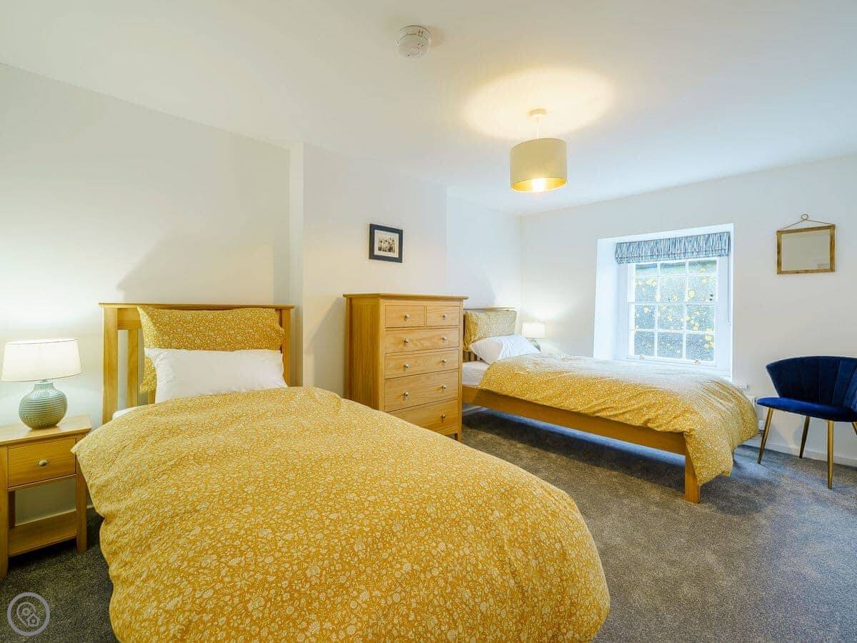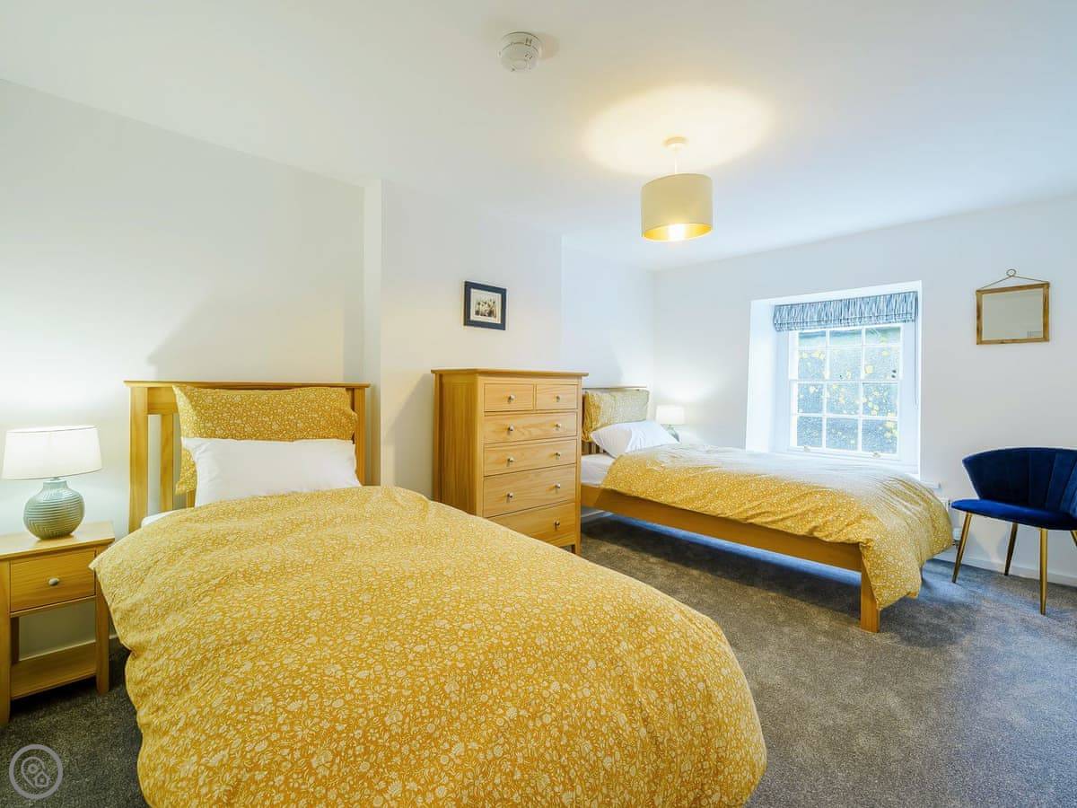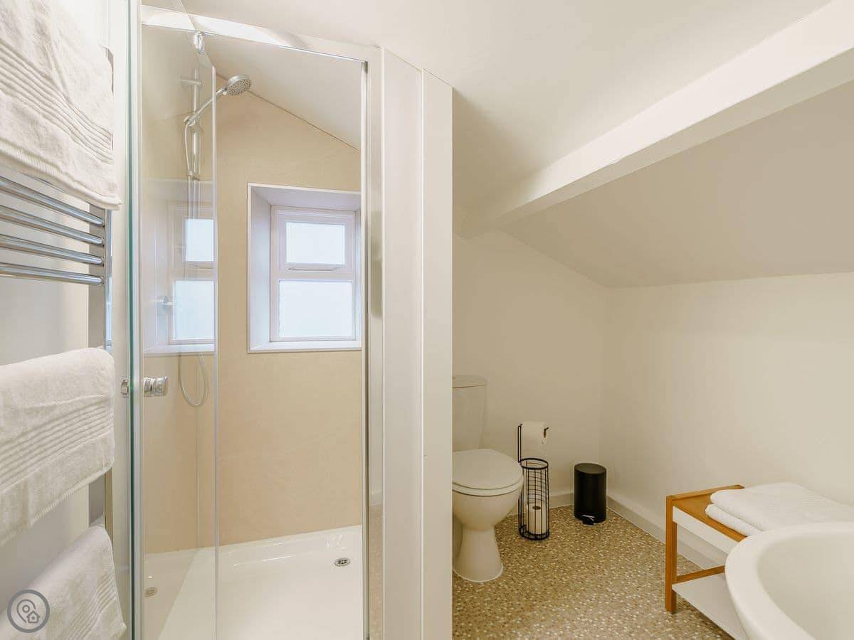 It sleeps four. Two bedrooms upstairs and one bathroom with a shower. It's a 4 Star place, which means it's comfortable and has everything you need. It's a proper old cottage though, so mind your head on the shower room doorframe. The stairs are typical for a place like this too.