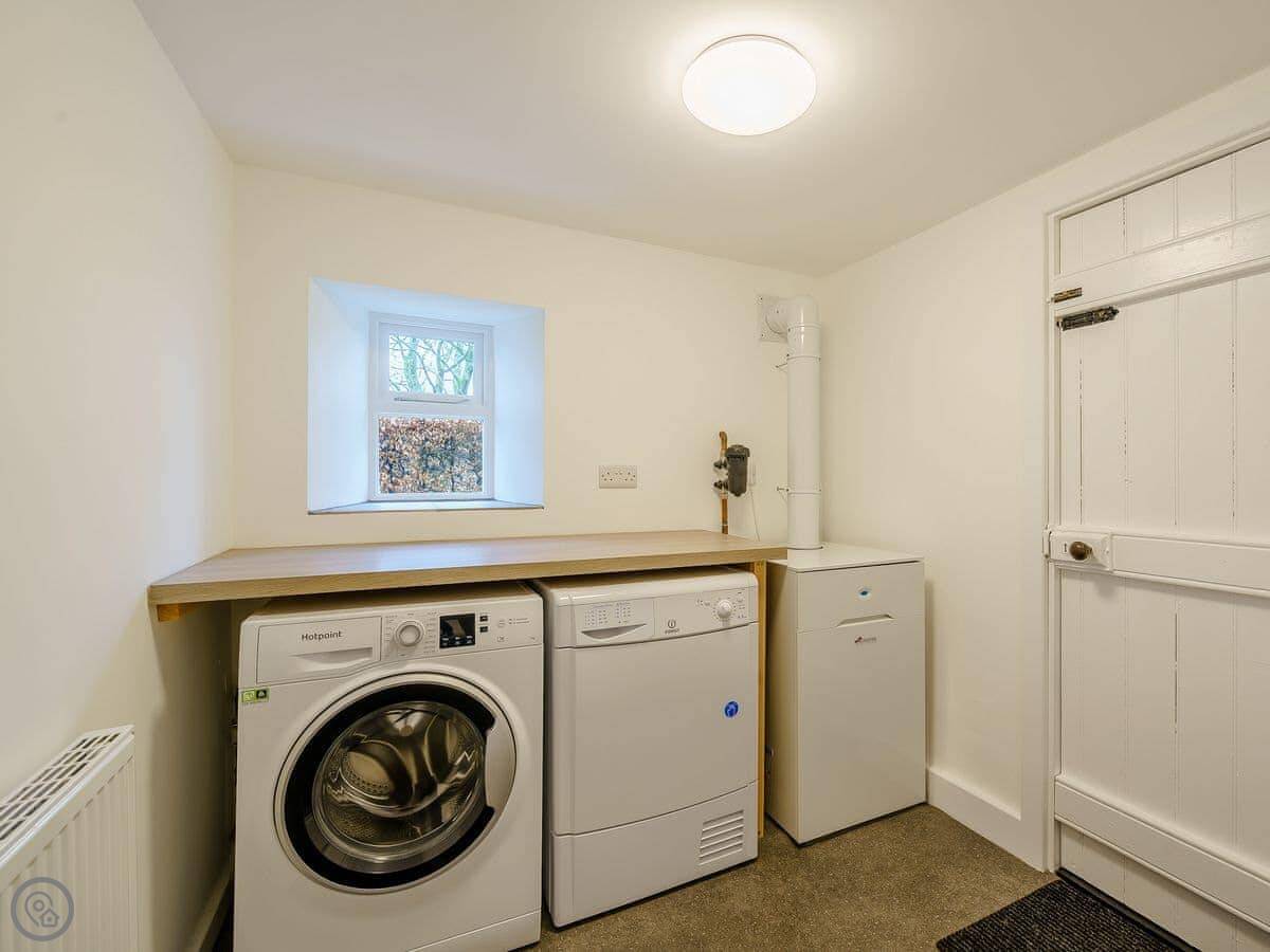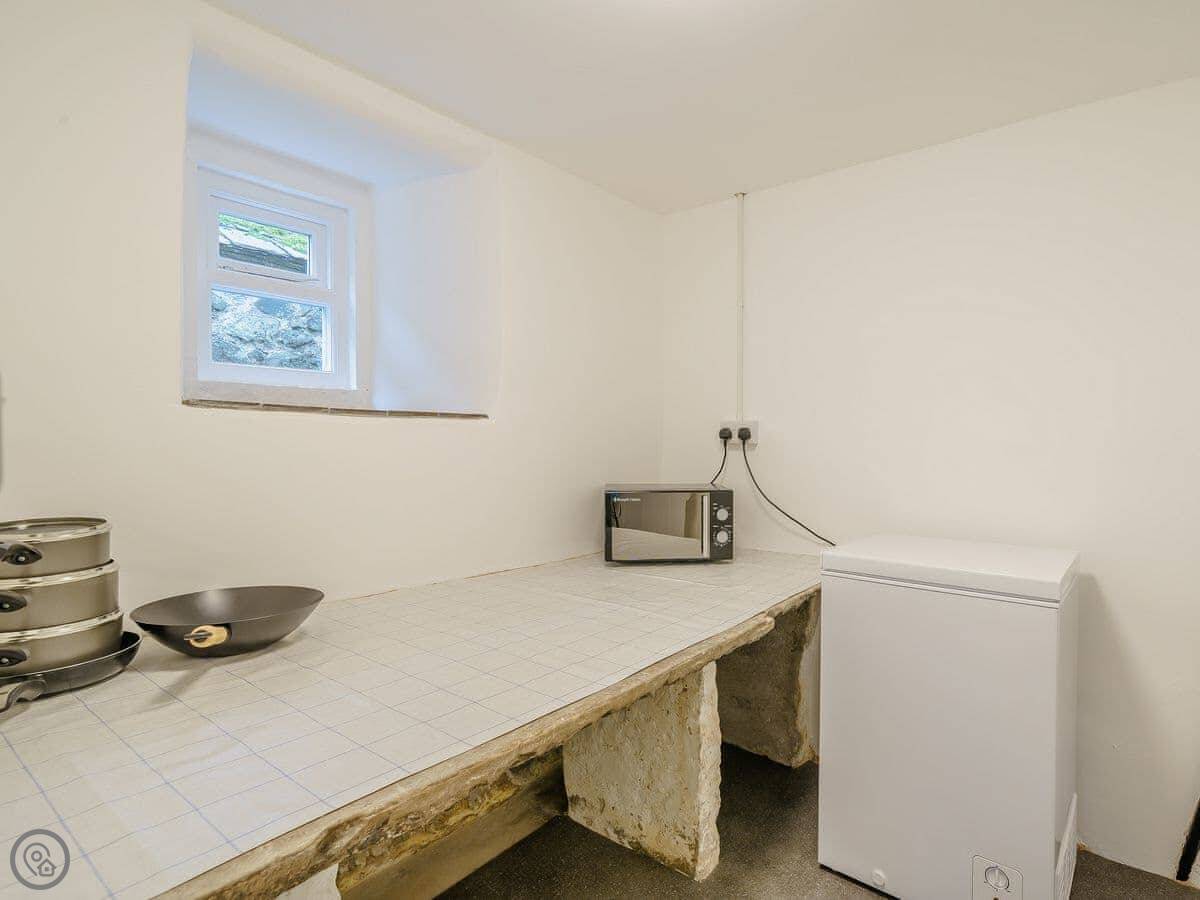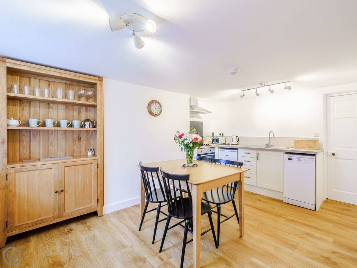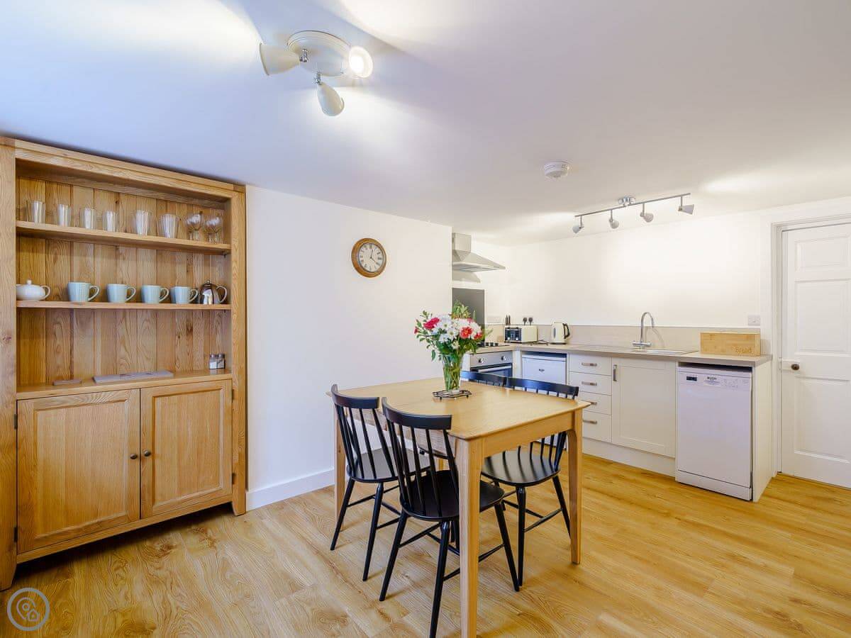 Inside, there's an open plan kitchen and dining area with a view over the fields. The living room has a wood burner. We provide the first lot of logs. There's a utility room and a separate storage room by the back door, which people use for bikes.