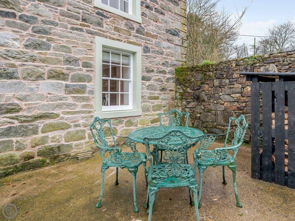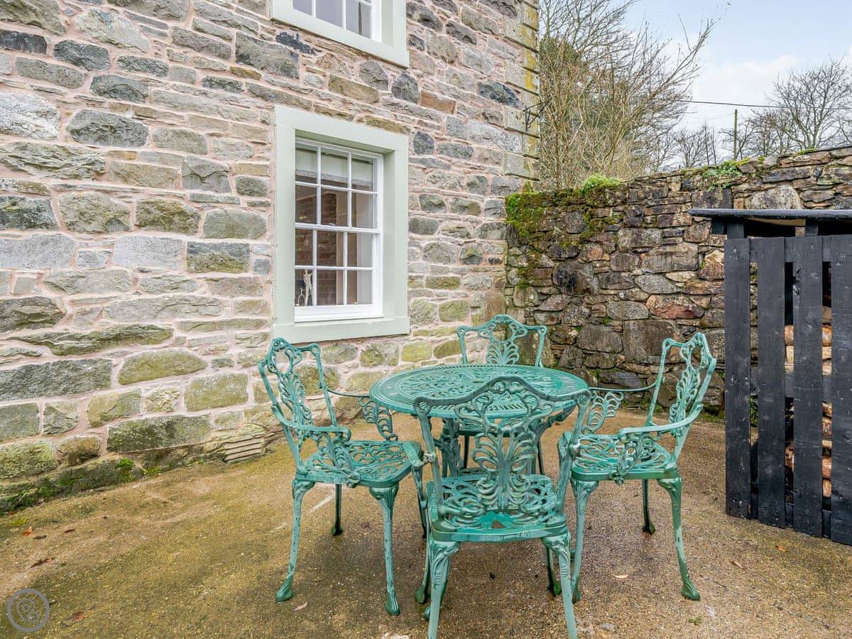 Outside is a paved area with a table and chairs, and a small enclosed garden.