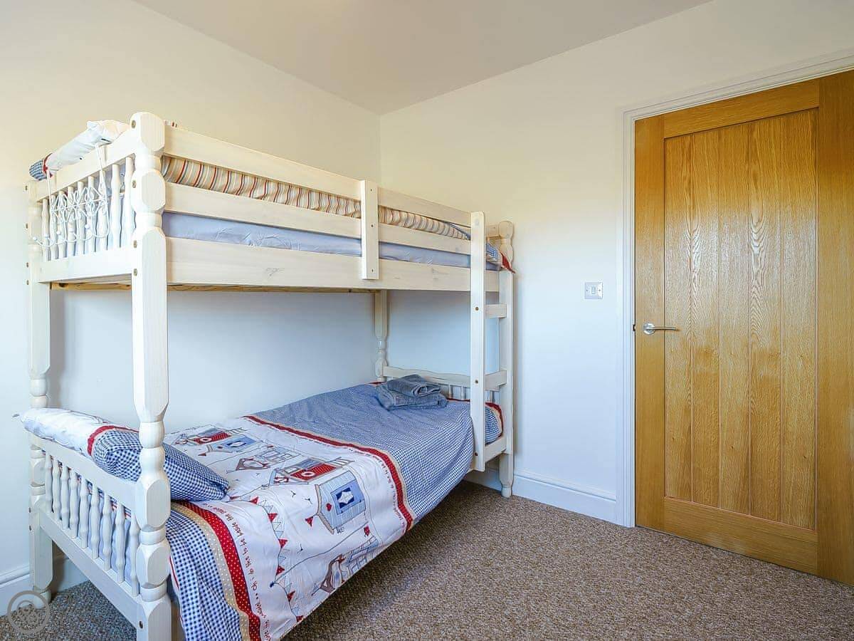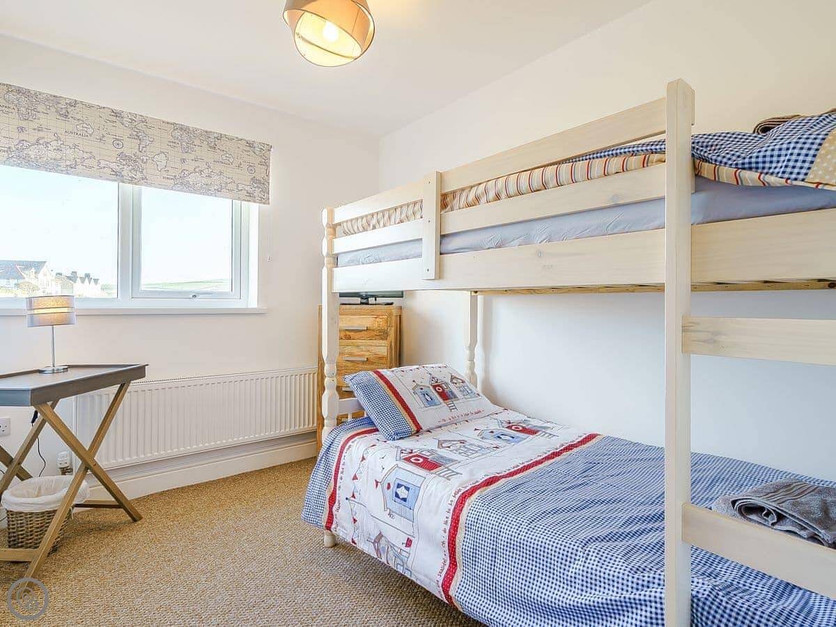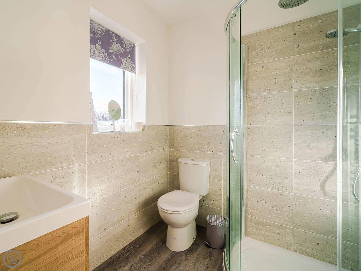 It sleeps six, with three bedrooms and two bathrooms. It's a 4 Star place, so it's comfortable and well-equipped. There's a downstairs loo and shower, and a bathroom upstairs. The garden is enclosed, which is handy.