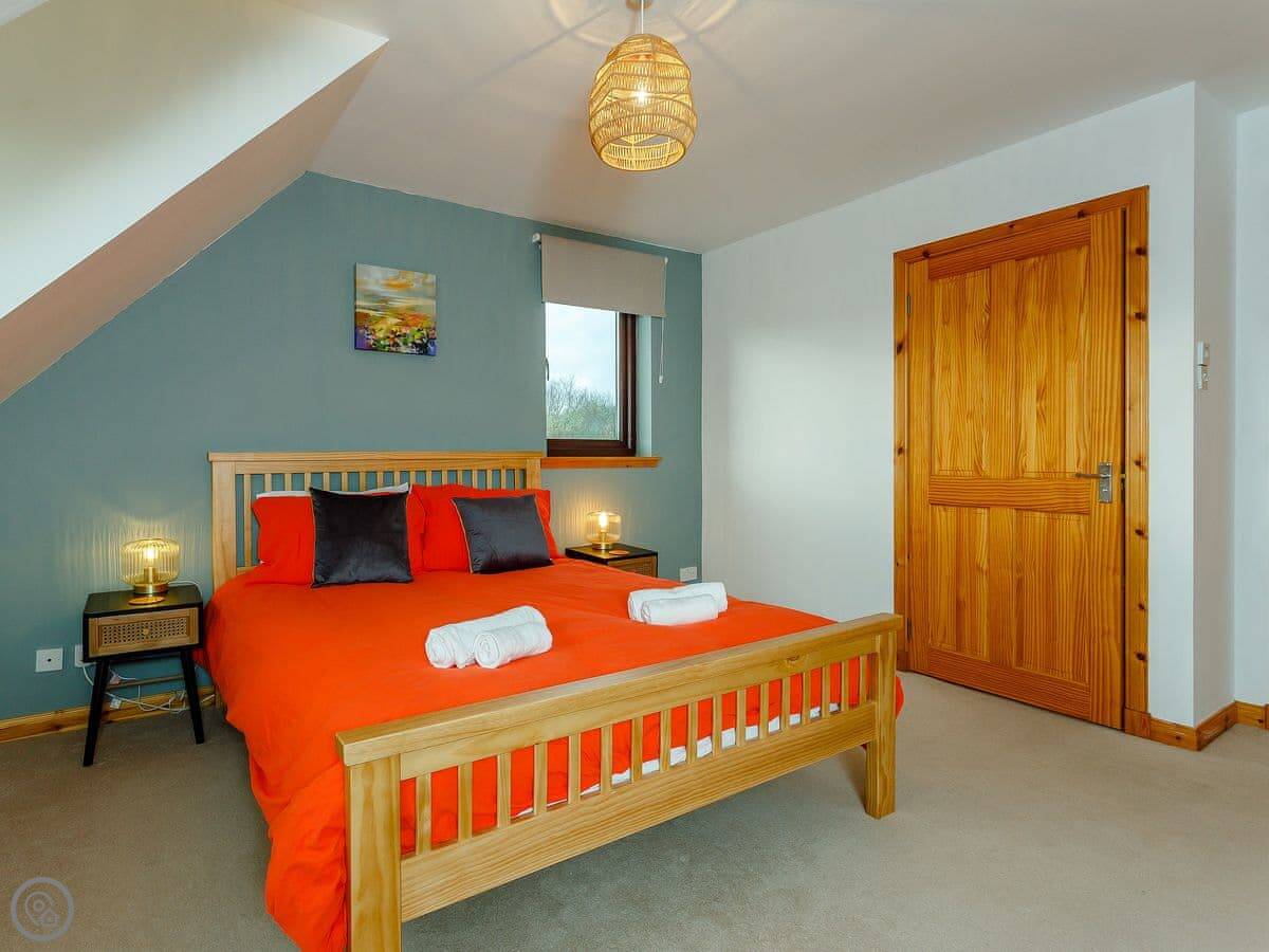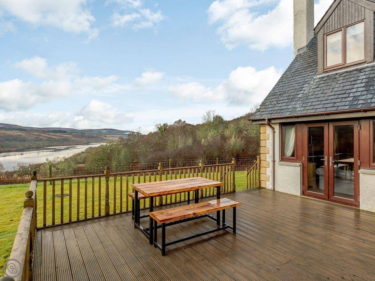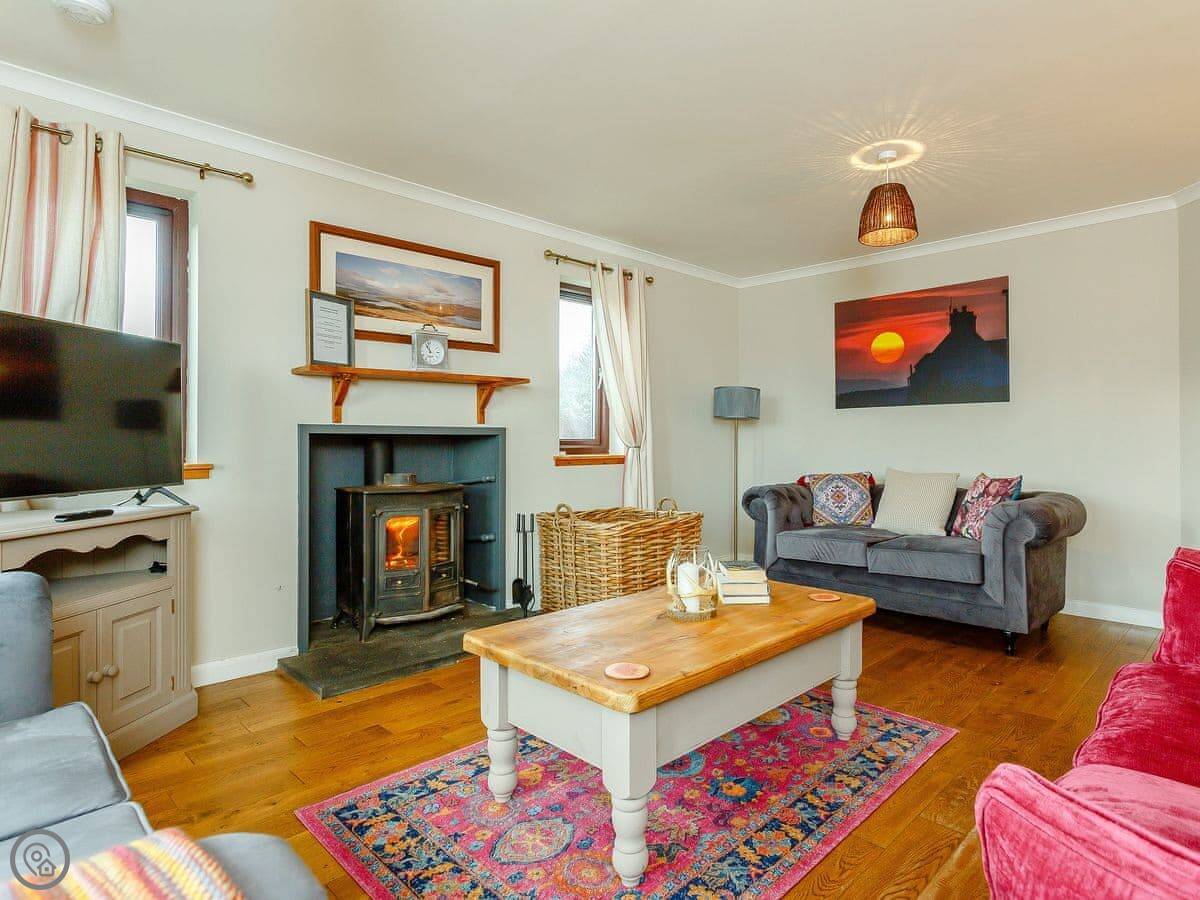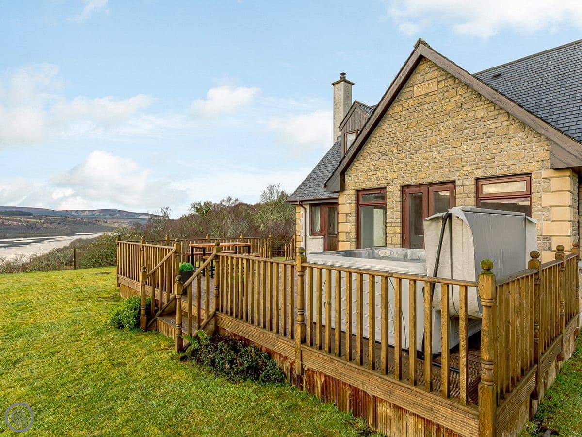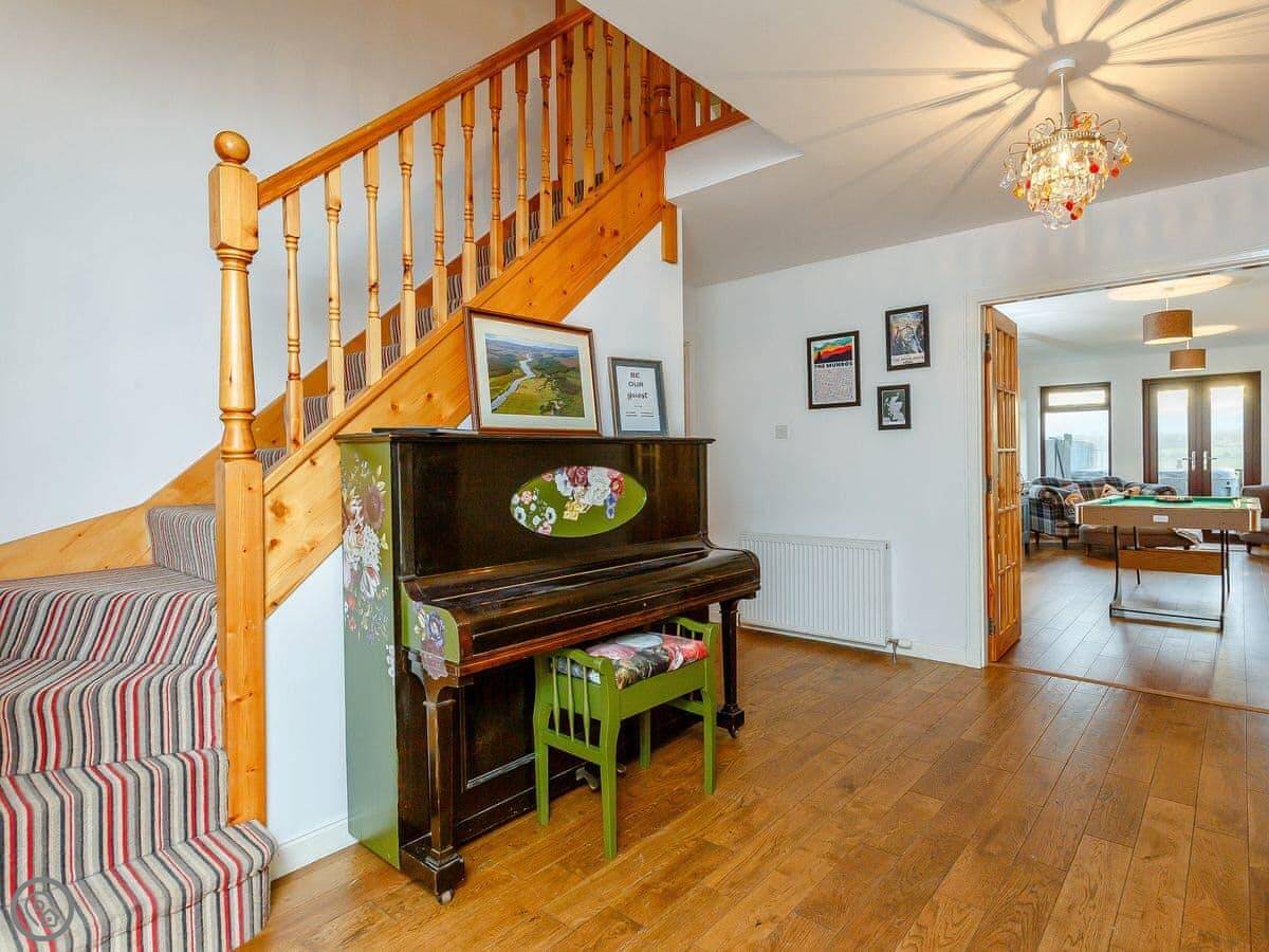 It sleeps eight people. Four bedrooms, three bathrooms. It's got a 5 Star rating, which means it's well-equipped and comfortable. The entrance hall is two stories high and has a piano in it, which is a bit unusual. There's a proper wood burner in the living room.