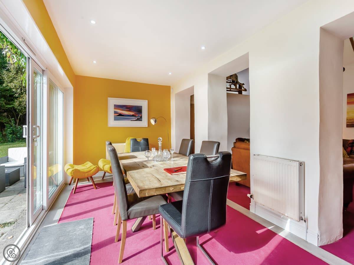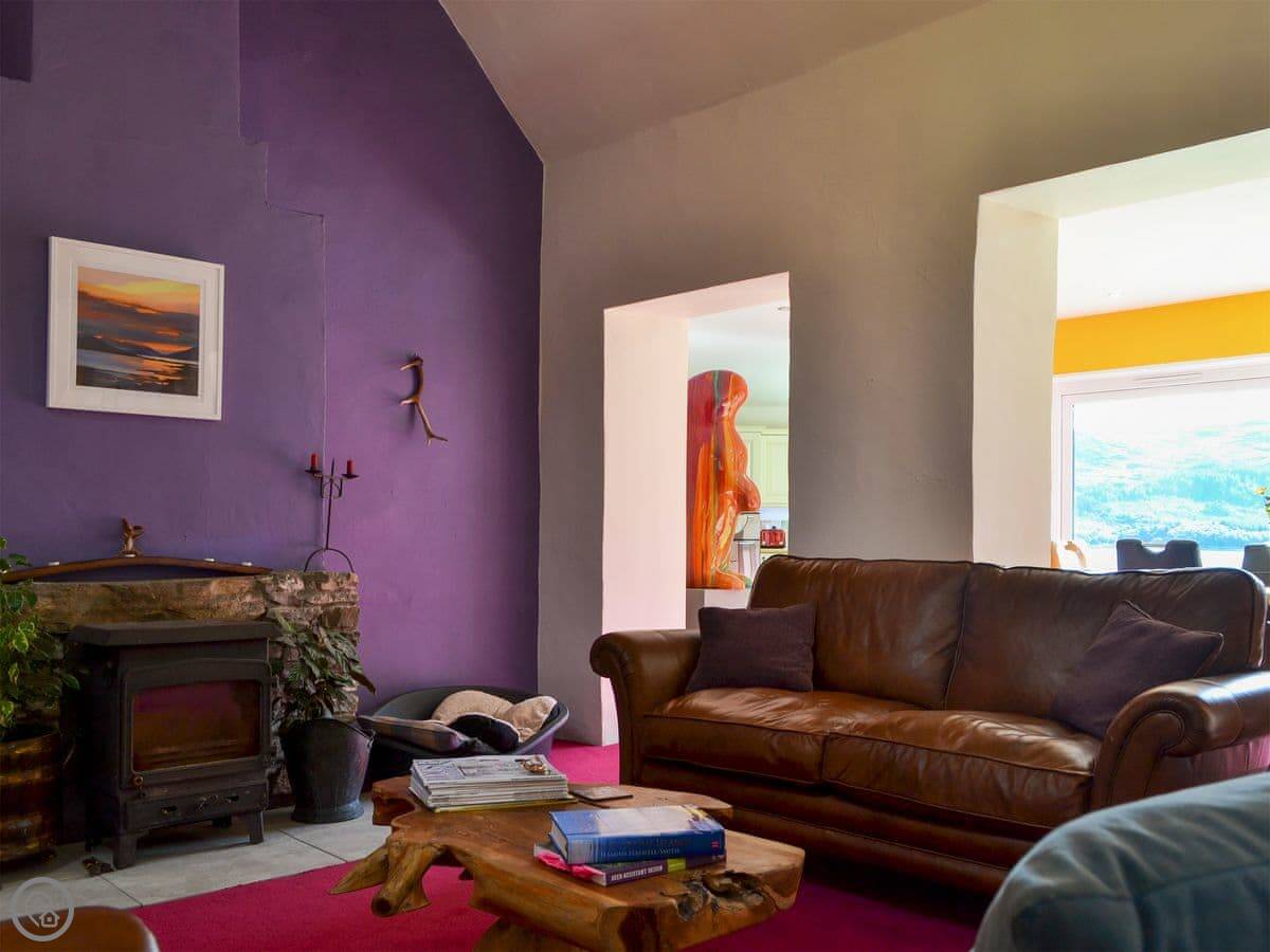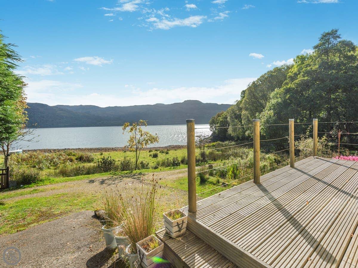 The main room is all open plan. Big windows look straight out over the loch to the mountains. There's a wood burner for the cooler evenings. The kitchen has a large island. Off the kitchen there's a utility room and a separate gym space with a view.