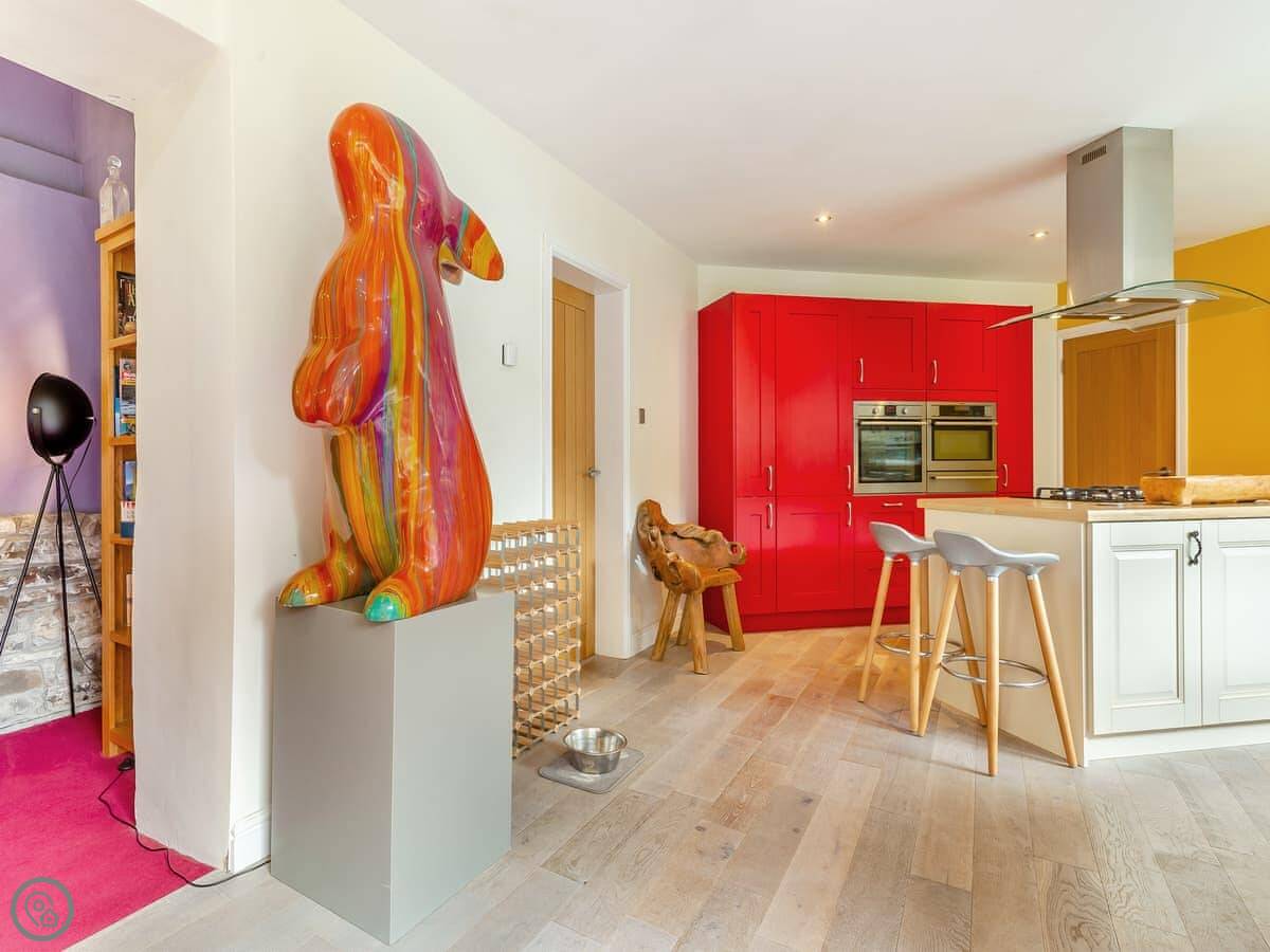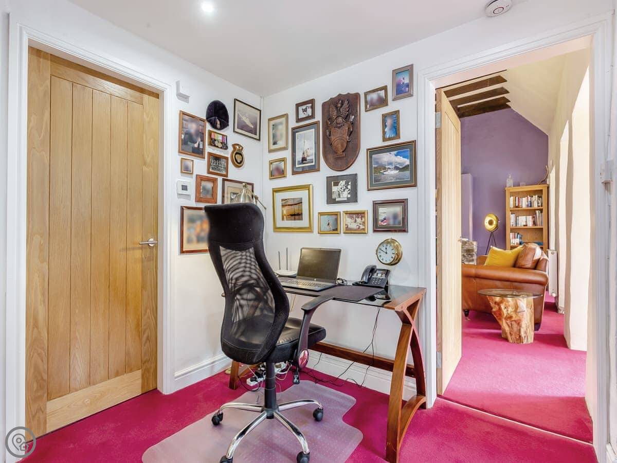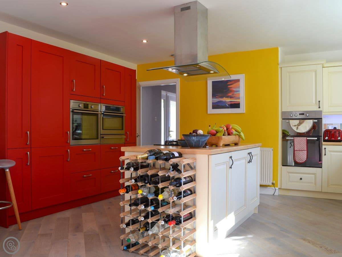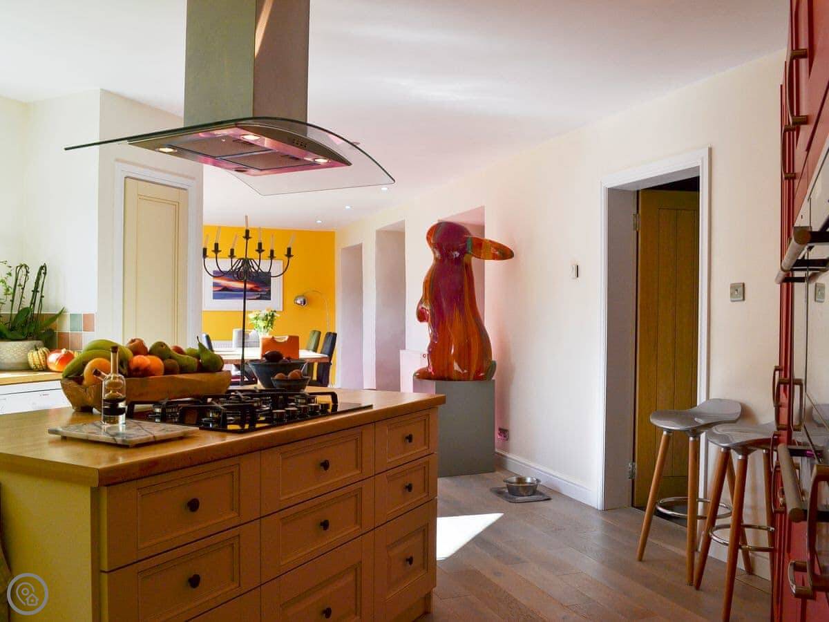 The main room is all open plan. Big windows look straight out over the loch to the mountains. There's a wood burner for the cooler evenings. The kitchen has a large island. Off the kitchen there's a utility room and a separate gym space with a view.