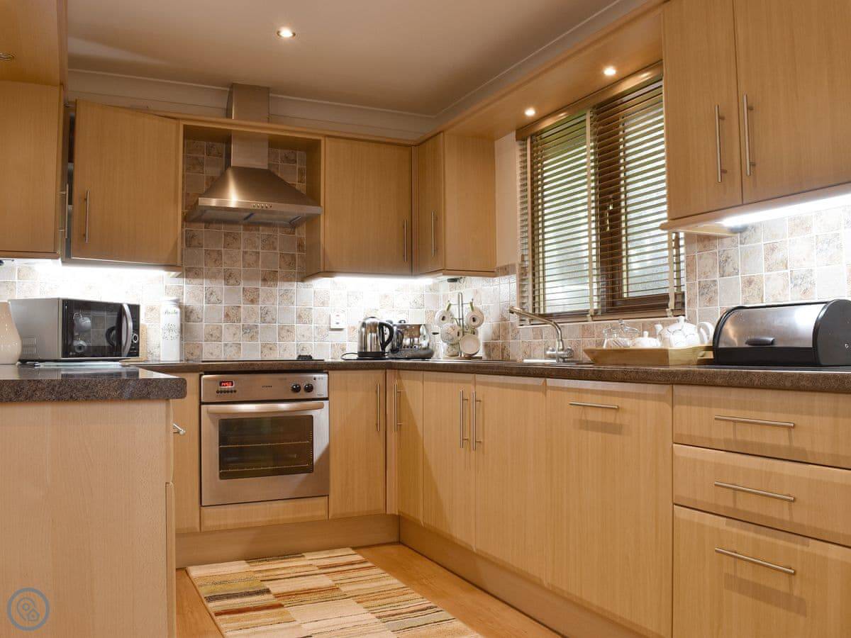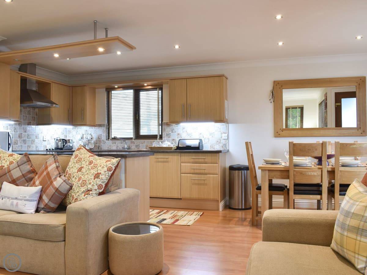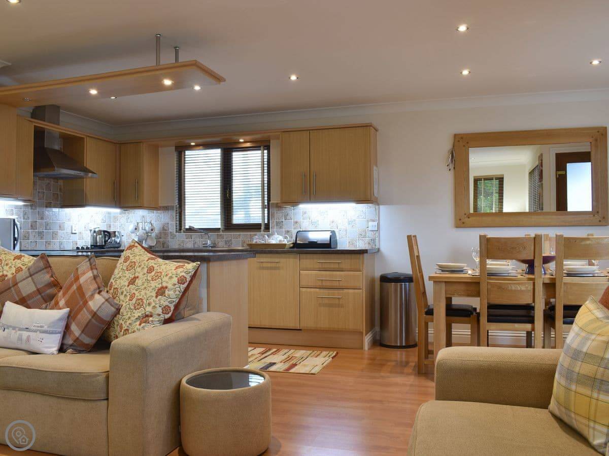 The place is all on one level and the doorways are wide, which is good if you're bringing a wheelchair. There's a patio with a table and chairs. Inside it's open plan, so it feels quite spacious. The kitchen has a dishwasher and a washing machine.