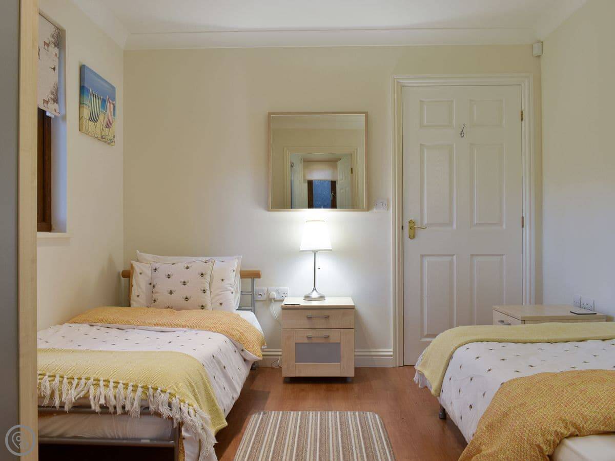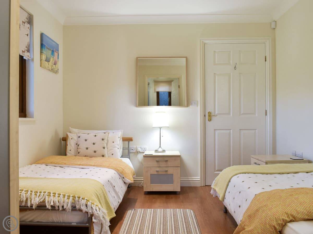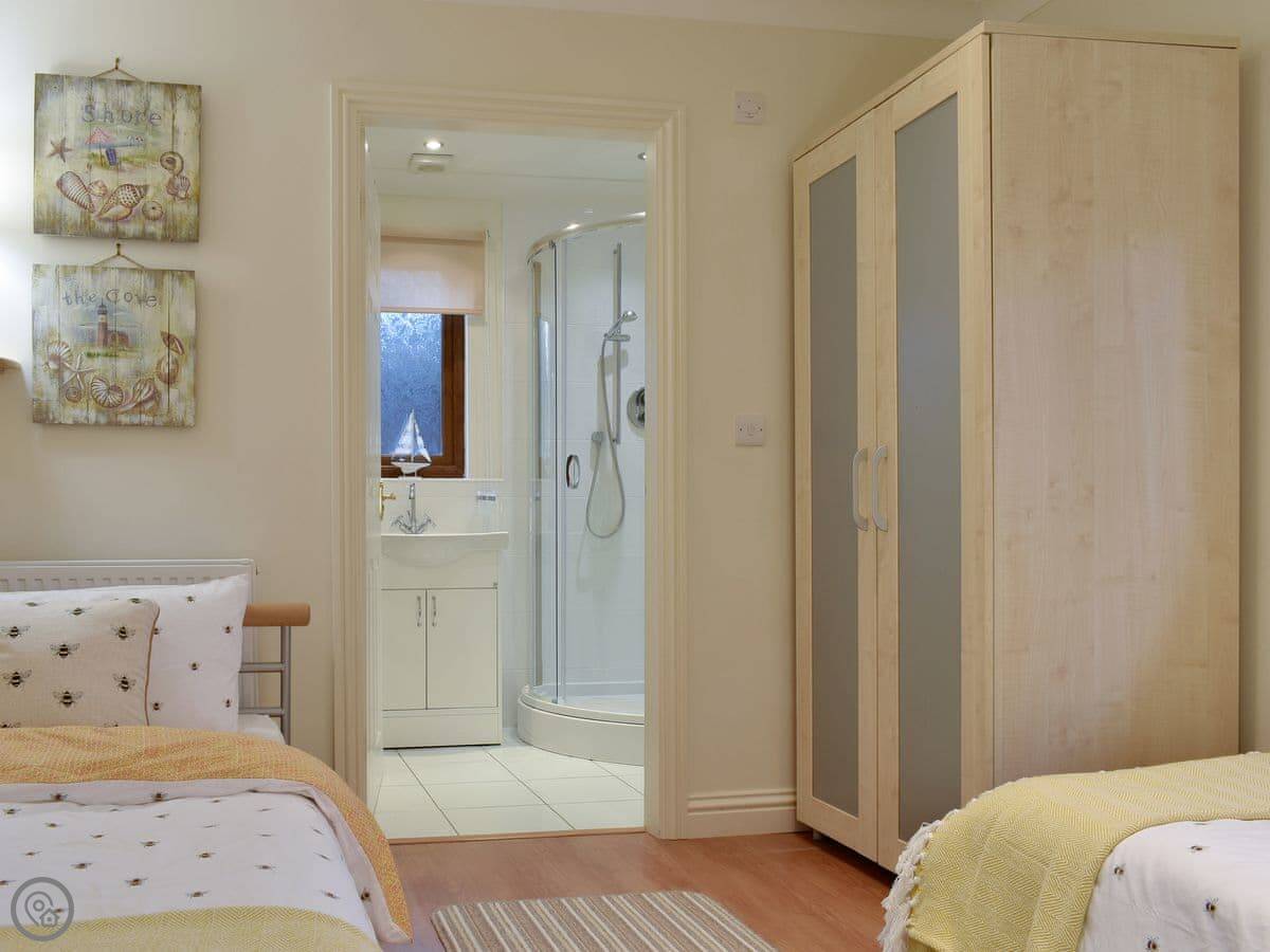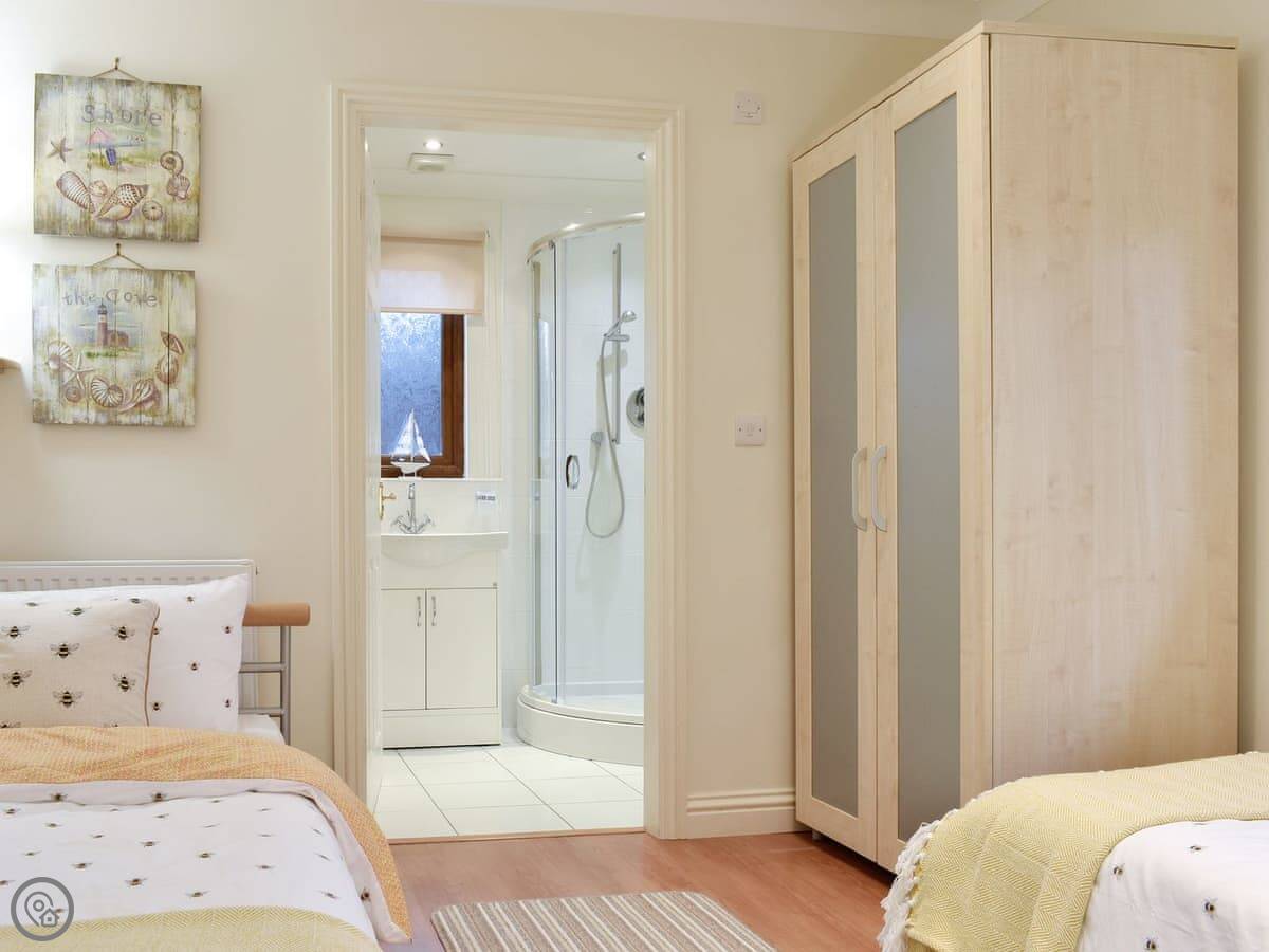 It sleeps four, in two bedrooms. Both bedrooms have their own en-suite shower room, which is handy. There's also a sofa bed in the living area if you need it. It's got a 4 Star rating, so it's comfortable and well-equipped.