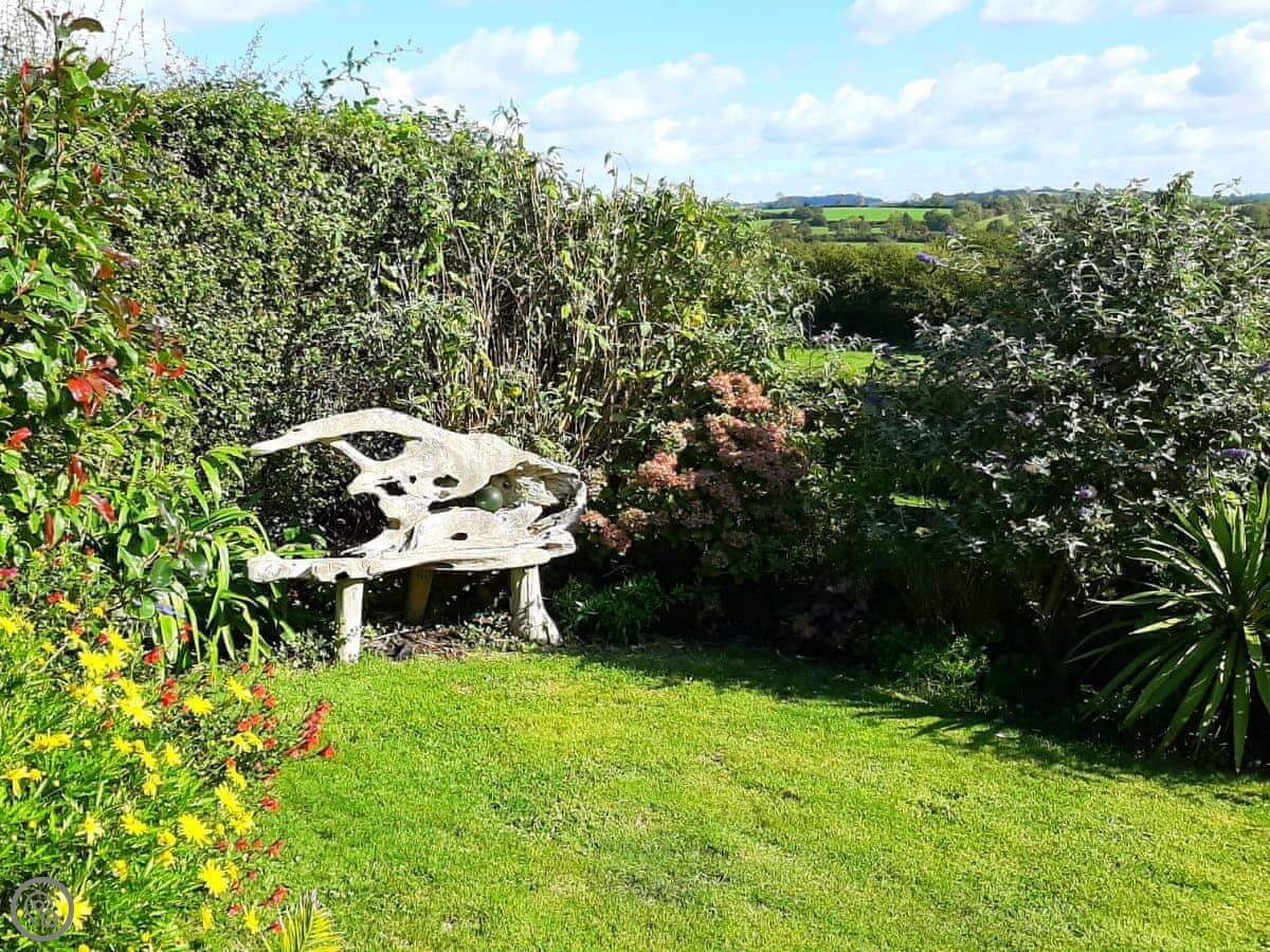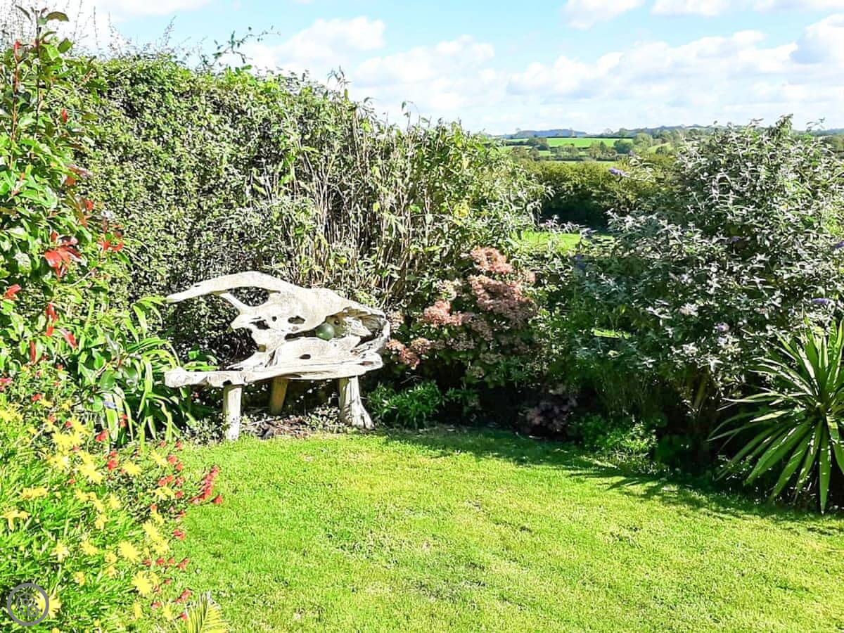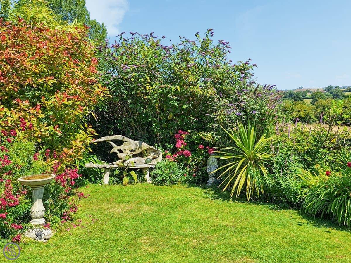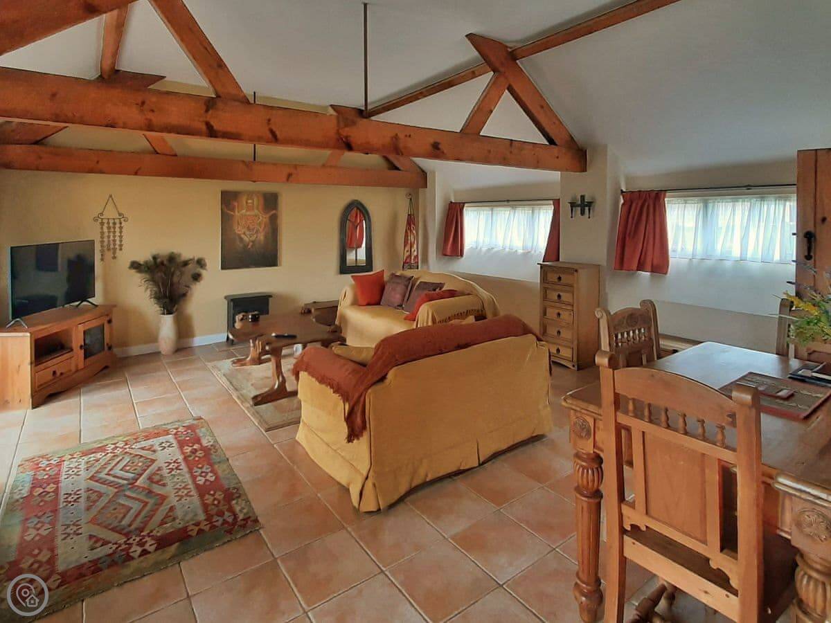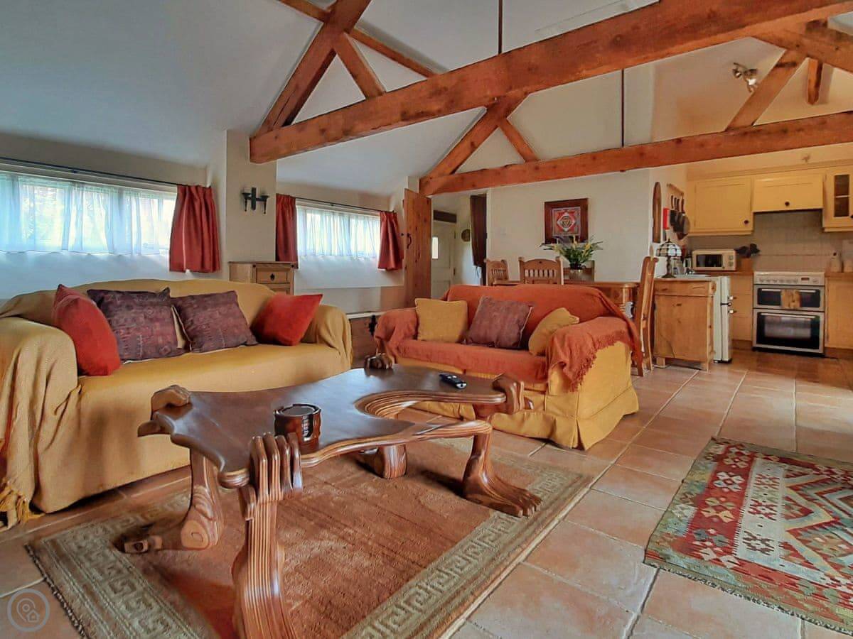 As you enter through the stable door, the hallway leads to a large open plan kitchen and living space which is colourful and comfortably furnished with two sofas, one of which is a double sofa bed There is also a 38" Smart TV, and a dining table. A high ceiling and exposed beams give a bright and spacious feel, with cosy sofas to curl up on after a long day of exploring. The well-equipped kitchen ensures you have everything you need if you fancy some home cooking, the shower room is also on this level, there is one step up from the hallway leading to the inviting double bedroom which has a lovely view out over the garden. From the living area, there is a peaceful rear, an enclosed terrace and a small lawn, with beautiful views across the valley, a haven for birds and butterflies.