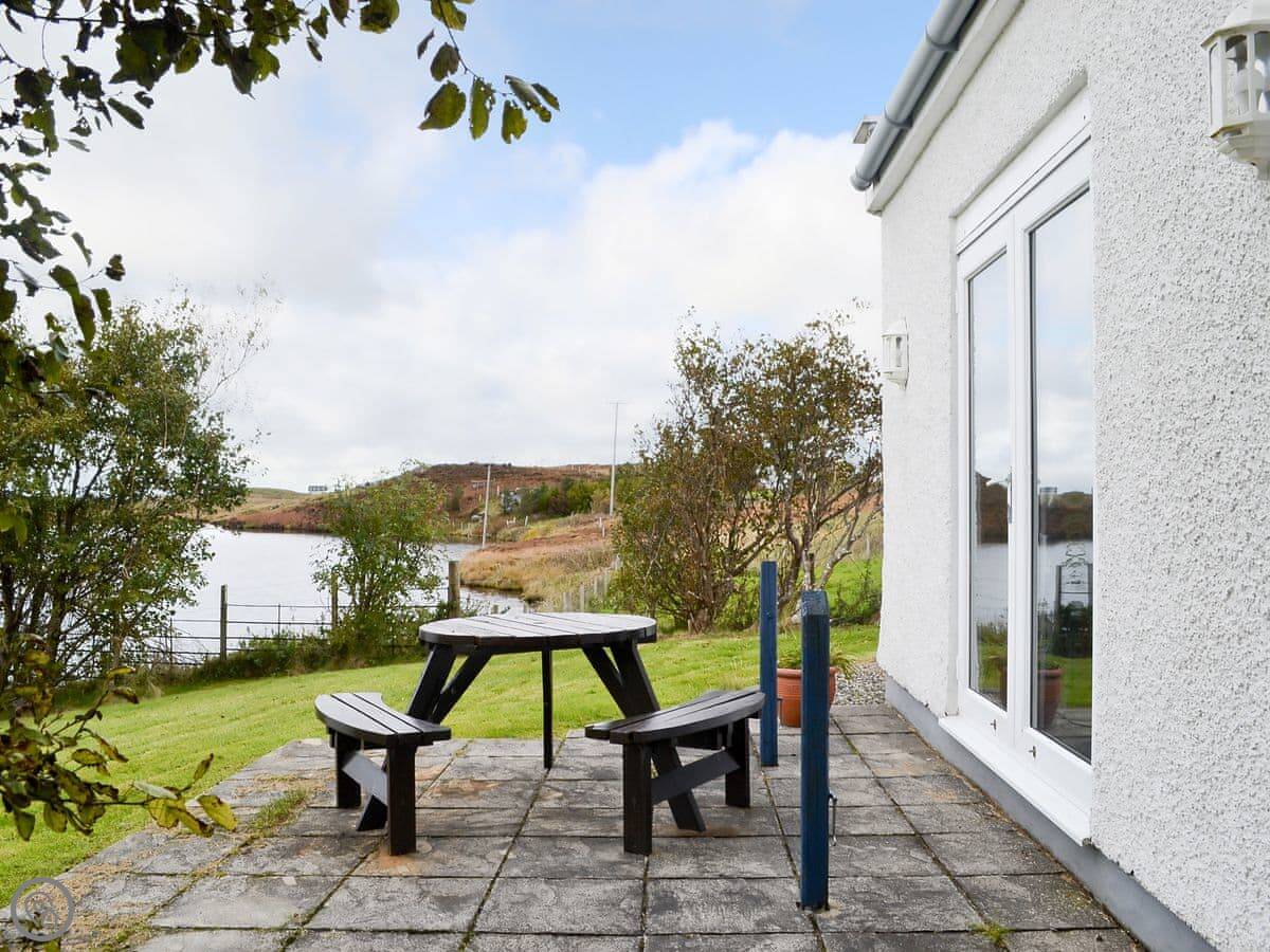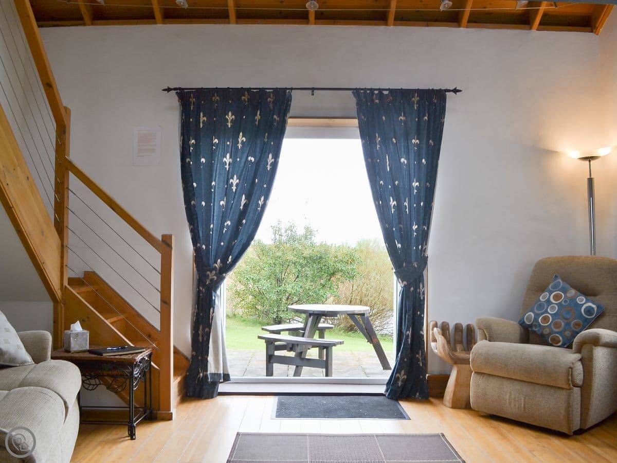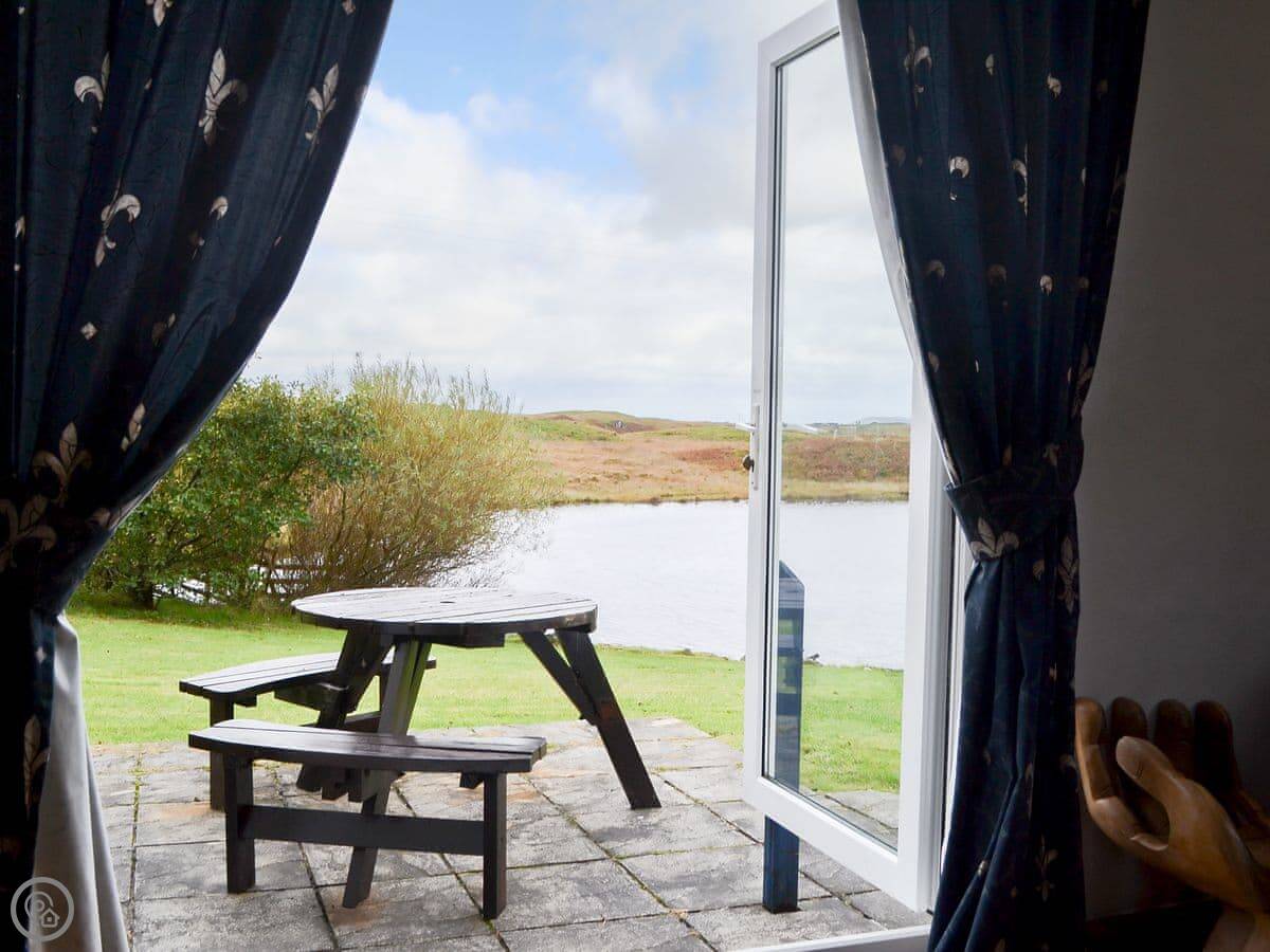 It sleeps two, maybe three if one's a child. There's one bathroom with a shower downstairs. The living area is all open-plan with French doors to a patio. You get the patio to yourself. It's a good spot to sit and watch the loch.