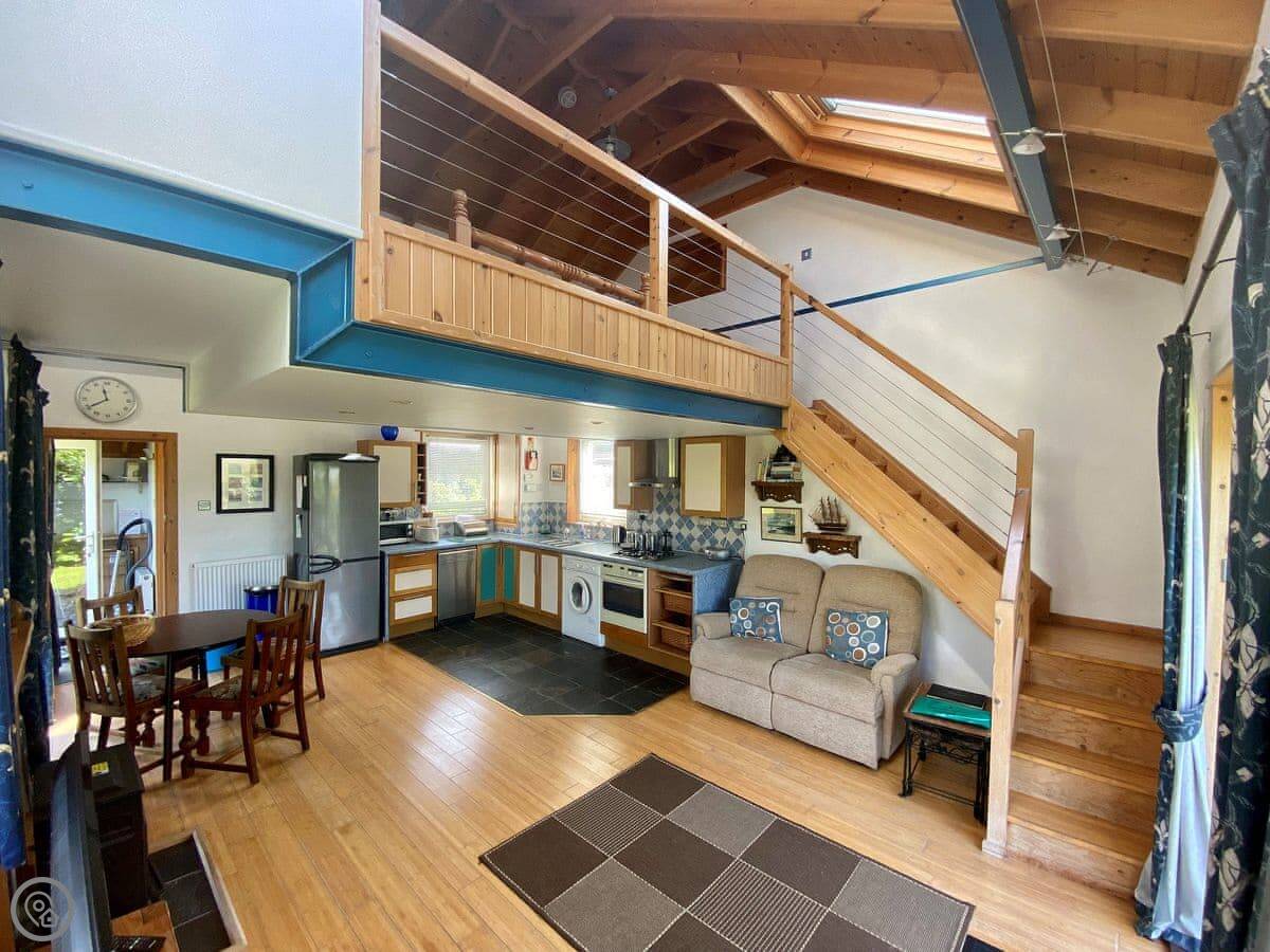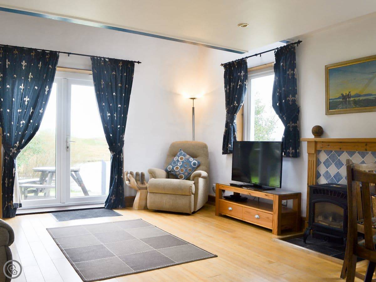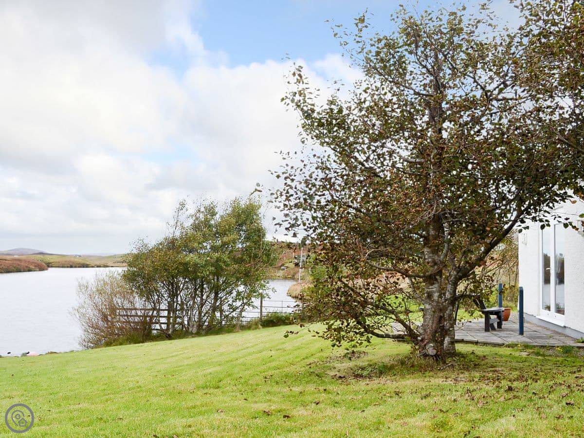 It sleeps two, maybe three if one's a child. There's one bathroom with a shower downstairs. The living area is all open-plan with French doors to a patio. You get the patio to yourself. It's a good spot to sit and watch the loch.